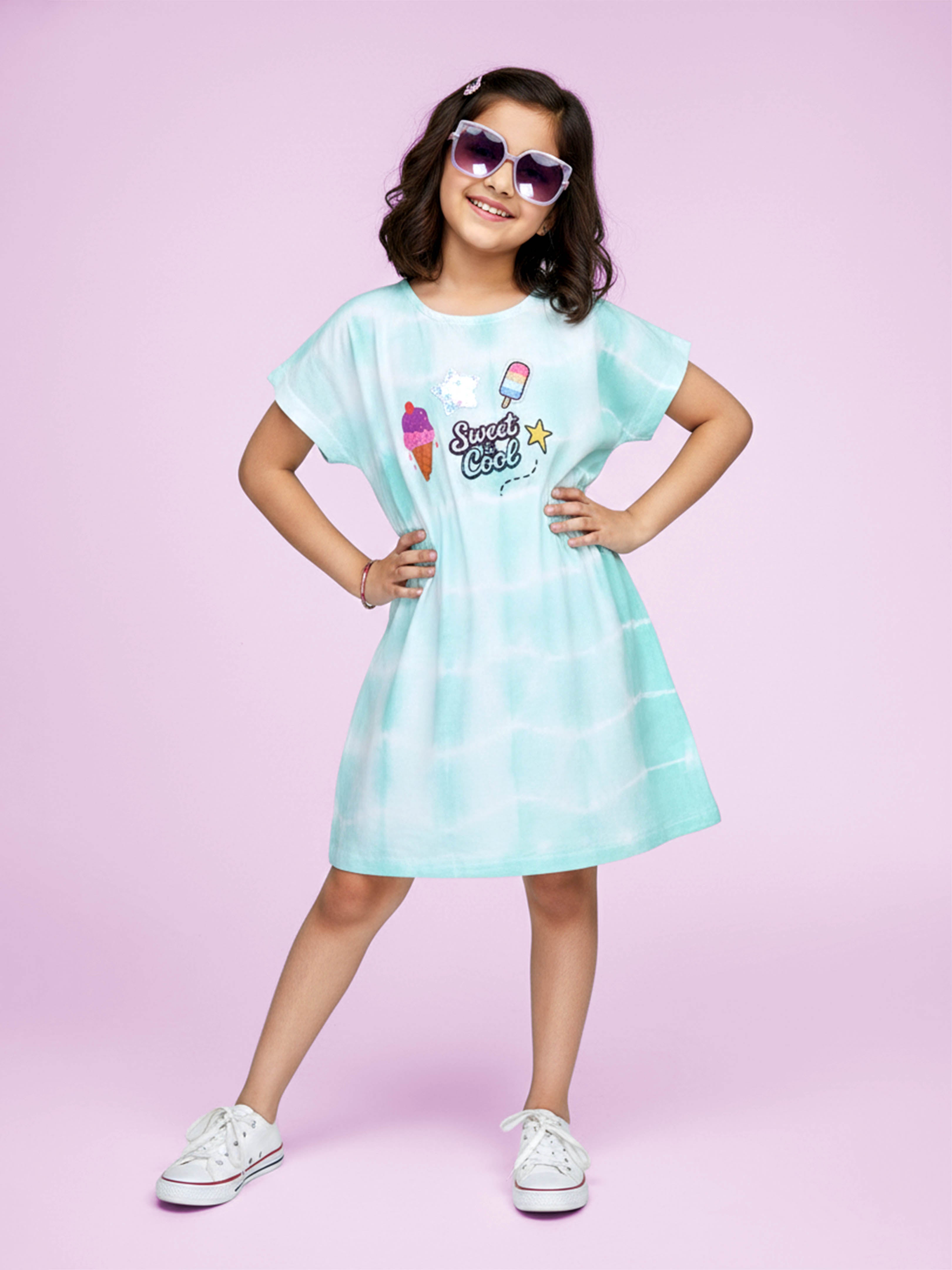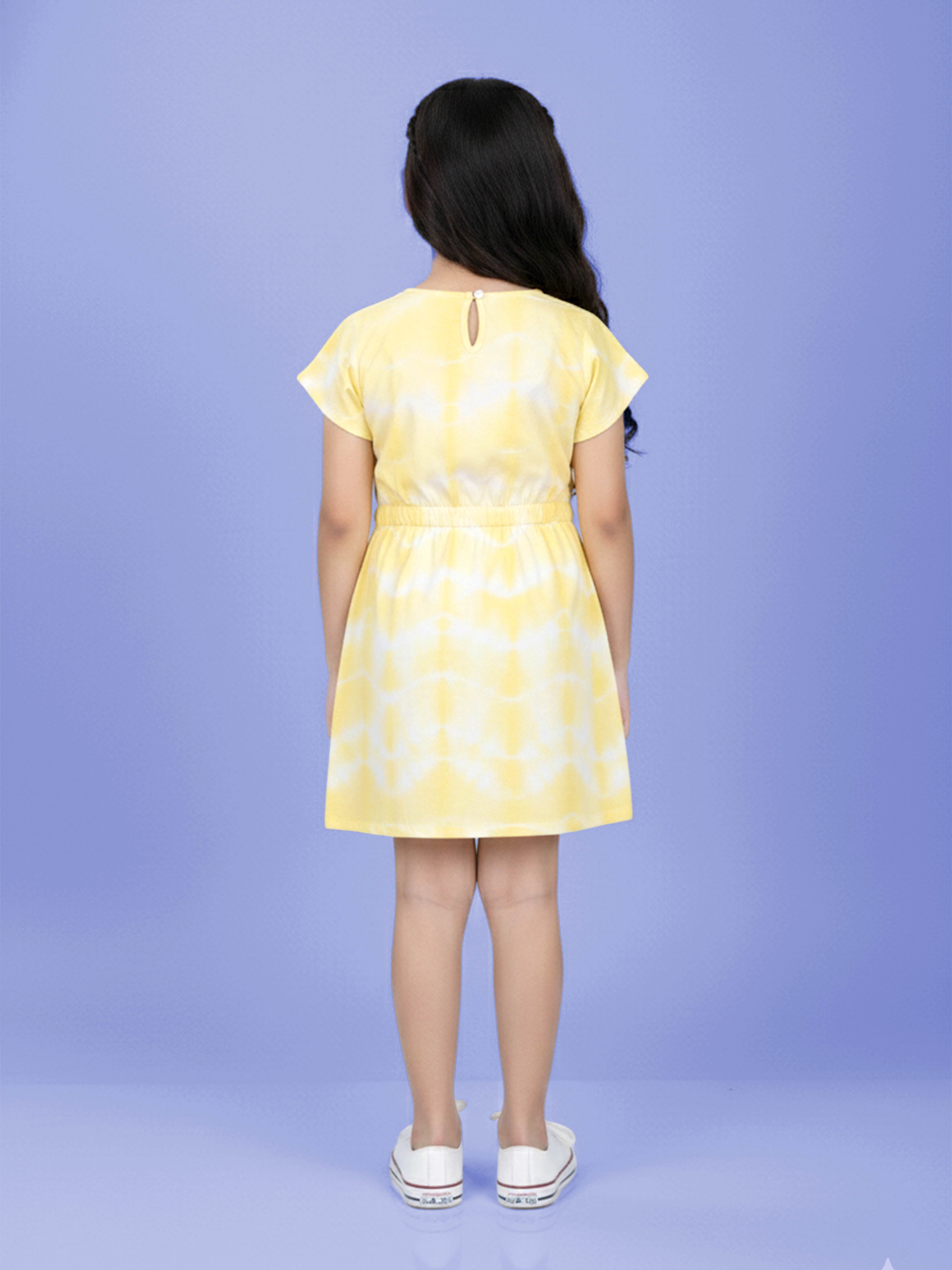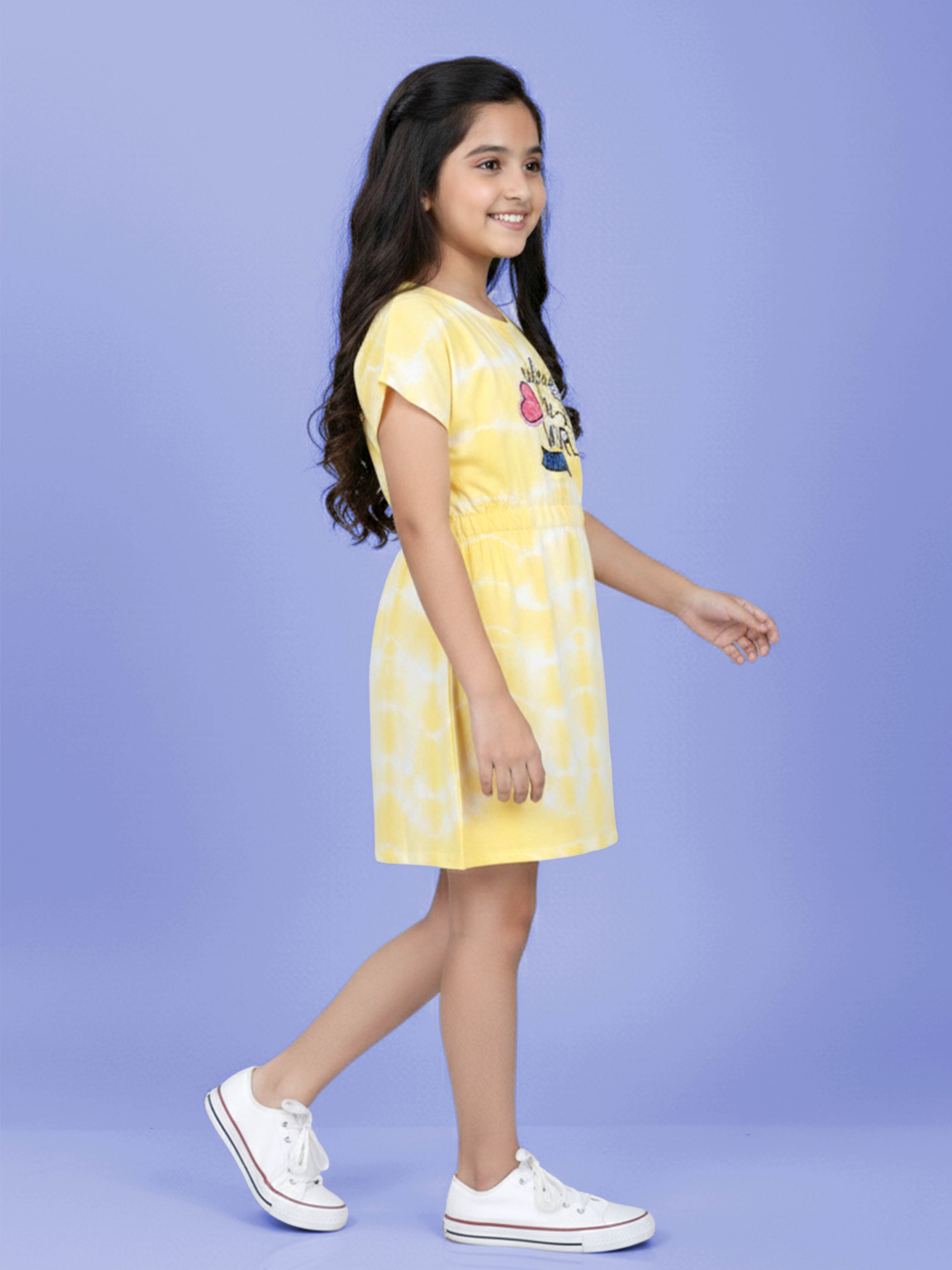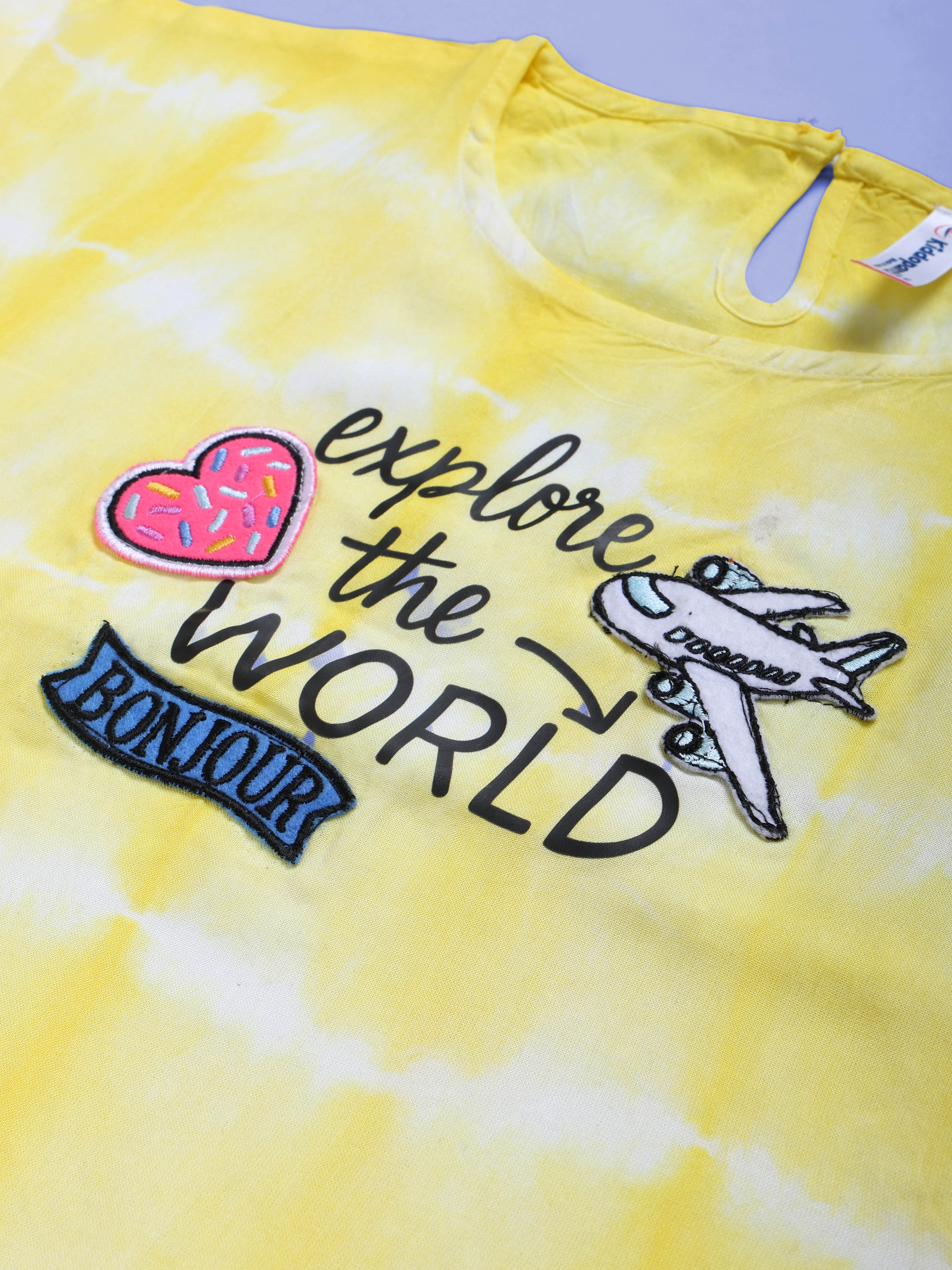 Kiddopanti brings to you the latest fashion clothes for your smart dressing young ones with this Tie-Dye Printed A-Line Dress. Designed in a bright sunny yellow tie-dye pattern, this top features a cheerful “Explore the World” graphic with travel-inspired motifs, adding a fun and adventurous vibe to everyday dressing. The softly gathered waist detailing creates a flattering silhouette while ensuring comfort and ease of movement for active kids. Crafted from lightweight, breathable cotton fabric, this top is gentle on the skin and perfect for all-day wear. The cap sleeves, round neckline, and back keyhole button closure add both style and convenience, making it an ideal pick for casual outings, playdates, vacations, or everyday wear.