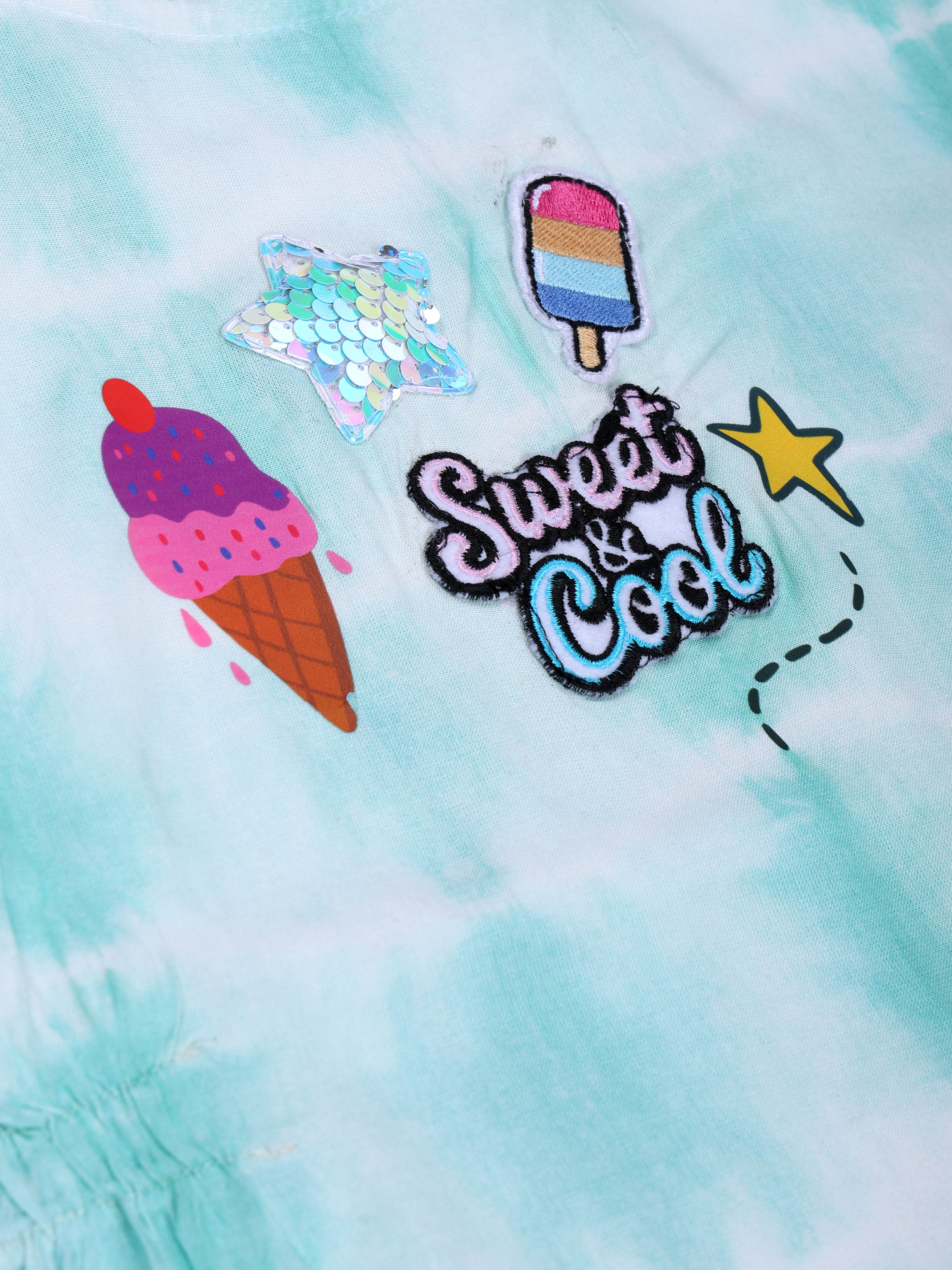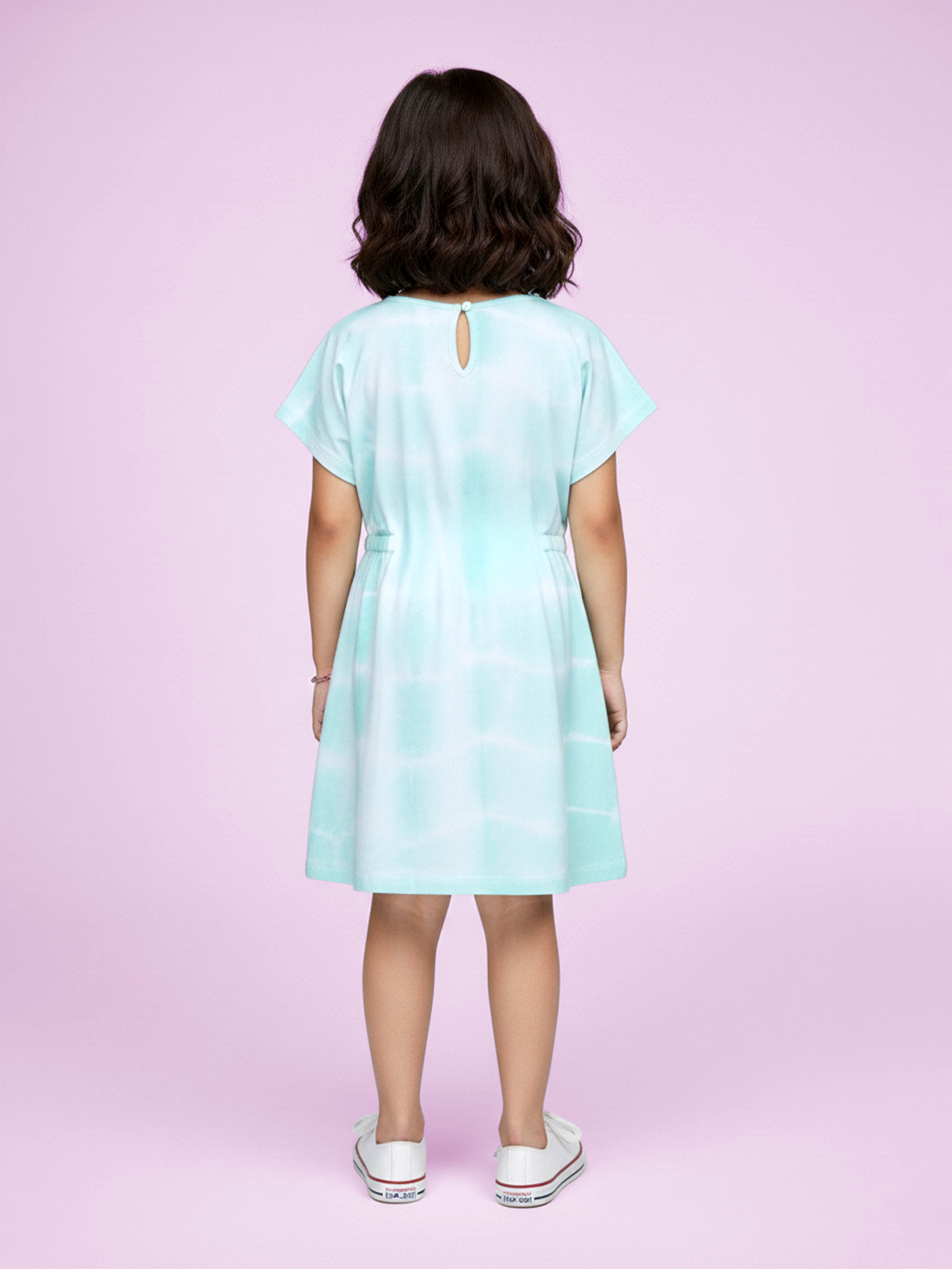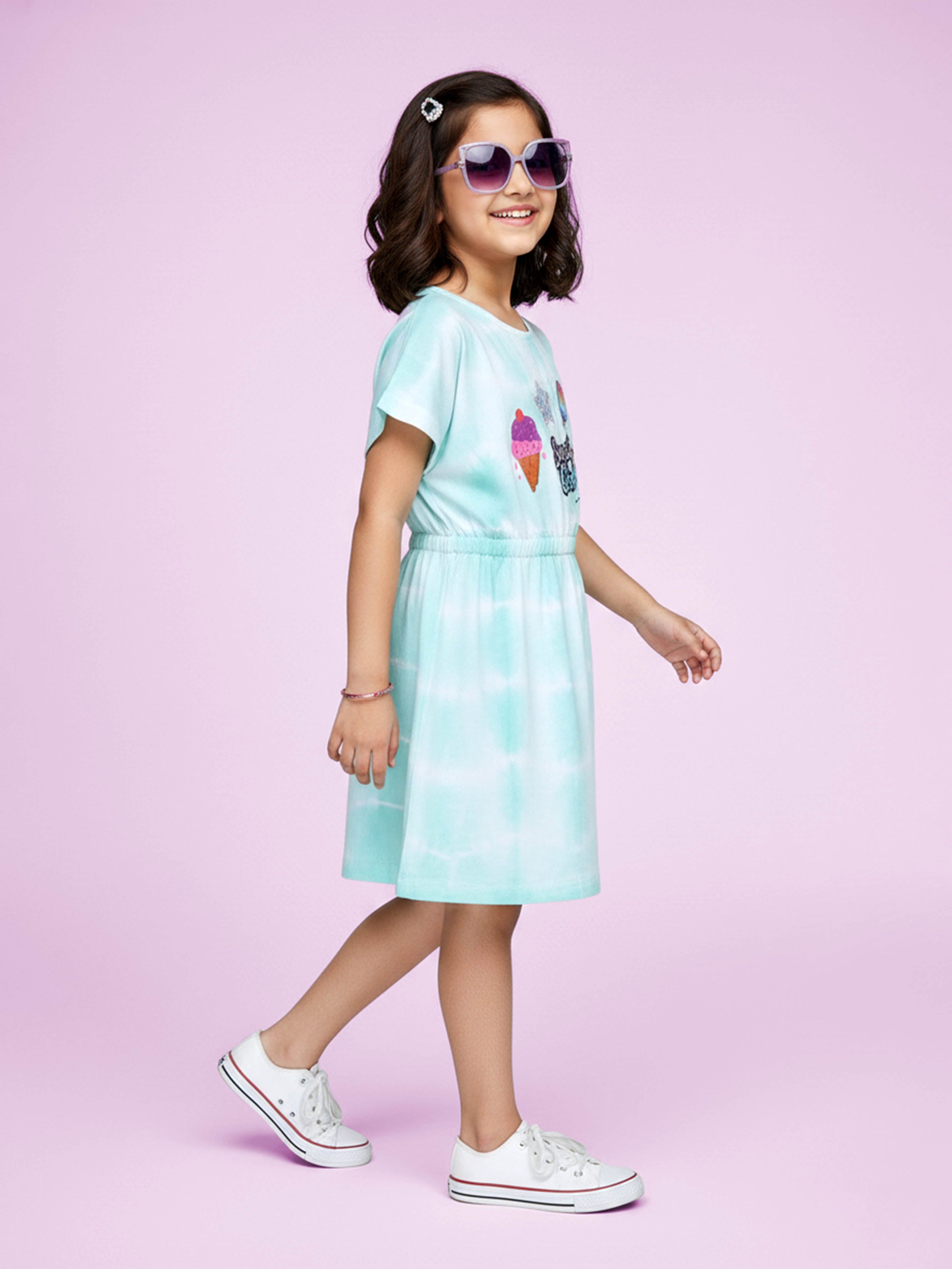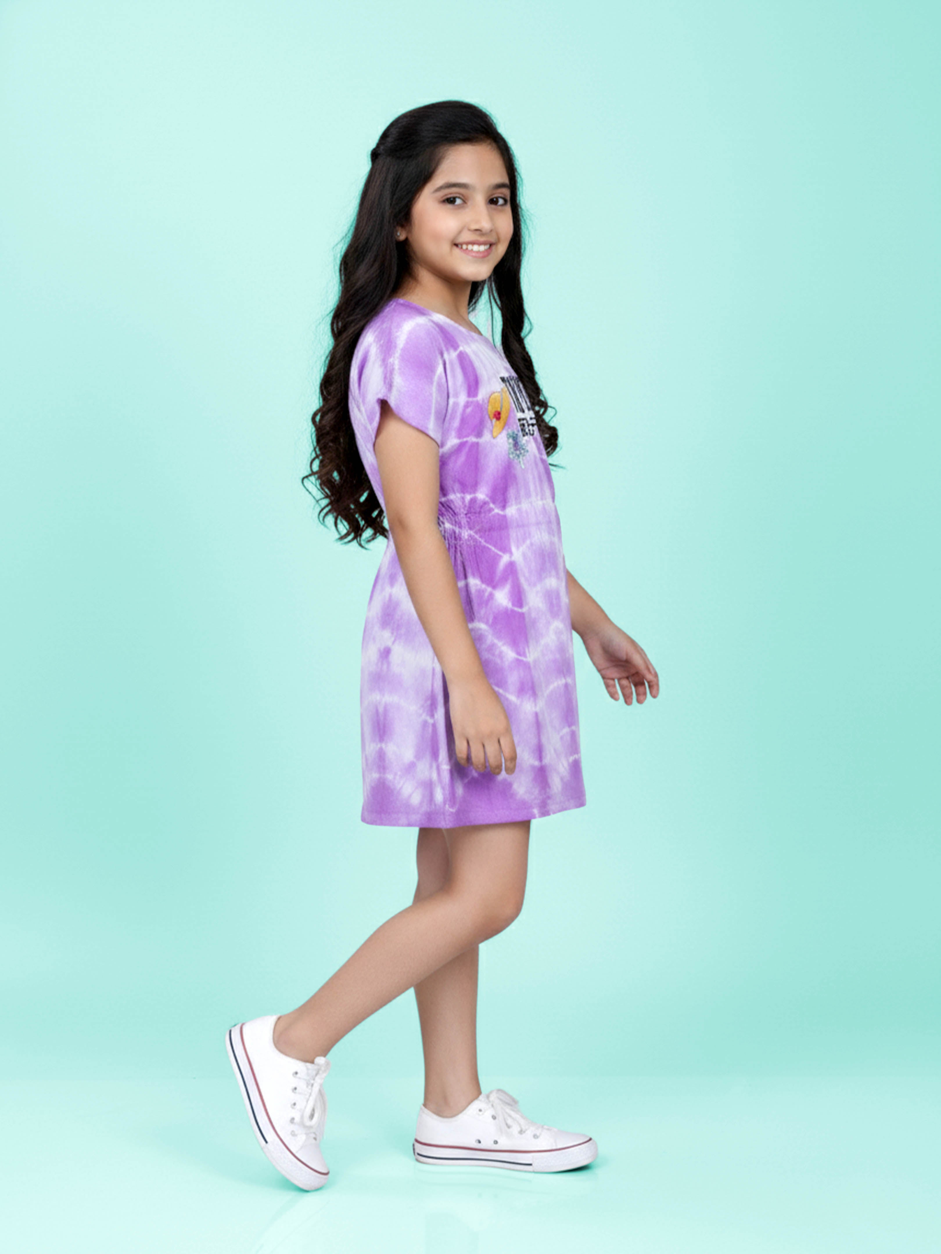 Kiddopanti brings to you the latest fashion clothes for your smart dressing young ones with this Tie-Dye Printed A-Line Dress. Designed in a bright sunny yellow tie-dye pattern, this top features a cheerful “Explore the World” graphic with travel-inspired motifs, adding a fun and adventurous vibe to everyday dressing. The softly gathered waist detailing creates a flattering silhouette while ensuring comfort and ease of movement for active kids. Crafted from lightweight, breathable cotton fabric, this top is gentle on the skin and perfect for all-day wear. The cap sleeves, round neckline, and back keyhole button closure add both style and convenience, making it an ideal pick for casual outings, playdates, vacations, or everyday wear.
