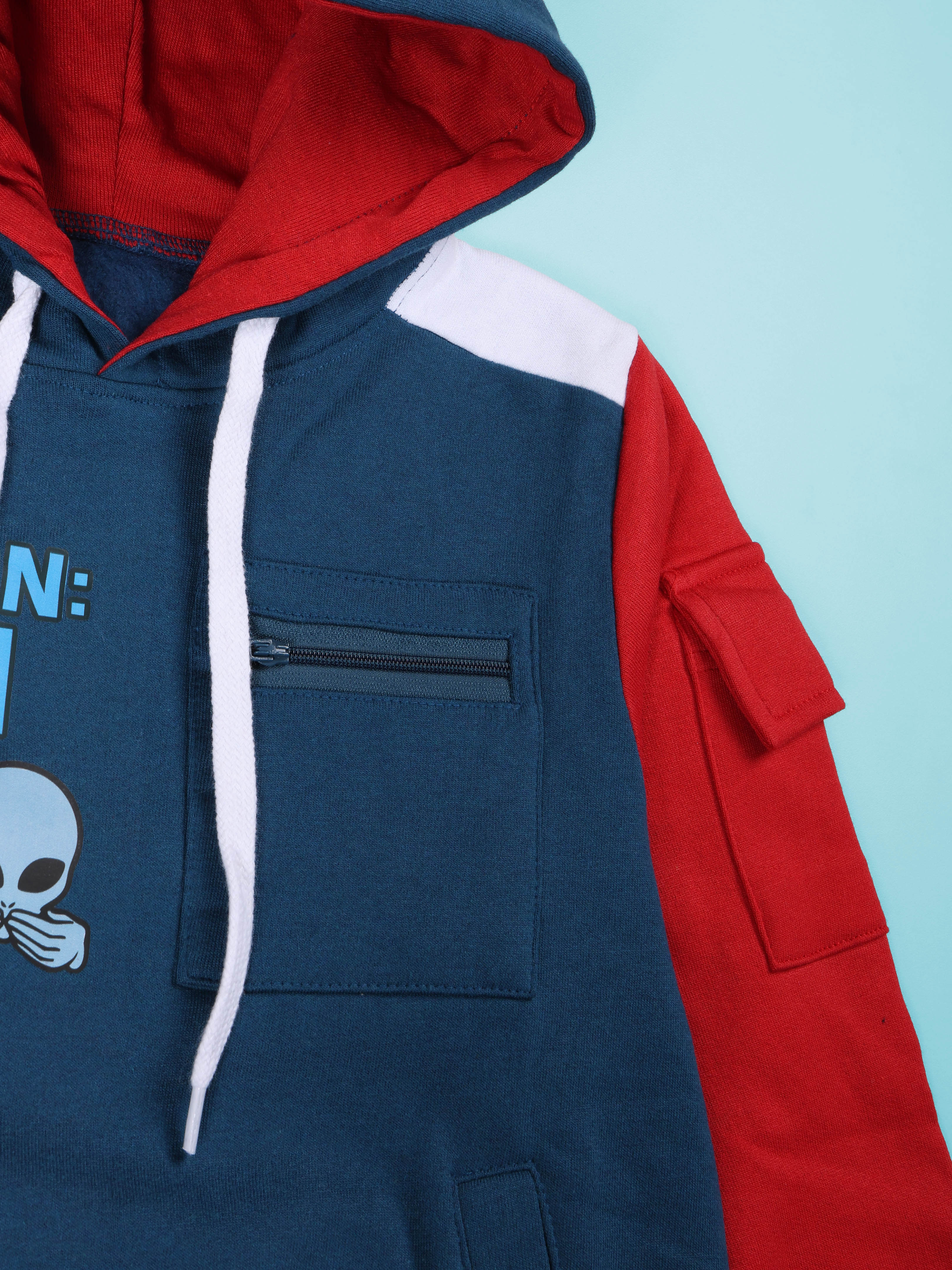 Send your young explorer on a mission of style and comfort with this Kiddopanti Winter Adventure Combo, featuring the bold “Mission: Fun” Colourblock Hoodie paired with rugged Denim Cargo Pants. Designed for little boys who love space, adventure, and cool streetwear, this combo combines vibrant style, winter warmth, and practical utility — perfect for school, playdates, outings, and casual everyday wear. The Mission: Fun Hoodie stands out with its playful alien-themed graphic, motivational vibe, and sporty tri-colour design in blue, red, and white. Made from soft cotton-poly fleece, it offers breathable warmth along with functional features like a zip chest pocket, kangaroo pocket, ribbed finishing, and a cozy hood with drawcord — making it both fun and functional. Paired with this is the Kiddopanti Denim Cargo Pant, built for durability, movement, and adventure. Crafted from stretch cotton-poly Lycra denim, these cargo jeans feature multiple pockets, cut-sew detailing, and a button-elastic waistband for comfort and flexibility. With its washed denim look and utility-inspired cargo pockets, it brings streetwear edge to your child’s winter wardrobe. Together, this combo delivers the perfect blend of playful energy, rugged utility, and winter-ready comfort — ideal for your mission-ready little adventurer!