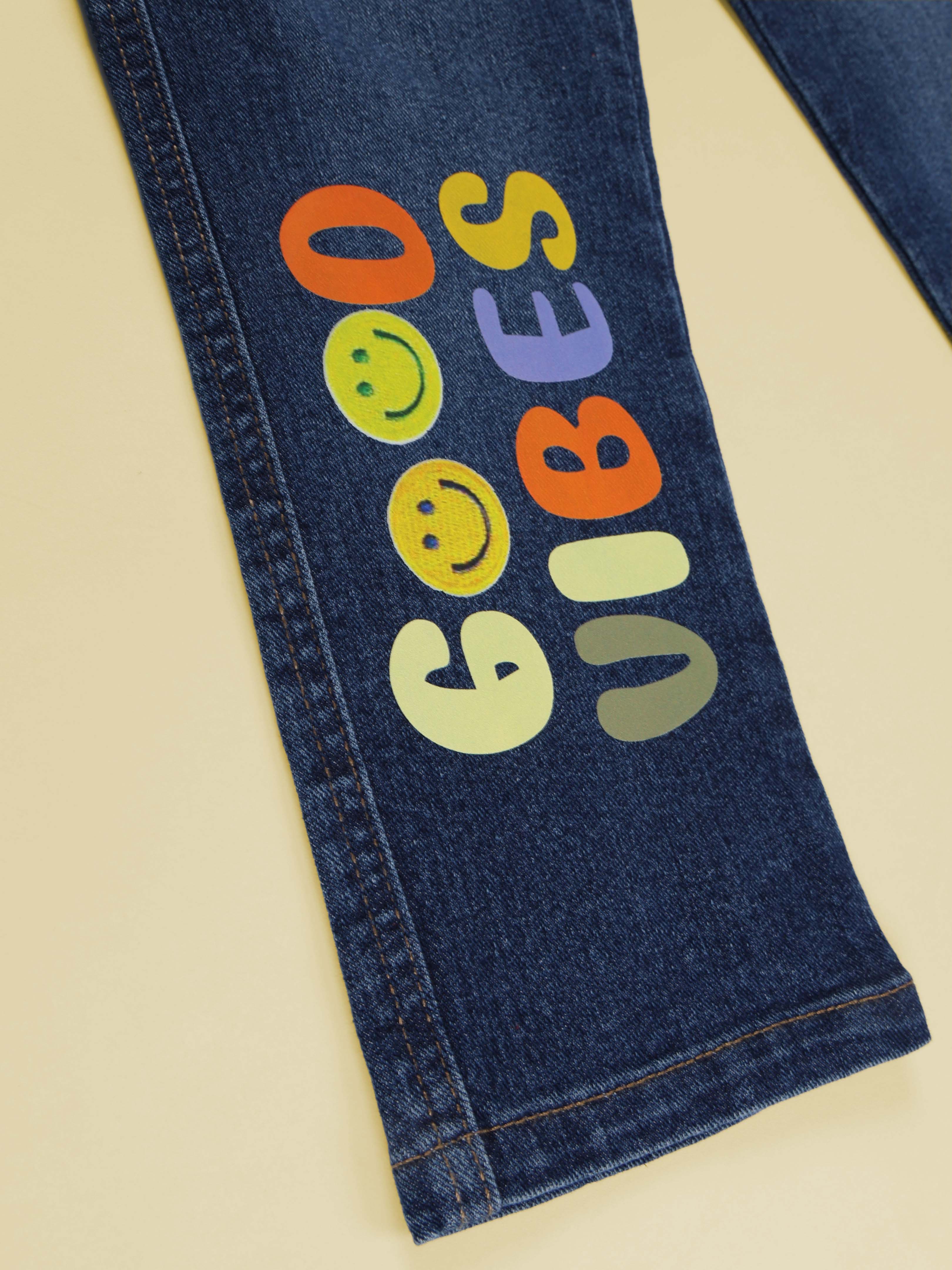 Parents know the value of clothes that keep up with a kid’s energy—and their changing moods. These Kiddopanti jeans are all about function and feel-good fashion. With a rich dark wash, cheerful "GOOD VIBES" print on one leg, and a fun cartoon stamp patch on the other, they turn basic denim into a wearable mood boost. Easy to pair, easier to love—this is the denim moms reach for when smiles matter more than just style.