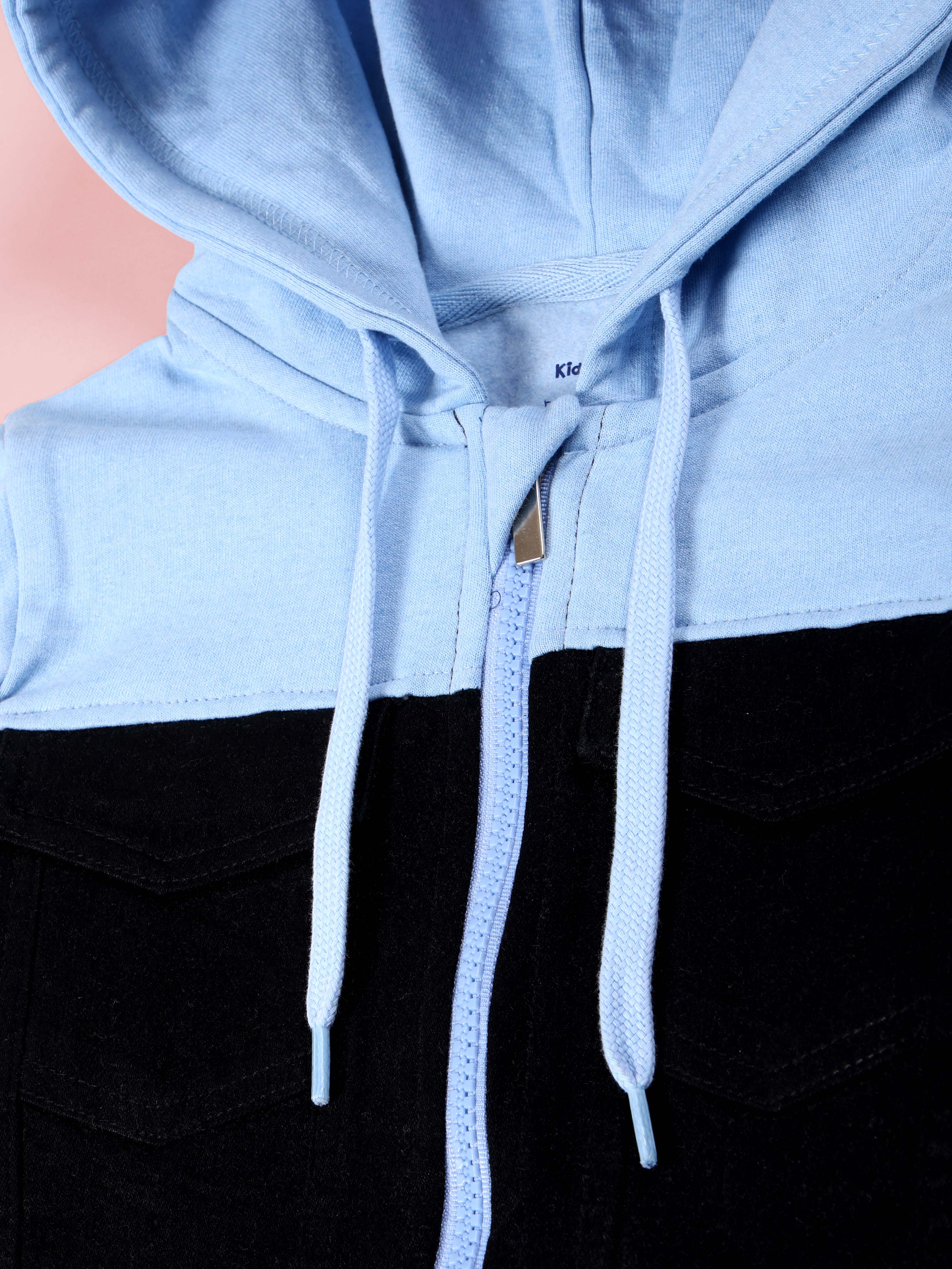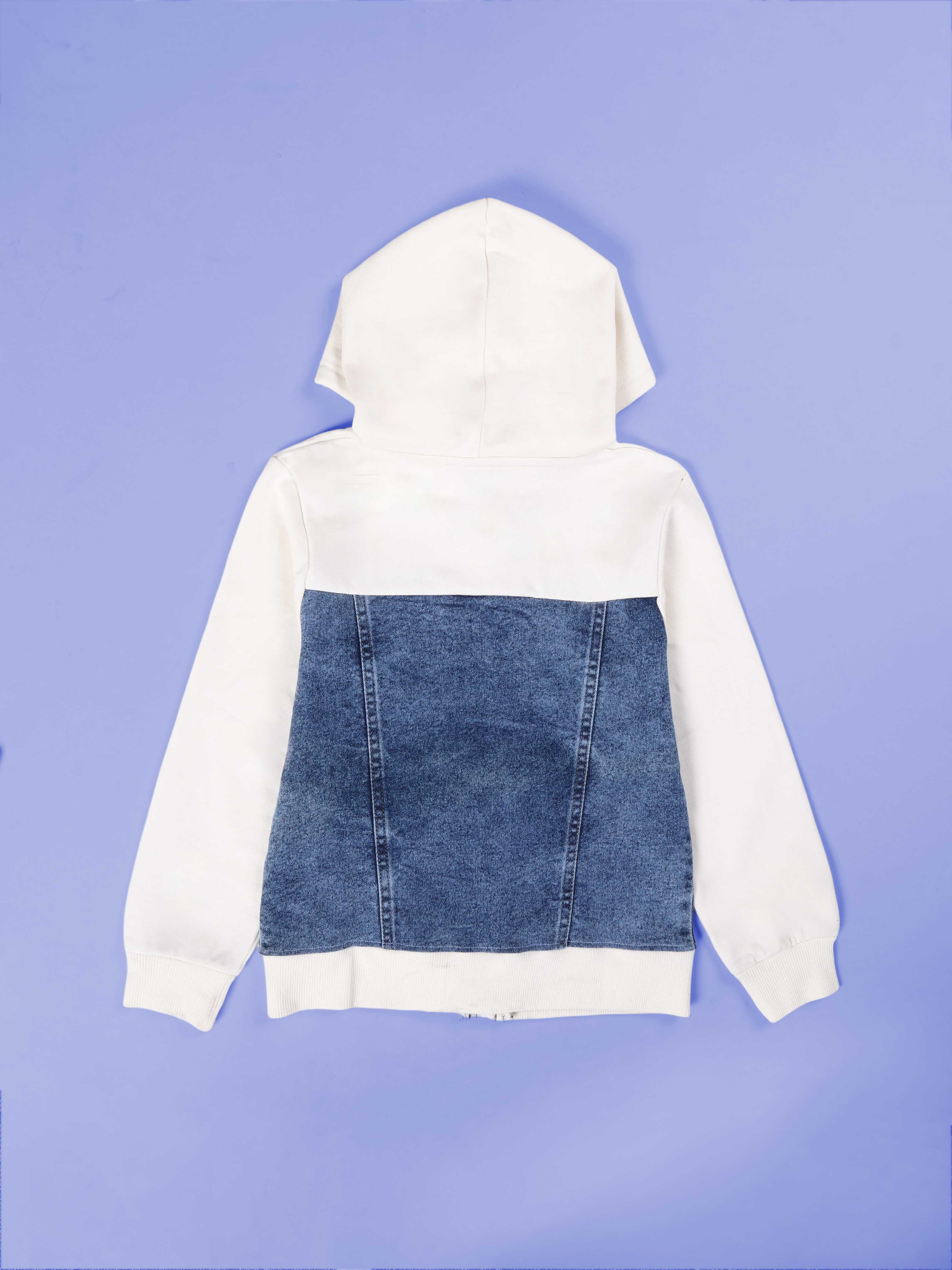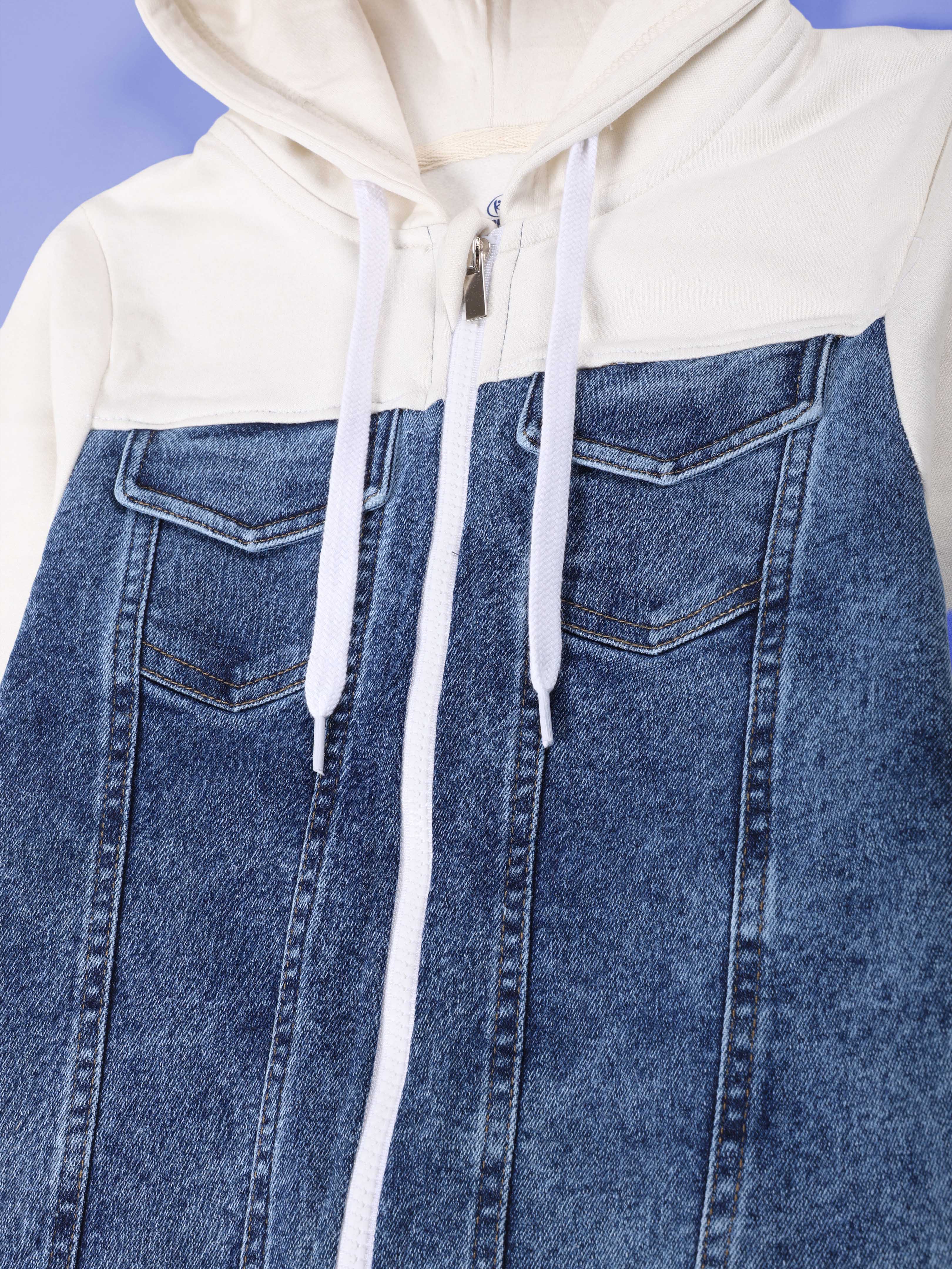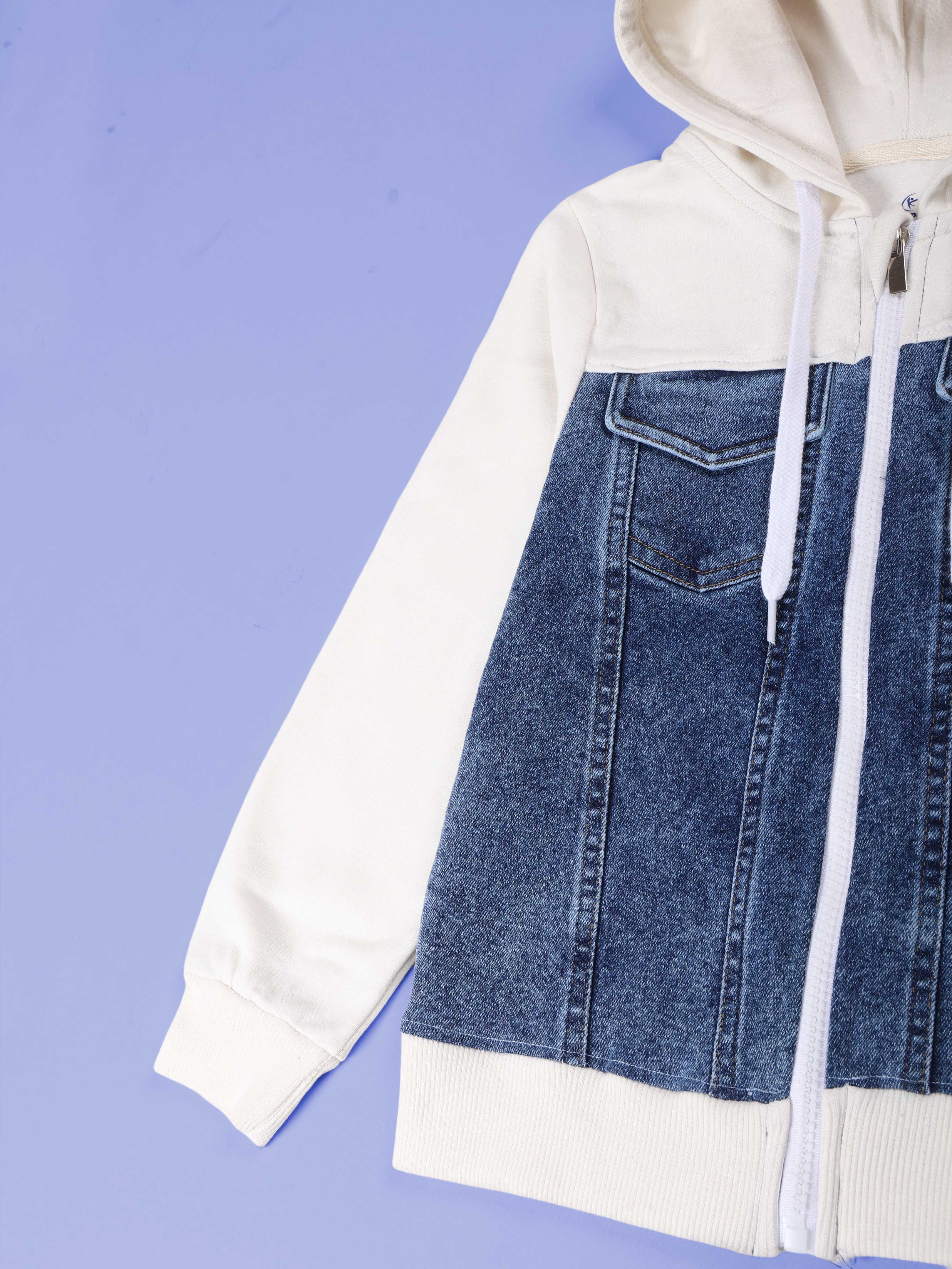 Bring a trendy twist to her winter style with this Unisex Fleece & Denim Hoodie Jacket from Kiddopanti. Designed with a unique fusion look, this jacket combines a cozy fleece hoodie with a rugged blue denim panel body. The standout detail is the front zipper closure, adding both convenience and a sleek edge to the design. Featuring 2 flap denim pockets, ribbed cuffs, and an attached hood with drawstrings, this piece is perfect for casual outings, school, or playdates. A must-have layering essential that blends warmth, comfort, and street-style fashion.