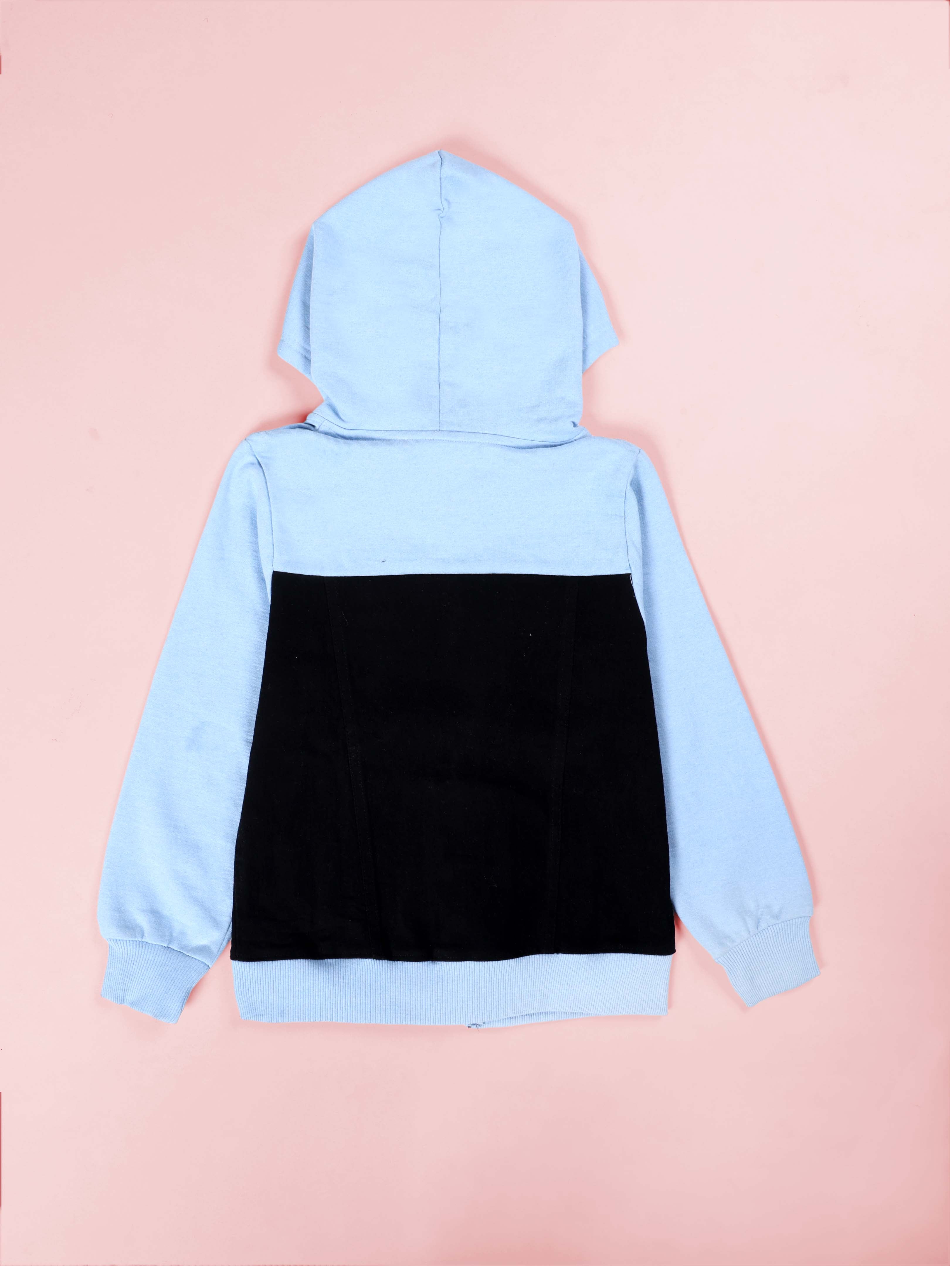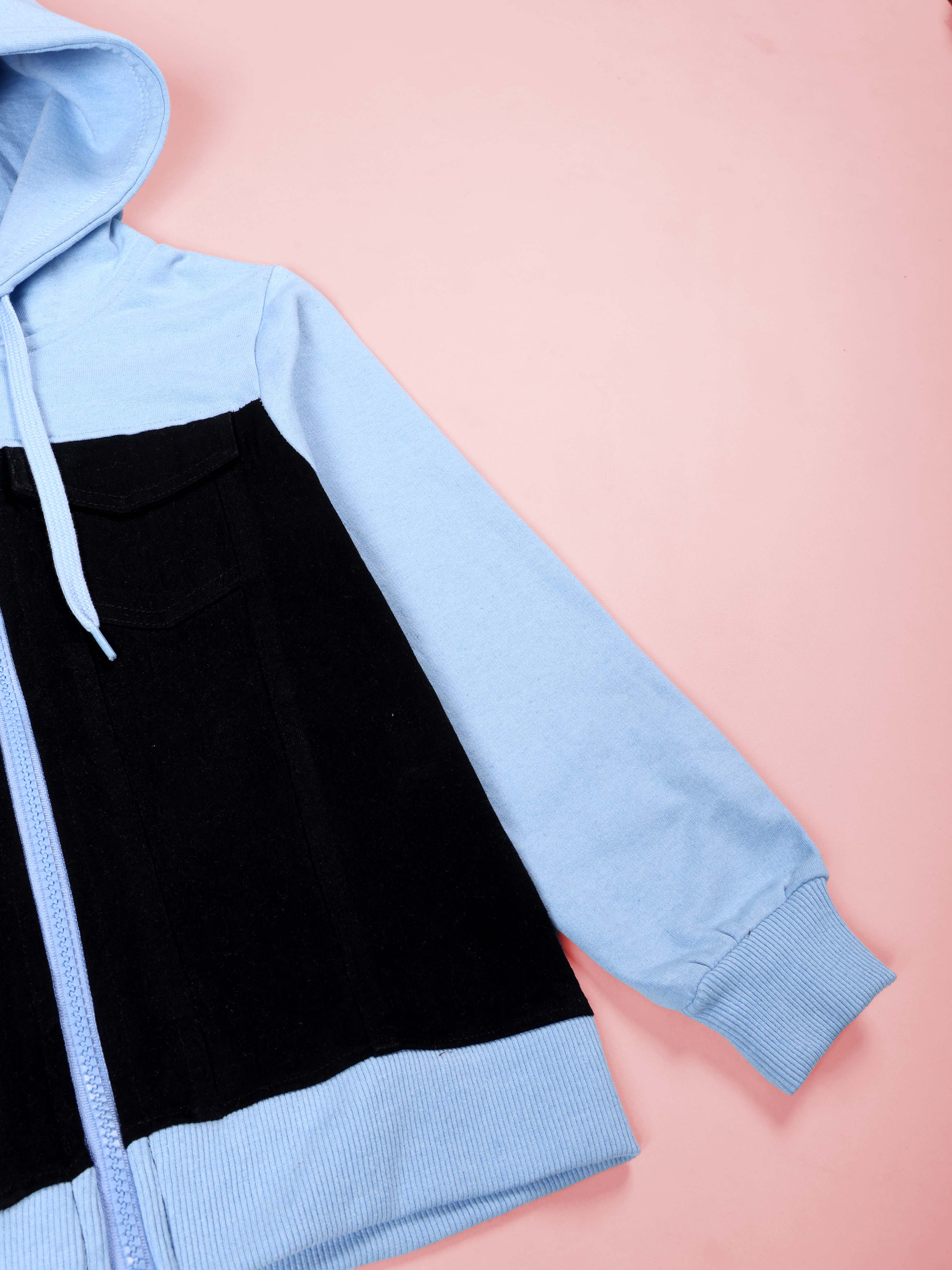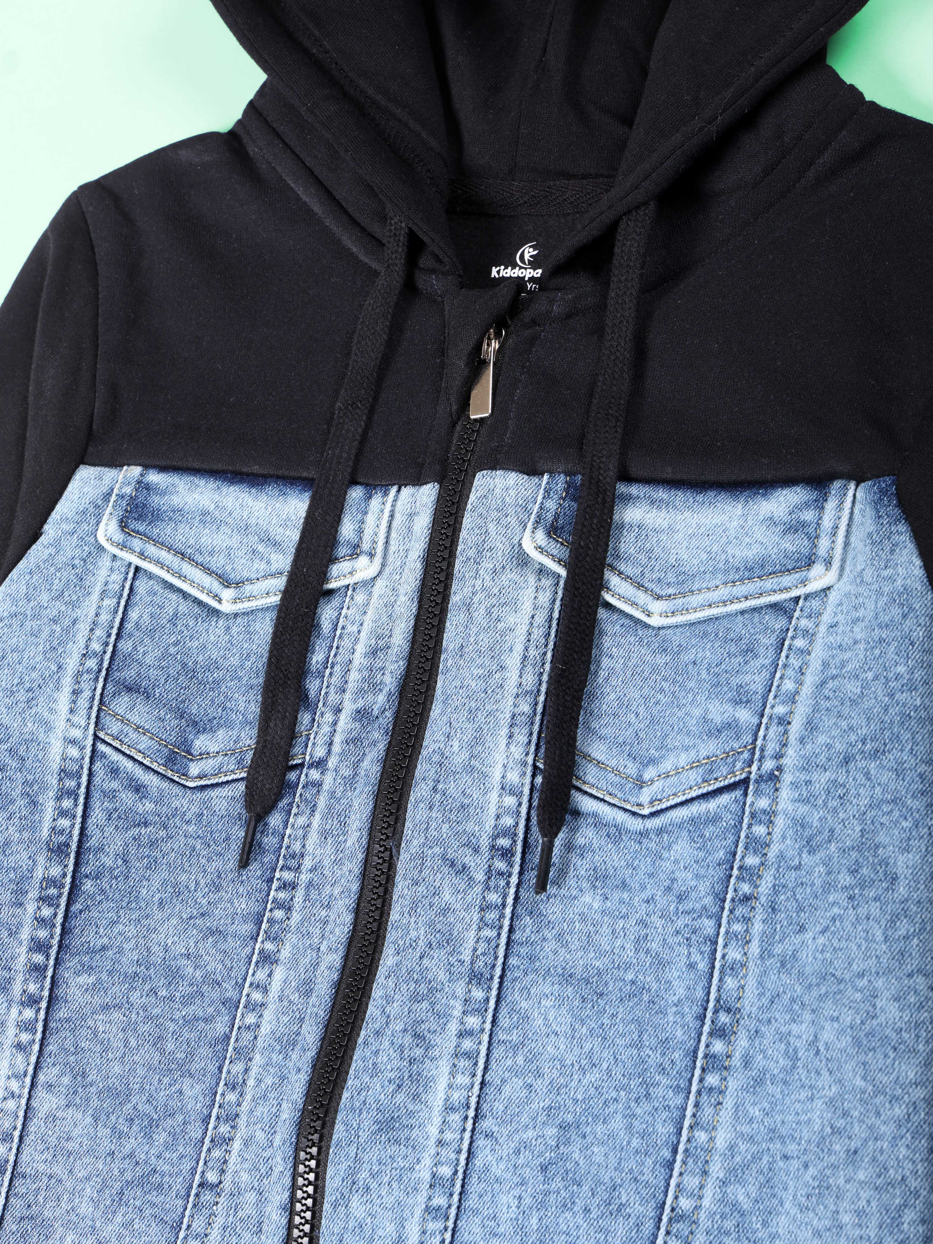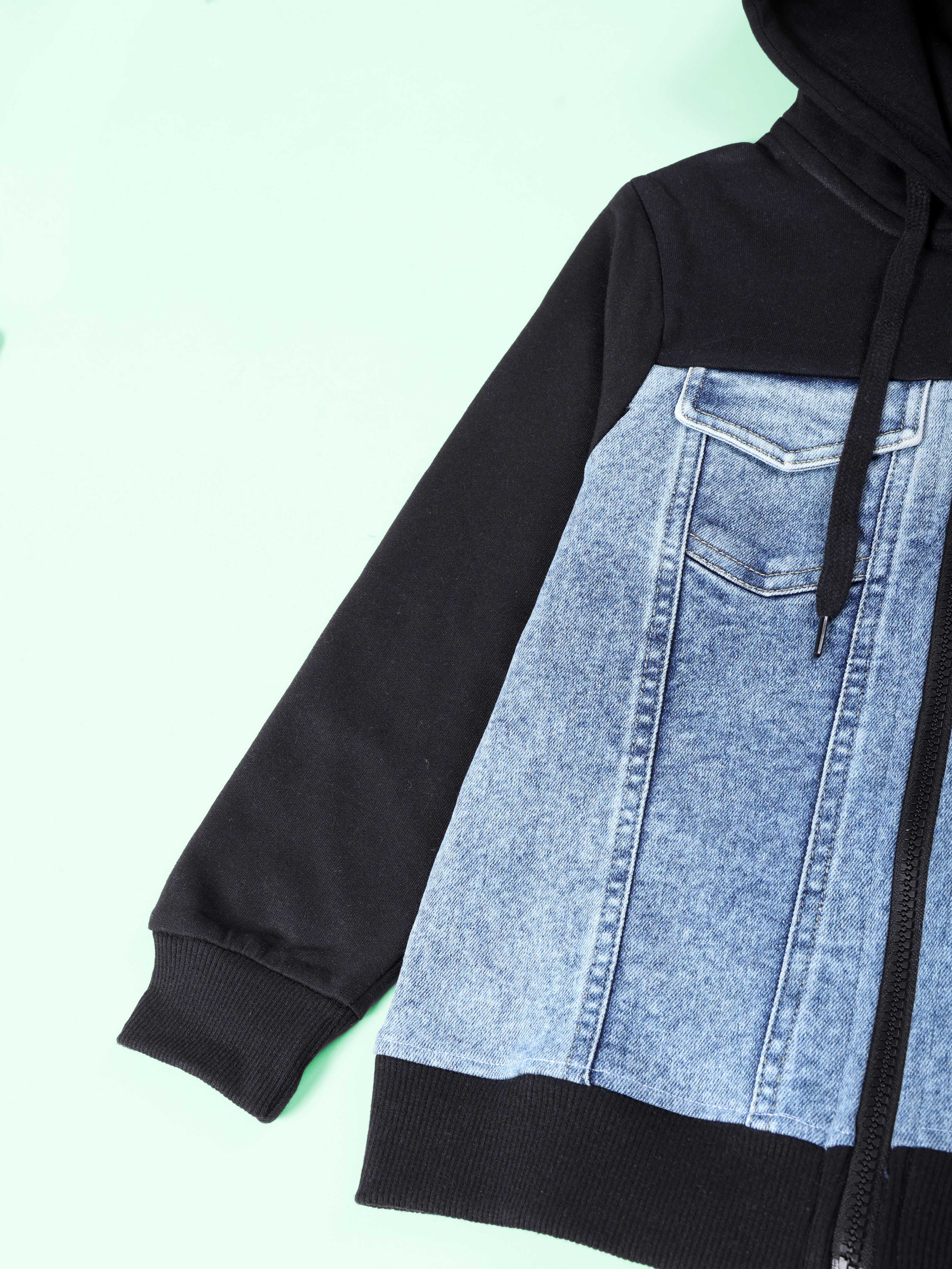 Bring a trendy twist to her winter style with this Unisex Fleece & Denim Hoodie Jacket from Kiddopanti. Designed with a unique fusion look, this jacket combines a cozy fleece hoodie with a rugged blue denim panel body. The standout detail is the front zipper closure, adding both convenience and a sleek edge to the design. Featuring 2 flap denim pockets, ribbed cuffs, and an attached hood with drawstrings, this piece is perfect for casual outings, school, or playdates. A must-have layering essential that blends warmth, comfort, and street-style fashion.