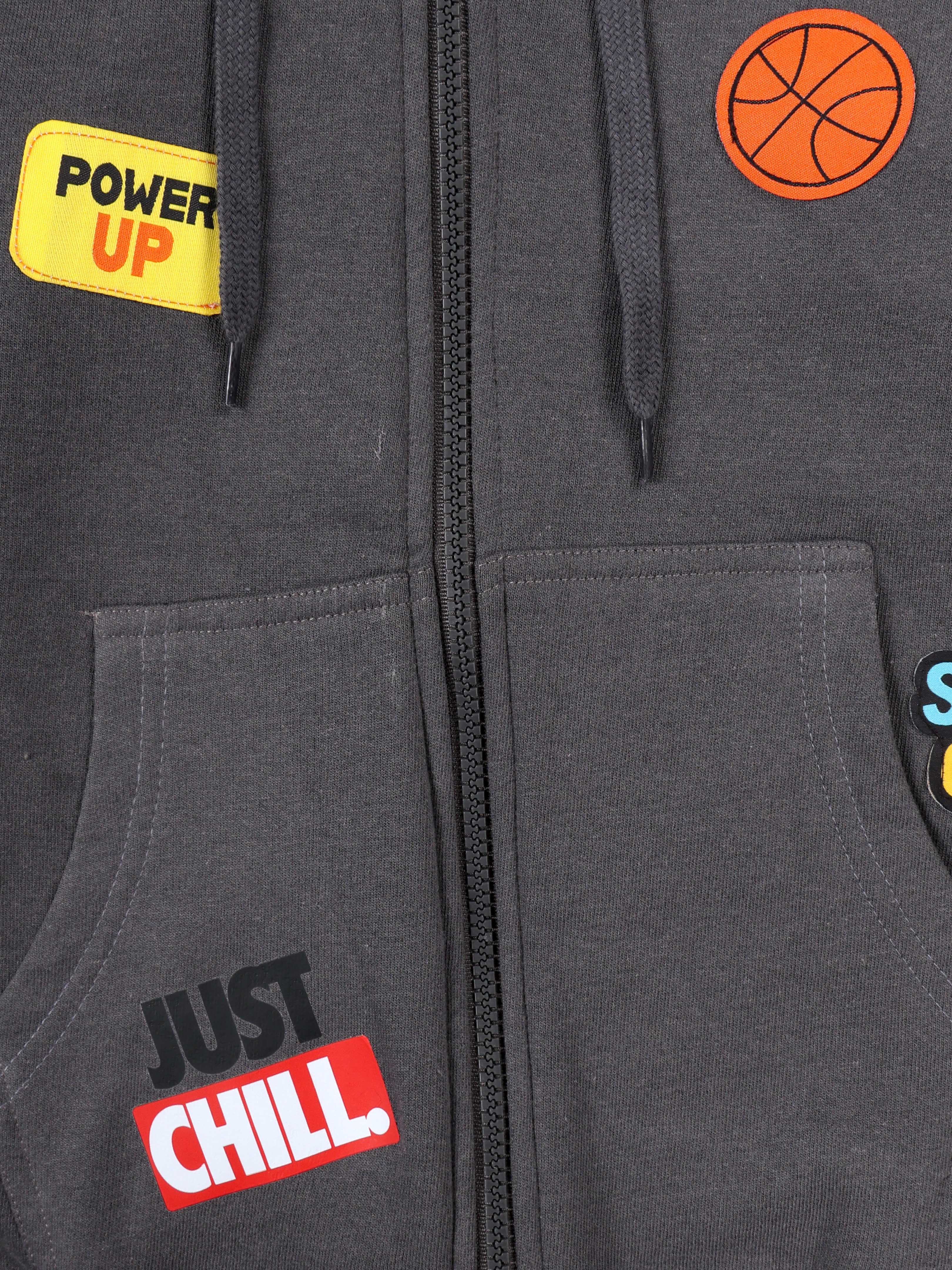Add cool vibes to your child’s winter wardrobe with this Boys Graphic Print Fleece Hoodie. Made from soft and cozy fleece, this front-open zip-up sweatshirt features a stylish hood and ribbed cuffs for all-day warmth and comfort. The hoodie is decorated with fun and trendy graphic patches like “Power Up,” “Just Chill,” “Super Cool,” and a sporty basketball design, making it a perfect pick for casual outings, school, or playtime.