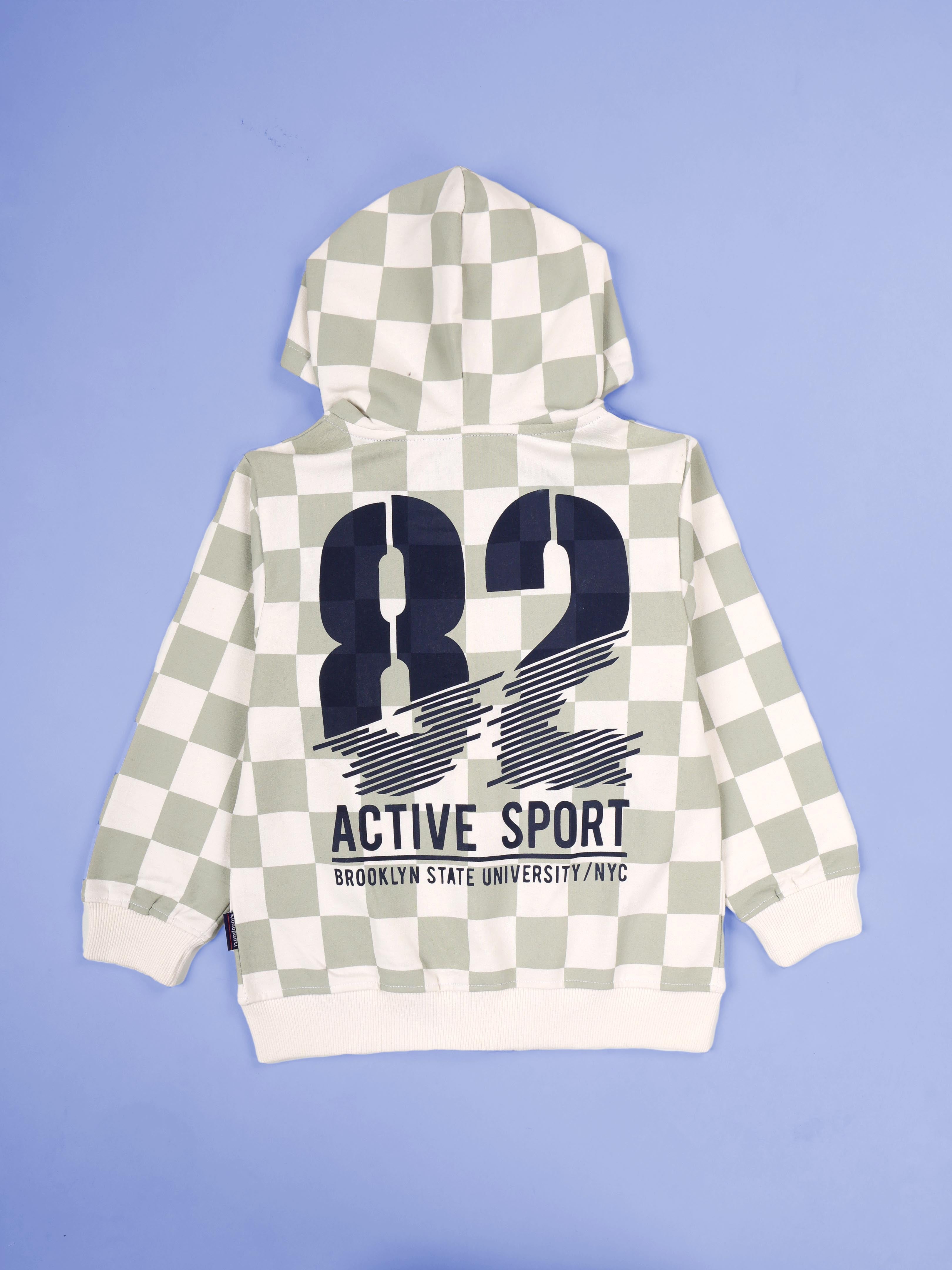 Add a fresh twist to your boy’s casual wardrobe with the Kiddopanti Checkered “Stay Cool” Hoodie. Designed in a trendy sage green and white all-over checkered pattern, this full-zip hoodie brings a cool, contemporary vibe that kids love. Featuring the sporty “82” chest & back print and a motivational “STAY COOL” label near the hem, this hoodie is as expressive as it is cozy. Made with a soft and breathable fleece knit fabric, it ensures warmth without the bulk. The front kangaroo pockets offer space to tuck in hands or small essentials, while the ribbed hem and cuffs keep the fit secure and stylish. Whether layered over a tee or worn as a jacket, this hoodie is perfect for school days, playdates, or weekend fun.