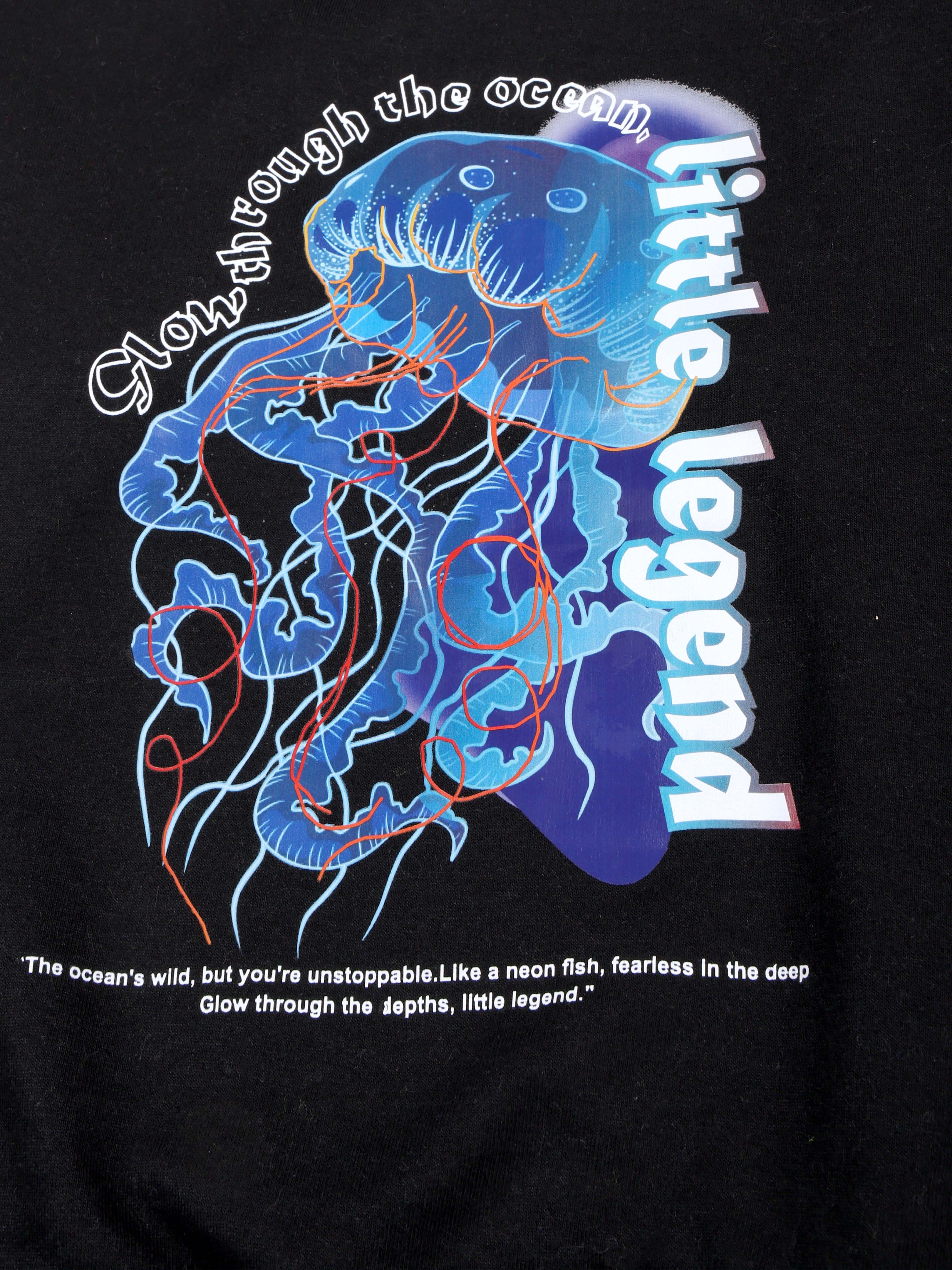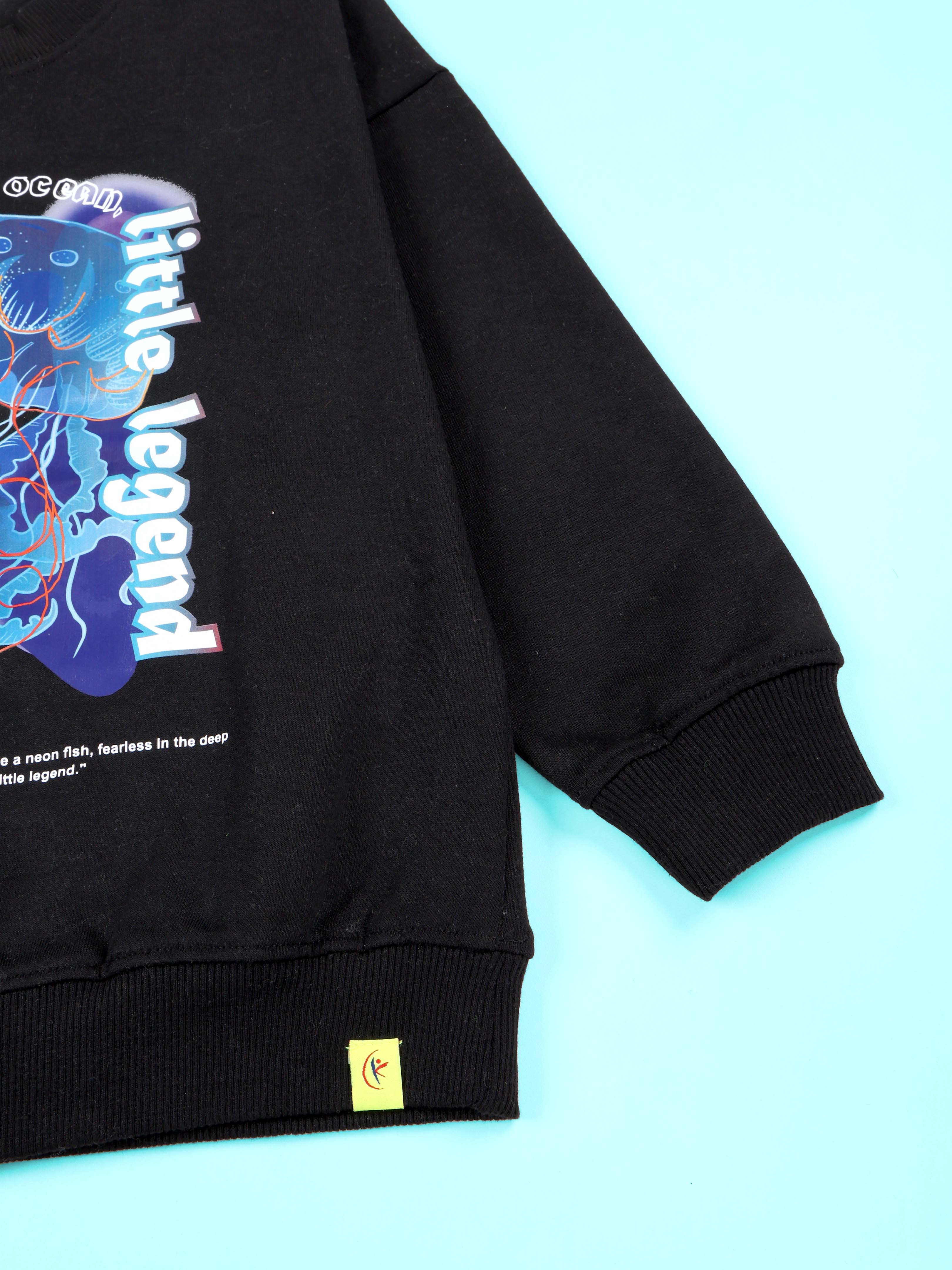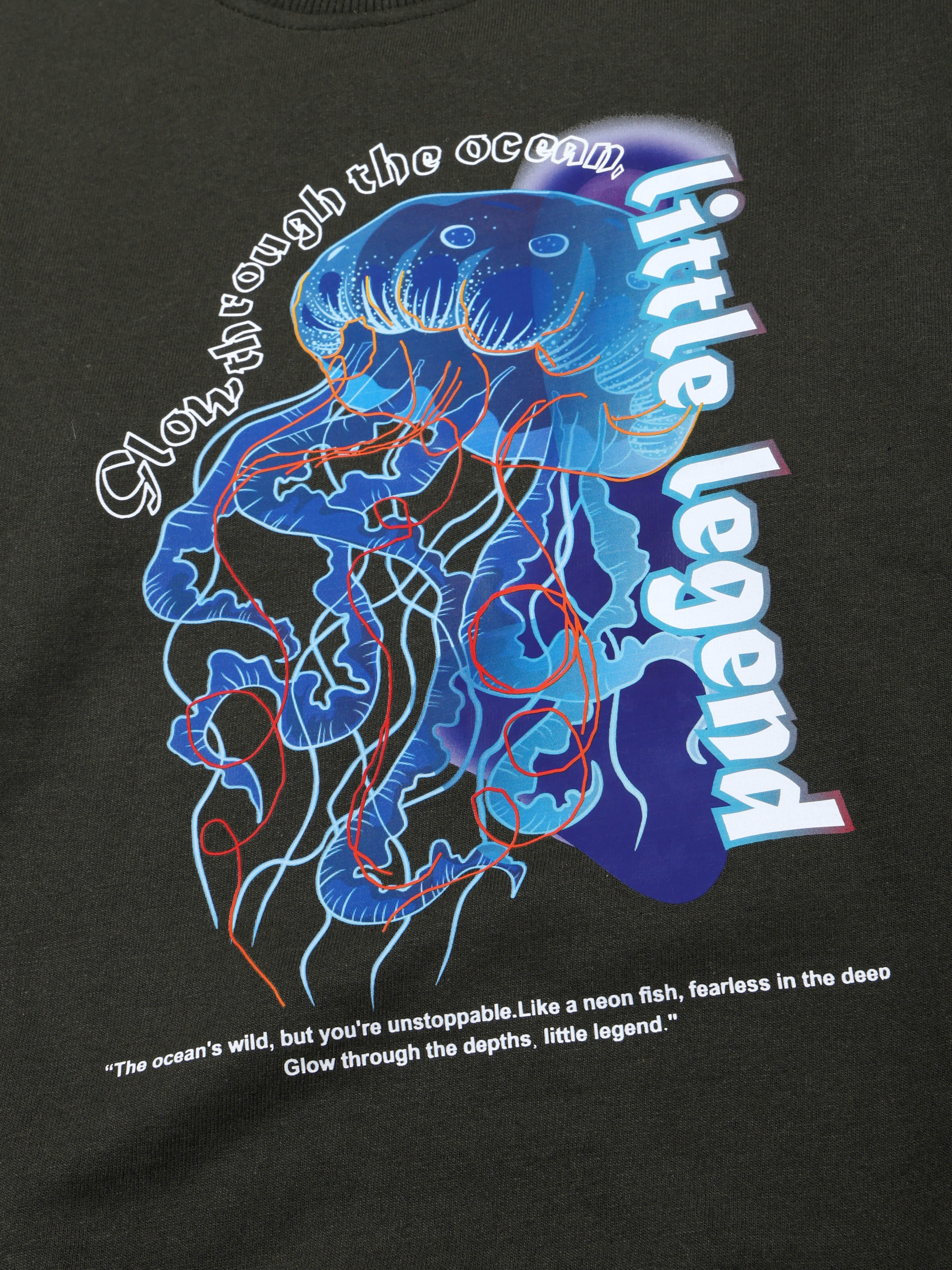 Dive into deep-sea imagination with this black sweatshirt from Kiddopanti, featuring a radiant jellyfish and cosmic-themed typography like Little Legend and Glow Within the Cosmic. Perfect for kids who shine bright and dream deep.