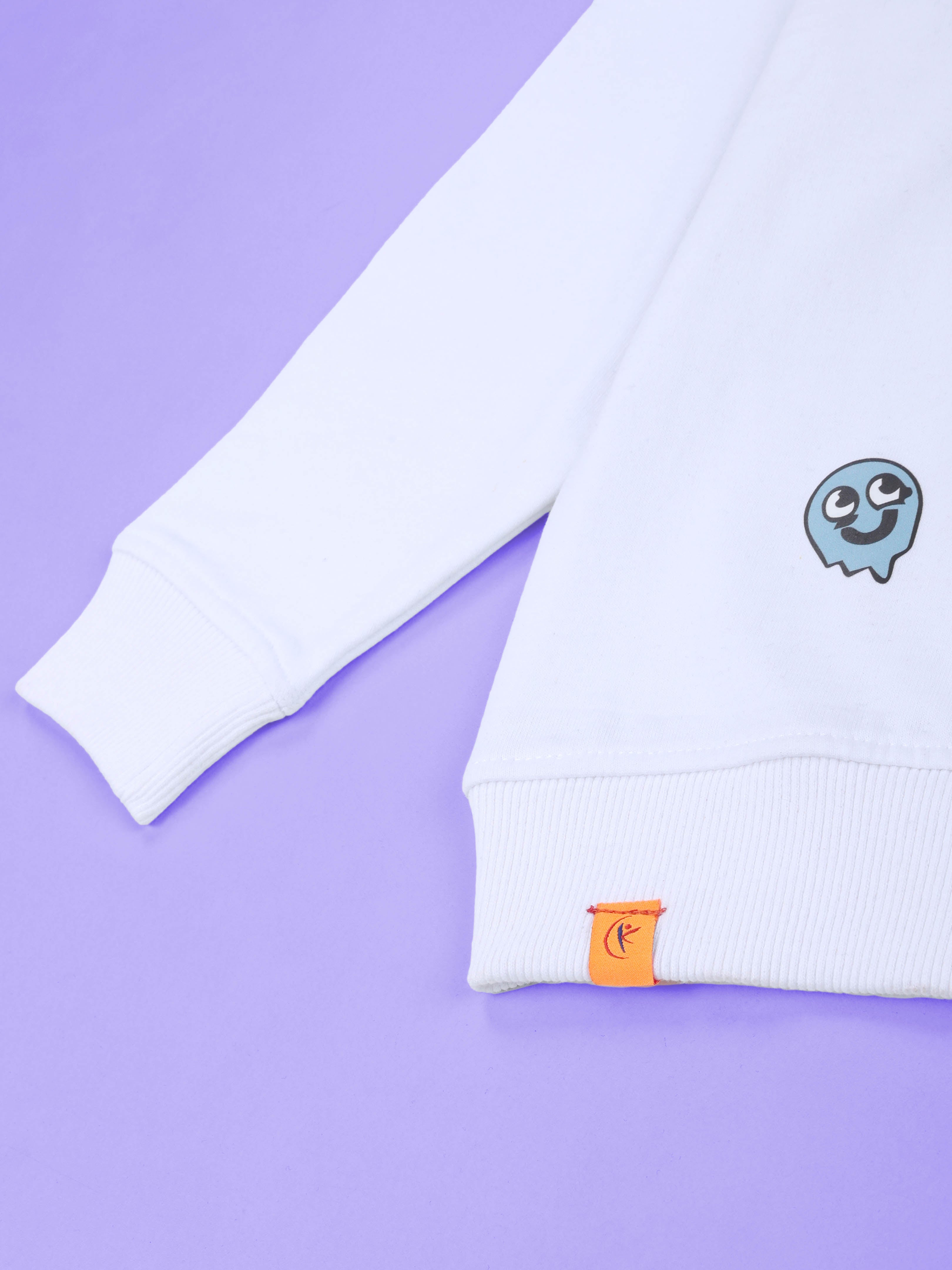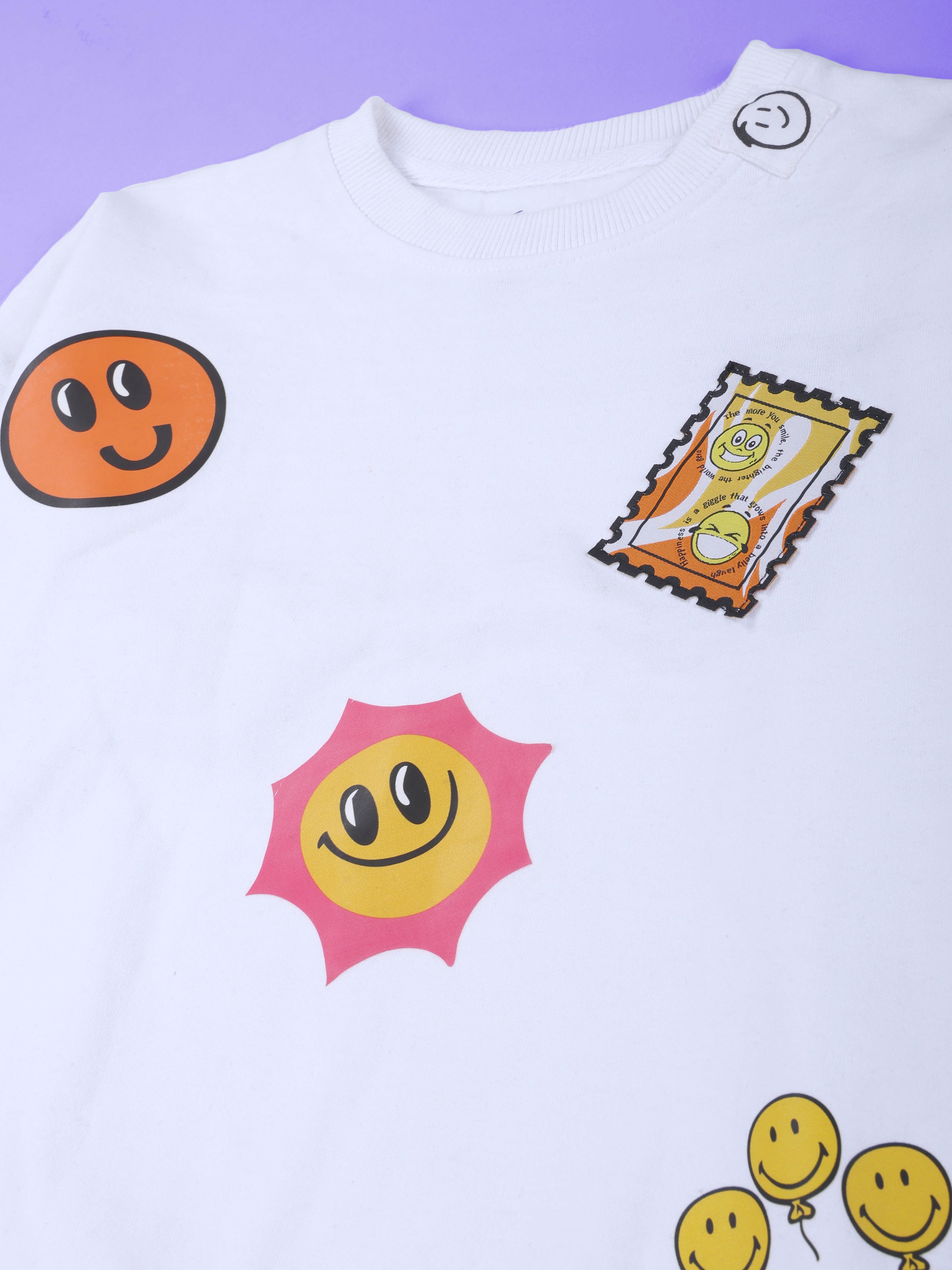 Spread smiles and good vibes in this white sweatshirt from Kiddopanti, detailed with playful smiley patches, balloons, and cartoon icons. A cheerful pick for happy-go-lucky kids who love color and character.