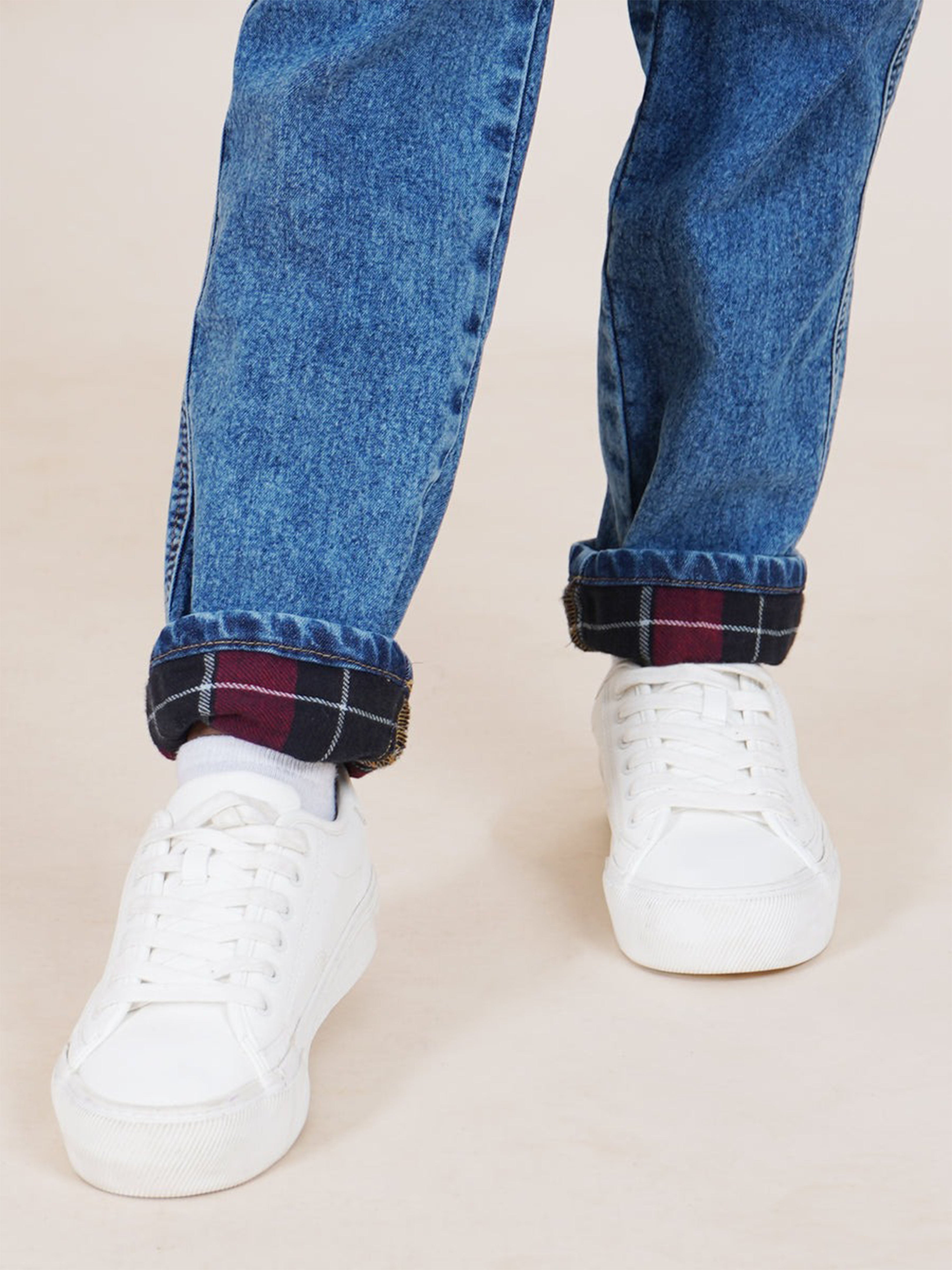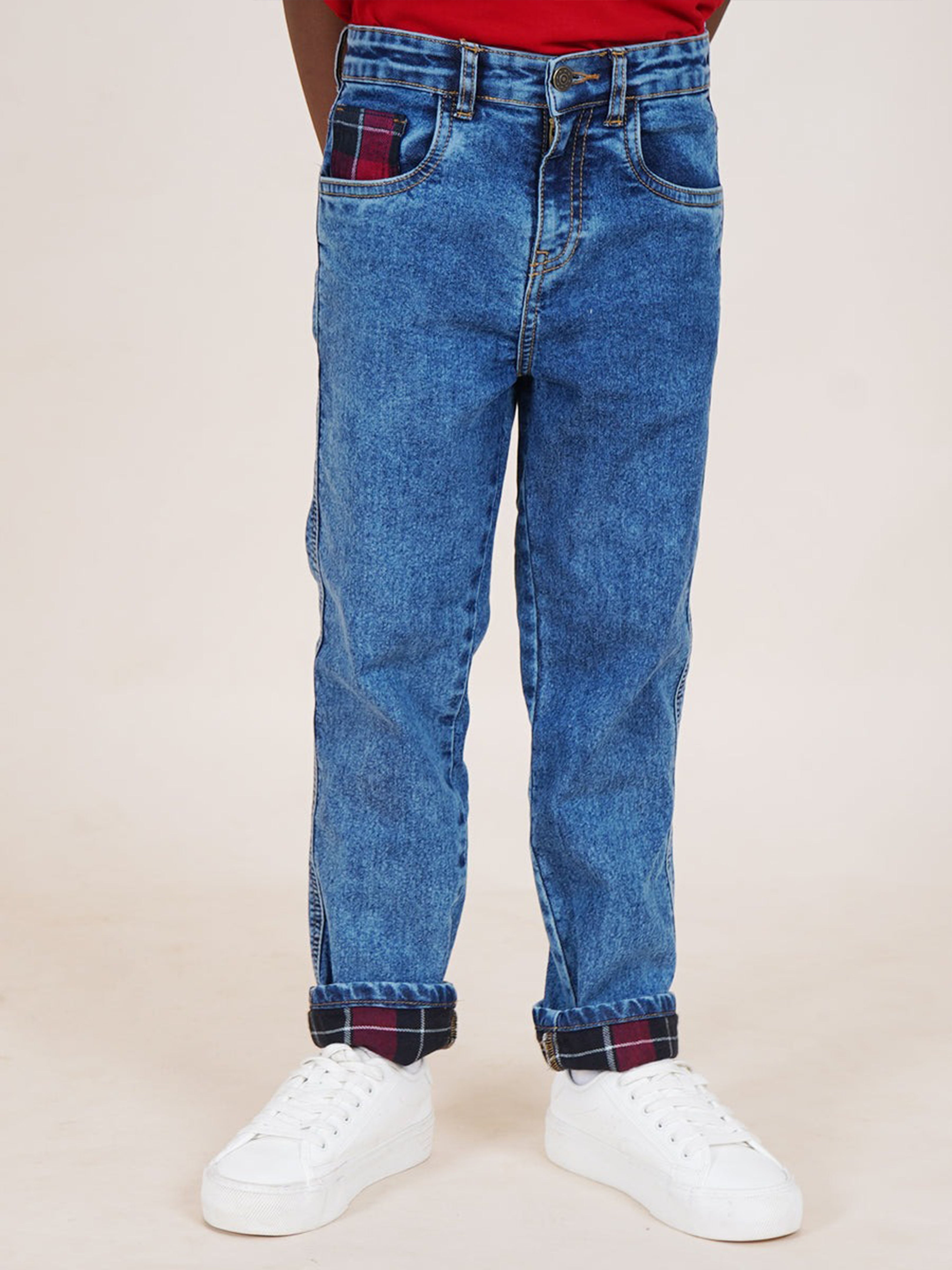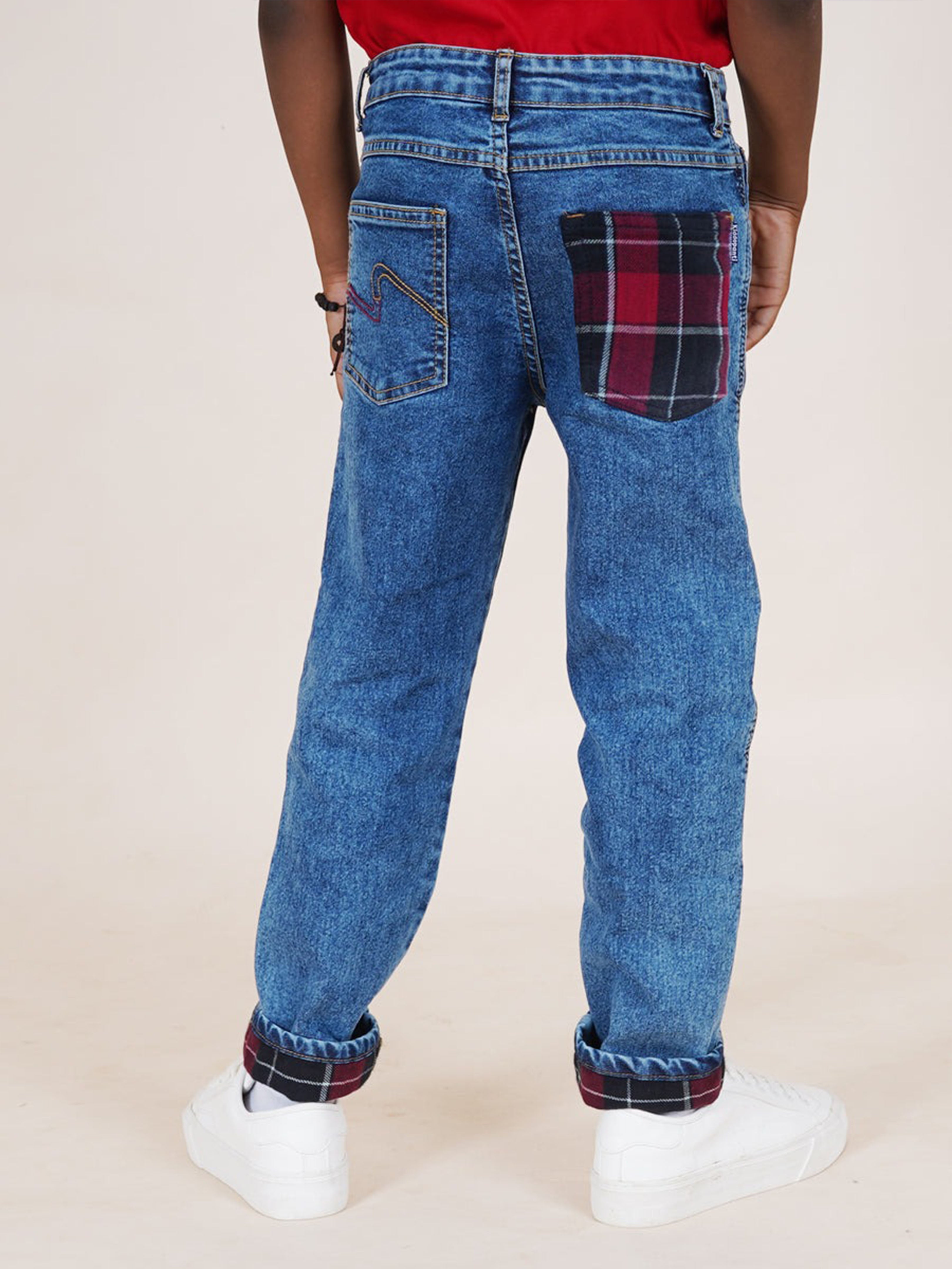 Stylish contrast red check detail on roll-up hem, coin pocket & back pocket