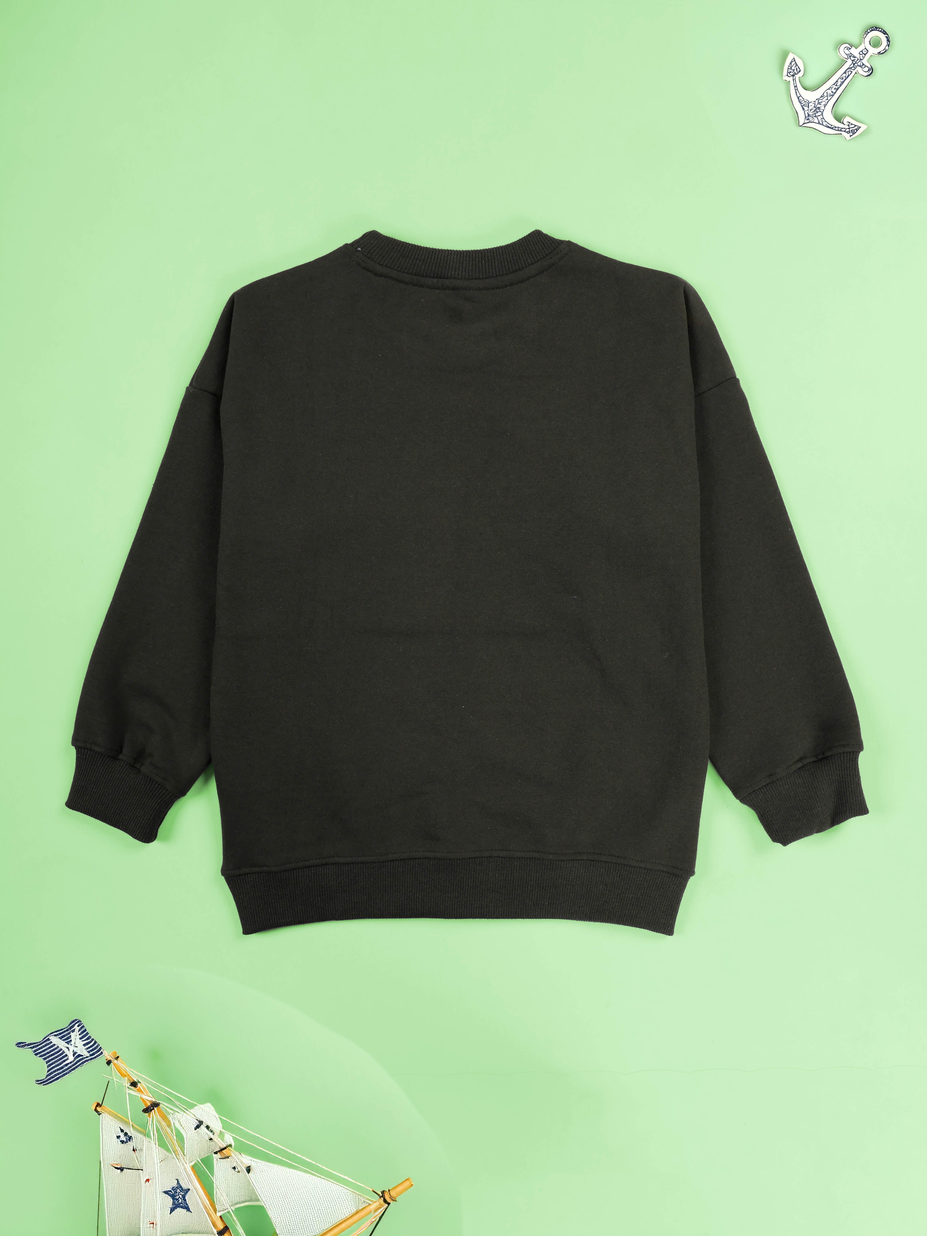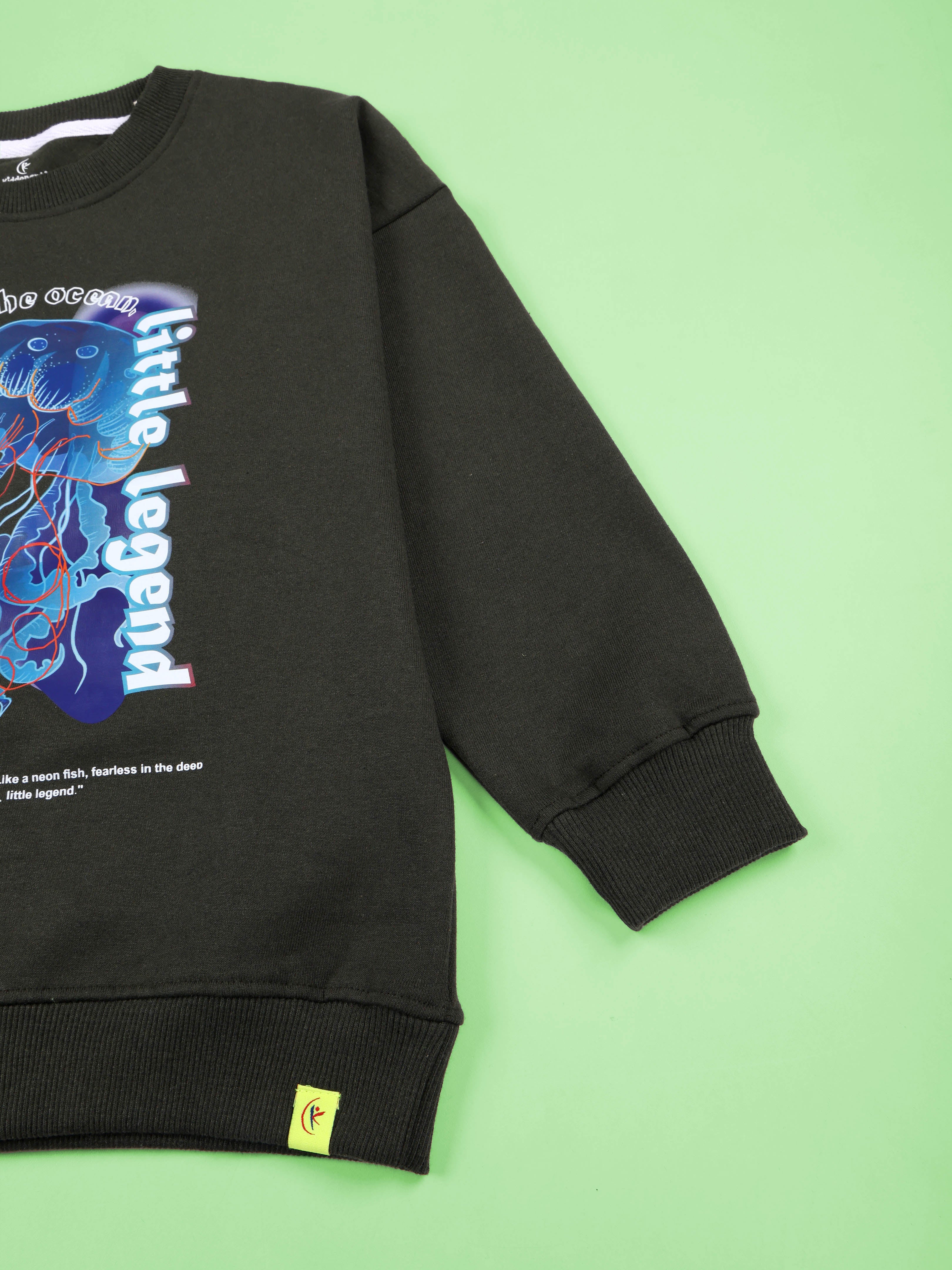 Kiddopanti takes kids on a journey of imagination with the Deep-Sea Cosmic Combo Set, designed for little legends who shine bright and dream deep. This outfit pairs a neon jellyfish sweatshirt with classic solid fleece joggers, creating a look that’s equal parts playful, cozy, and effortlessly cool. The sweatshirt is a standout piece, featuring a radiant jellyfish surrounded by glowing cosmic typography like “Little Legend” and “Glow Within the Cosmic”. Crafted from soft brushed fleece, it keeps kids warm and comfortable while sparking their creativity with every wear.Balancing the bold top, the solid trackpants offer practical ease with an elasticated waistband, ribbed cuffs, and side pockets—crafted in a cotton-poly fleece blend for warmth and durability. Perfect for school days, weekend outings, or playtime, this set is a must-have for adventurous spirits.