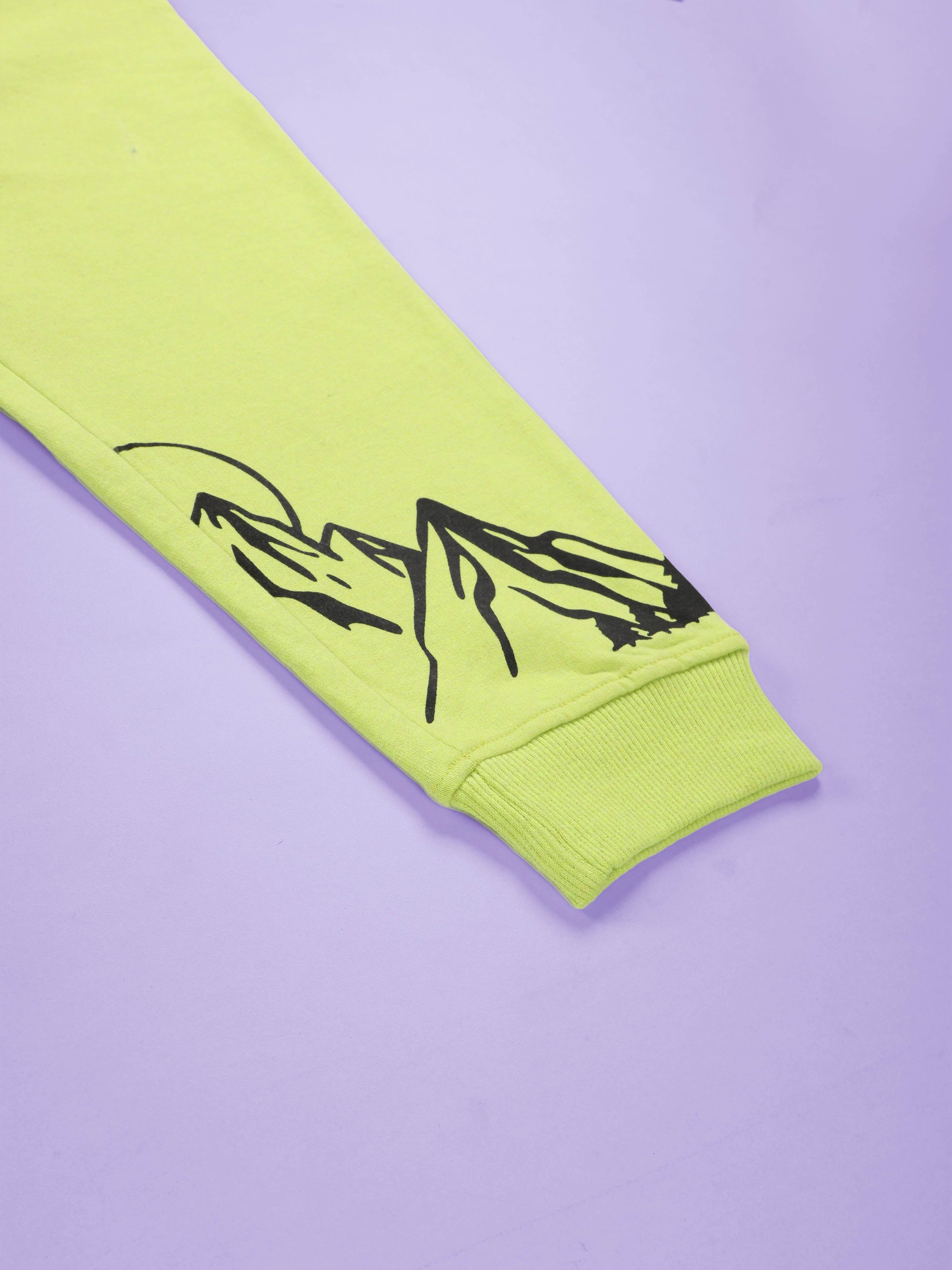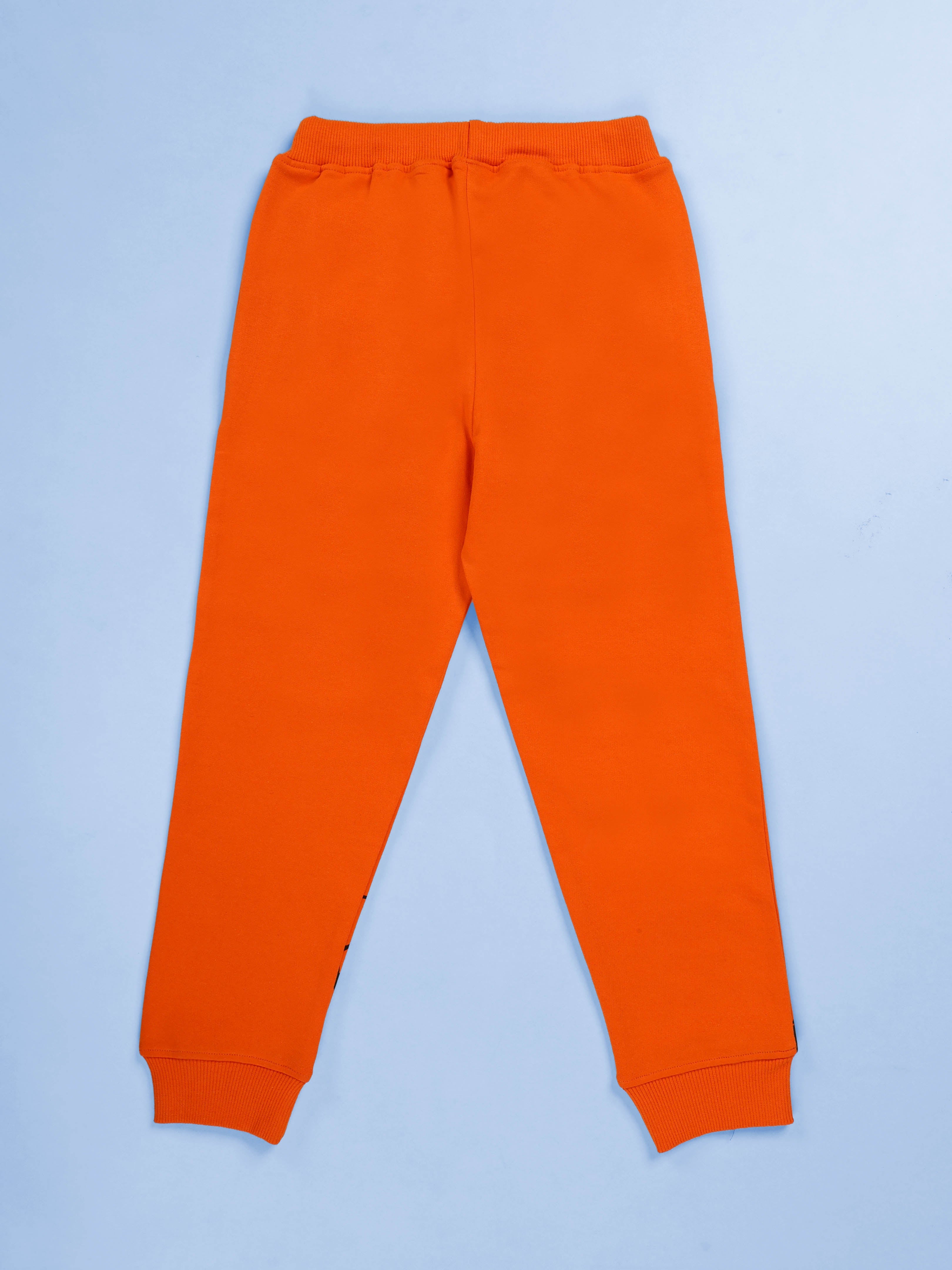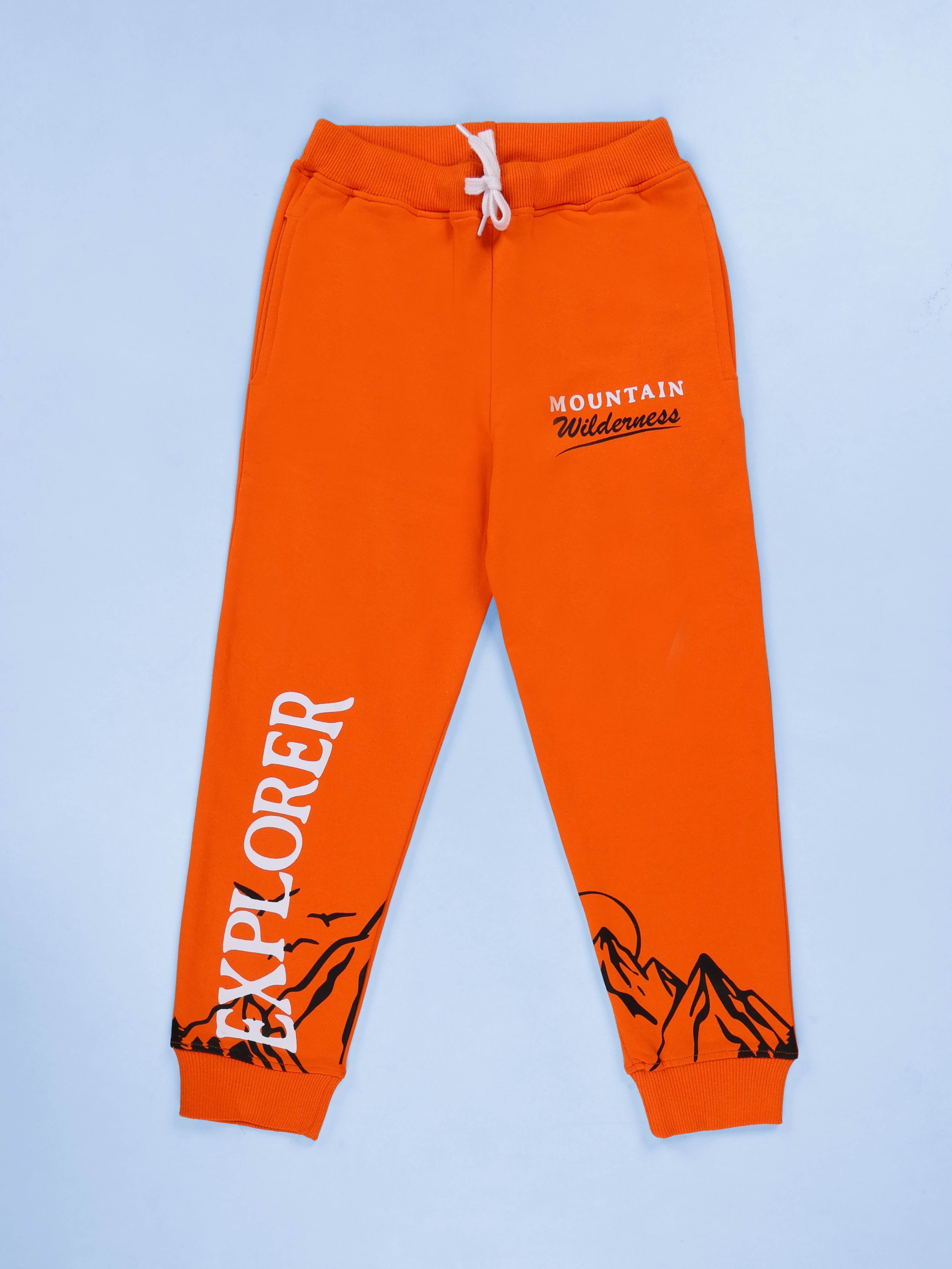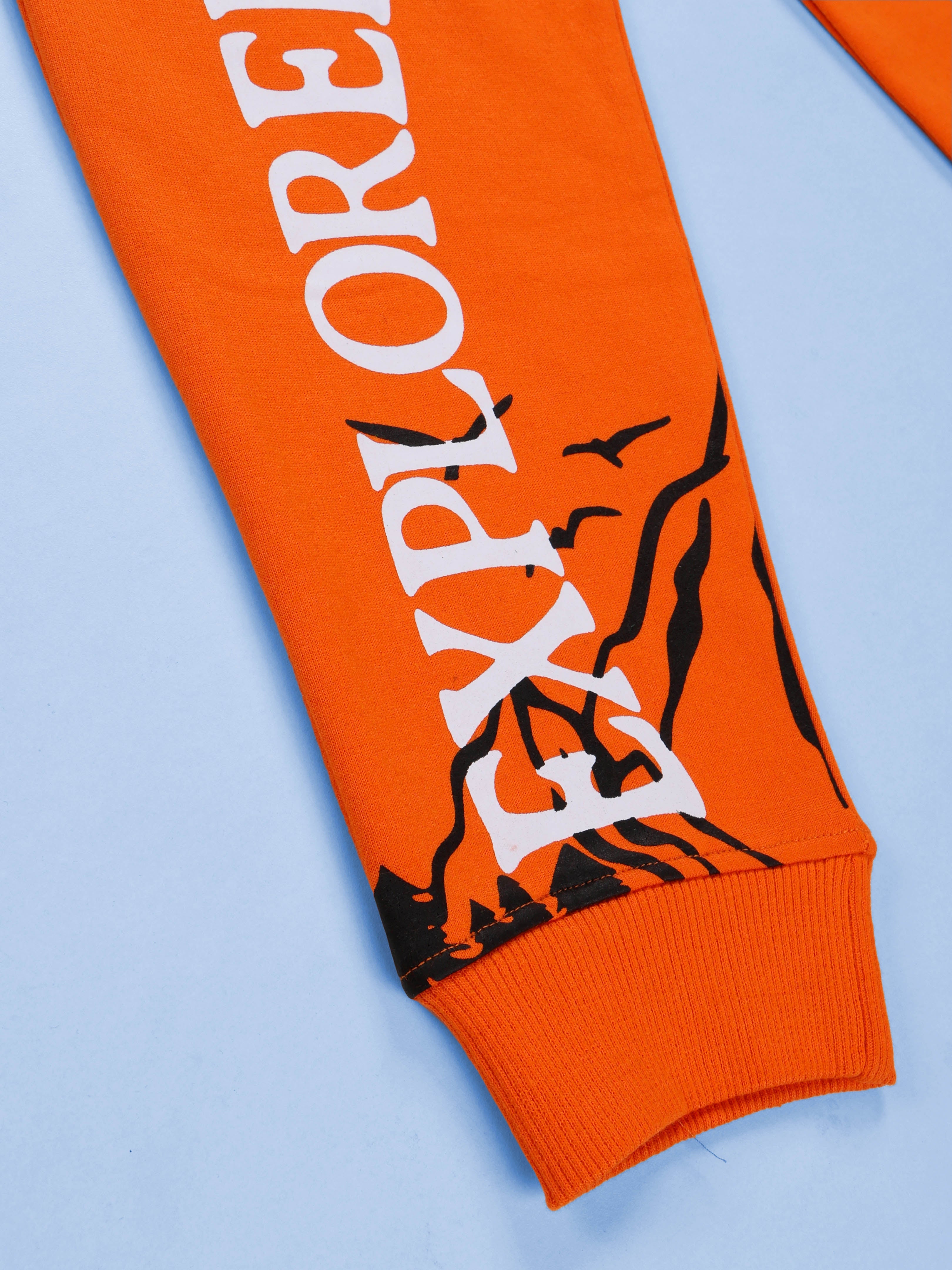 Kiddopanti fuels the spirit of exploration with the Mountain Explorer Combo Set, crafted for boys who dream big and move freely. This adventurous outfit pairs a stunning ombré hoodie with bold graphic joggers, bringing together cozy fleece warmth and outdoorsy personality—perfect for school days, family trips, or weekend hikes. The hoodie is a showstopper with its white-to-orange gradient fade, scenic mountain sunrise illustration, and bold sleeve text reading “EXPLORER.” A chest detail “Mountain Wilderness” adds authenticity, while the functional sleeve zipper pocket brings both utility and street-cool flair. Made with insulating fleece knit, it ensures lasting comfort and warmth. The trackpants match the theme with their vibrant orange base, “EXPLORER” text, and mountain graphics along the leg. Designed in cotton-blend fleece with a ribbed drawcord waistband, side pockets, and elasticated ankle cuffs, they’re equal parts stylish and practical for active kids. Together, this combo celebrates adventure, curiosity, and confident style—a ready-to-wear set for little explorers.