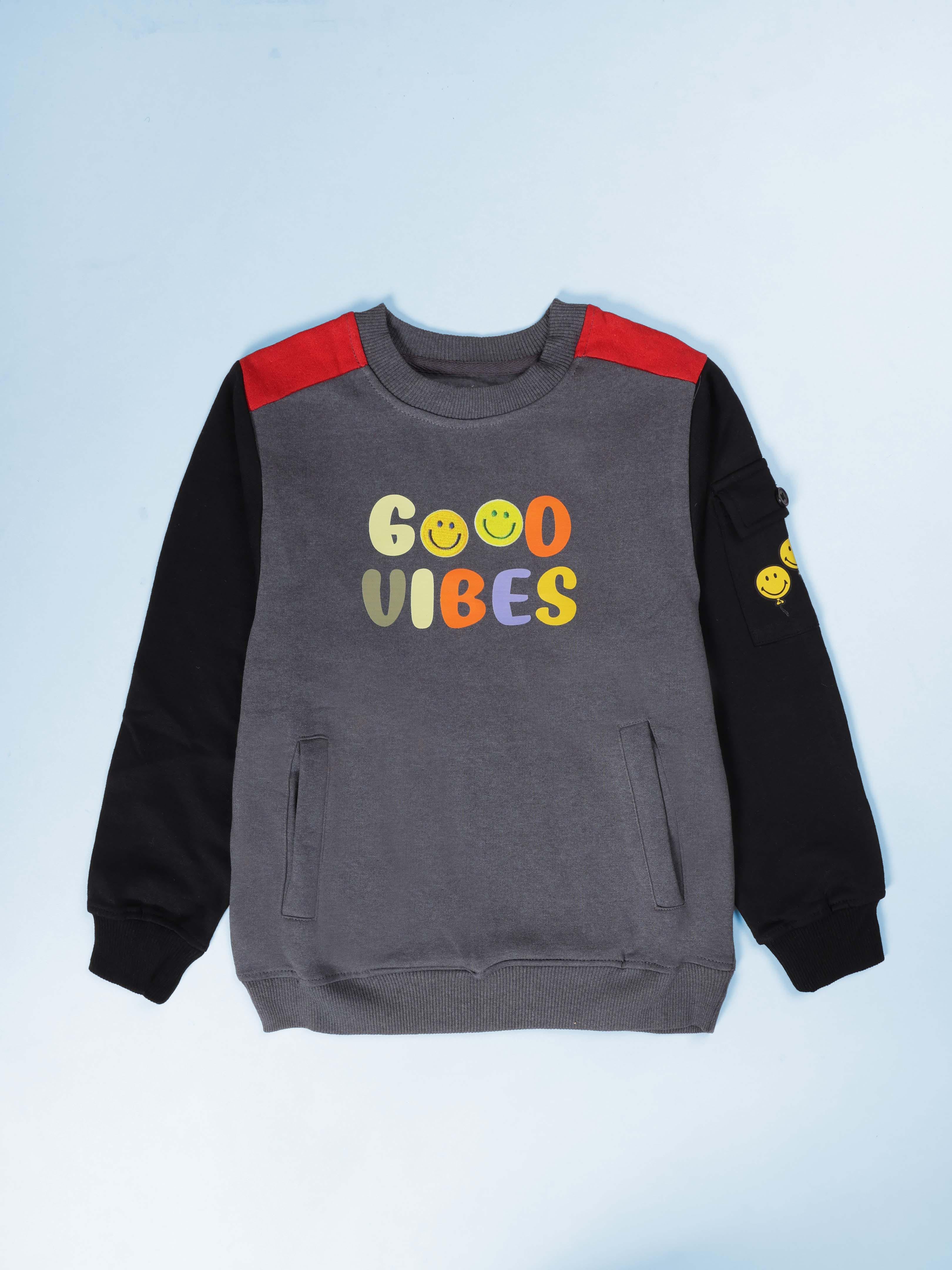 Let your young champ step out in comfort, confidence, and good vibes with this stylish winter combo from Kiddopanti! Thoughtfully paired for everyday wear, this set brings together a cheerful, colour-blocked “GOOD VIBES” Fleece Sweatshirt and ultra-comfortable Solid Fleece Track Pants, making it the perfect outfit for school, playtime, outings, or cozy winter days at home. The sweatshirt features a trendy grey–black–red colourblock design topped with a multicolour “GOOD VIBES” print and cute smiley icons—just the right dose of fun positivity! Crafted from soft fleece knit fabric, it ensures warmth without compromising on breathability or comfort. Completing the look are Kiddopanti’s solid fleece jogger-style track pants. Designed with a ribbed waistband, functional drawcord, and ribbed hem, these pants offer both style and a secure fit. Whether your little one is running around or relaxing indoors, this combo guarantees ease of movement and all-day coziness. This set brings the best of winter functionality, sporty vibes, and kid-friendly style—making it an essential pick for the season!