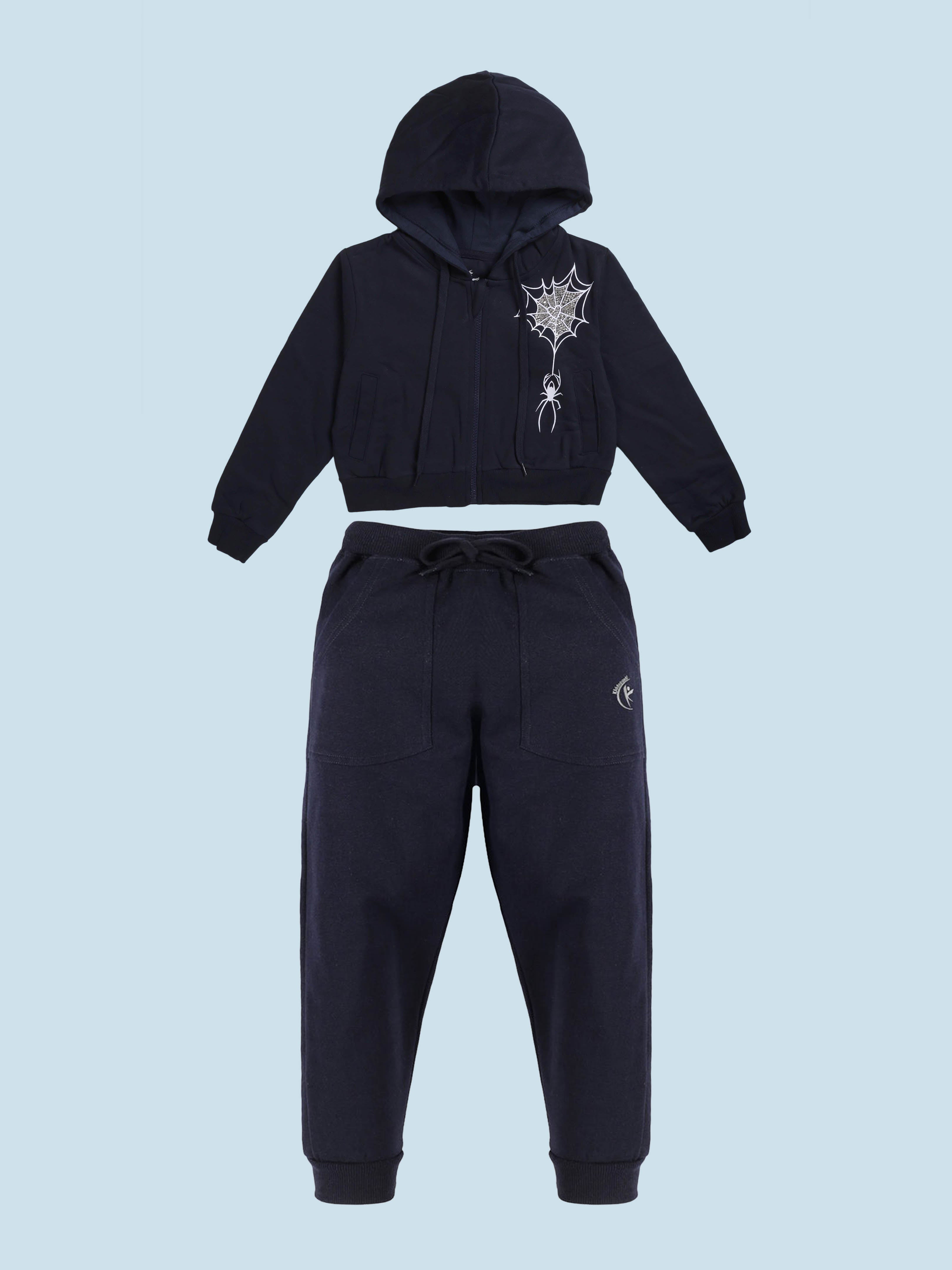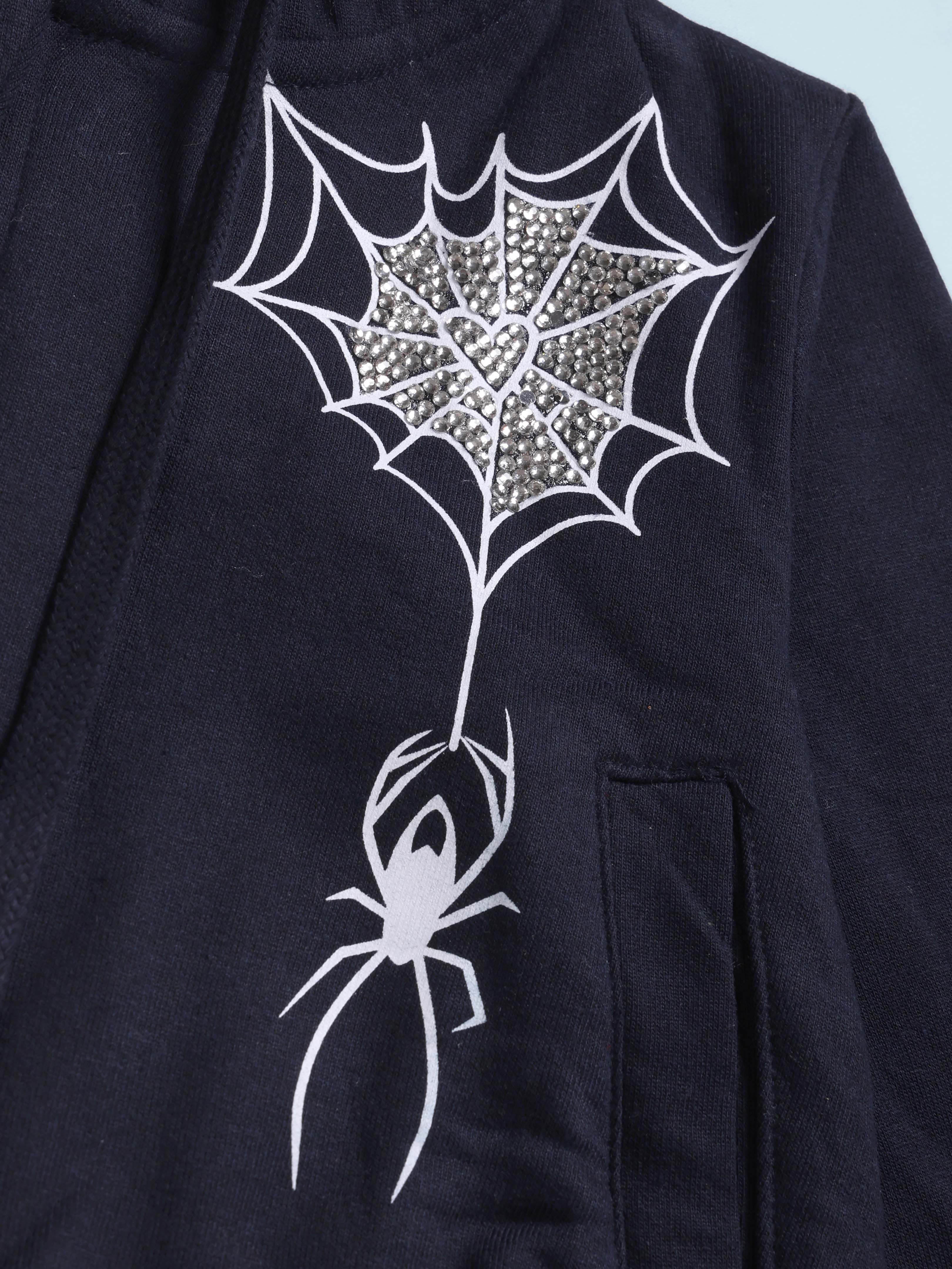 Give your little trendsetter a winter wardrobe upgrade with this dazzling and cozy Kiddopanti Combo Set, featuring a sparkly Spider Web Rhinestone Zip-Up Hoodie paired with ultra-comfortable Solid Fleece Track Pants. Designed for girls who love fashion with flair, this set blends warmth, comfort, and standout style—perfect for school, outings, playdates, and everyday winter wear. The deep navy hoodie steals the show with its shimmering rhinestone-studded spider web and sleek spider motif, adding a fun, magical twist to her look. Crafted from soft cotton-poly fleece, it offers cozy warmth and a gentle feel on the skin. The full-front zipper and hood with drawcord make it practical and stylish, while ribbed cuffs ensure a snug fit. Balancing the sparkle on top, the fleece track pants offer comfort-driven design with a ribbed waistband, functional drawcord, jogger-style hem, and handy pockets. Whether she’s lounging, playing, or stepping out, this combo keeps her comfy, warm, and fashion-ready. This trendy pairing delivers everything today’s moms value: durability, ease, versatility, and a stylish touch that kids love!
