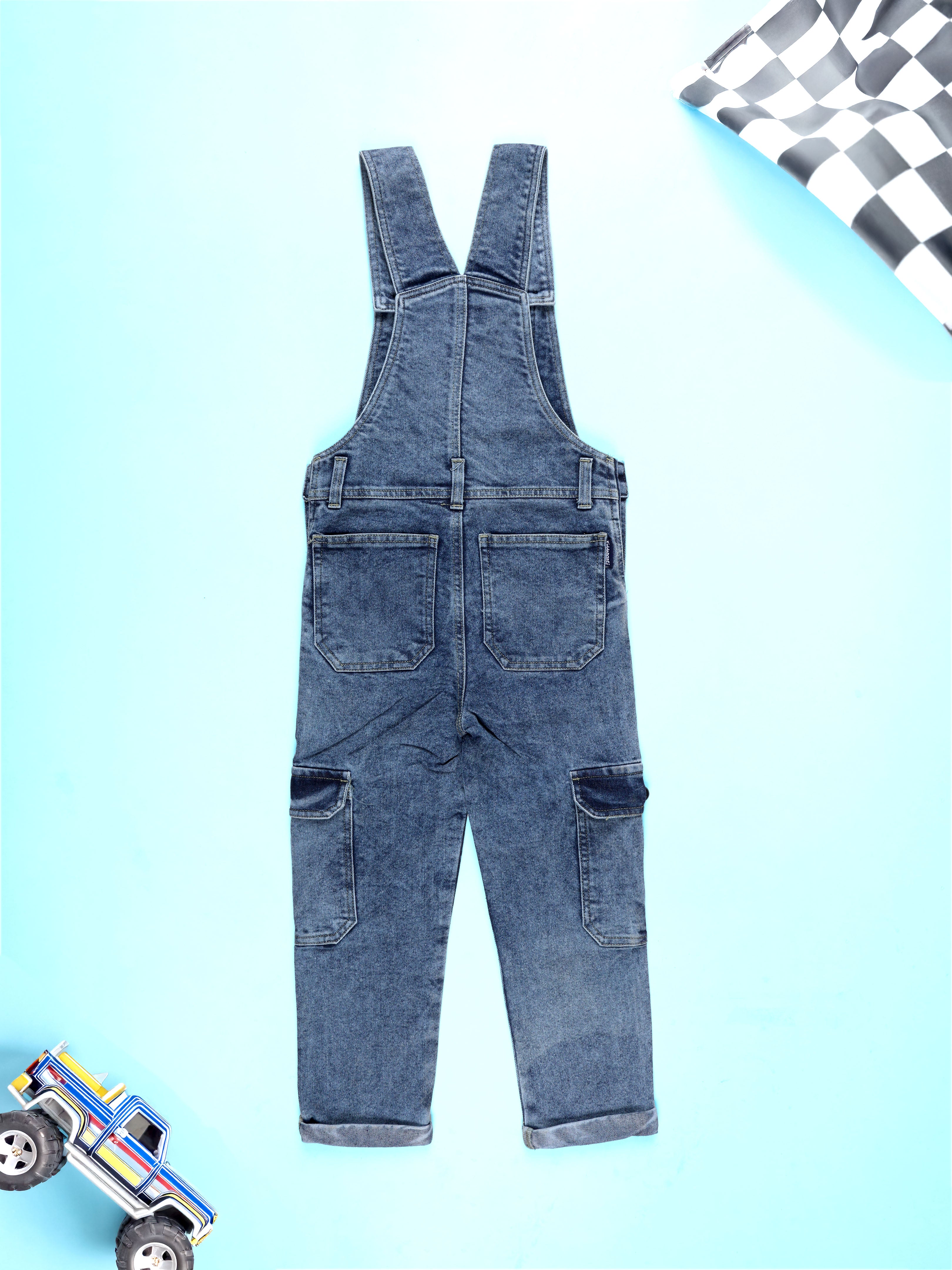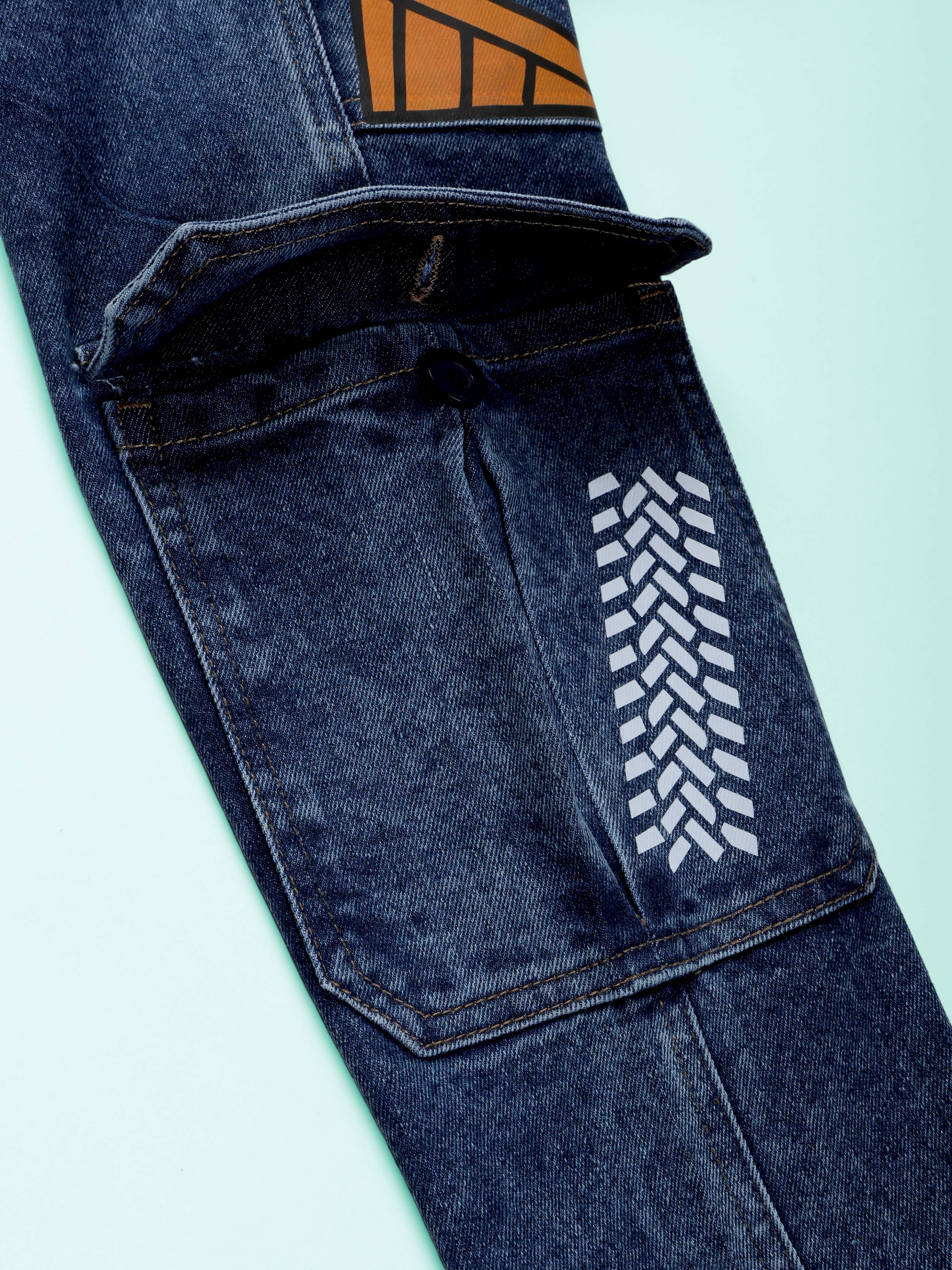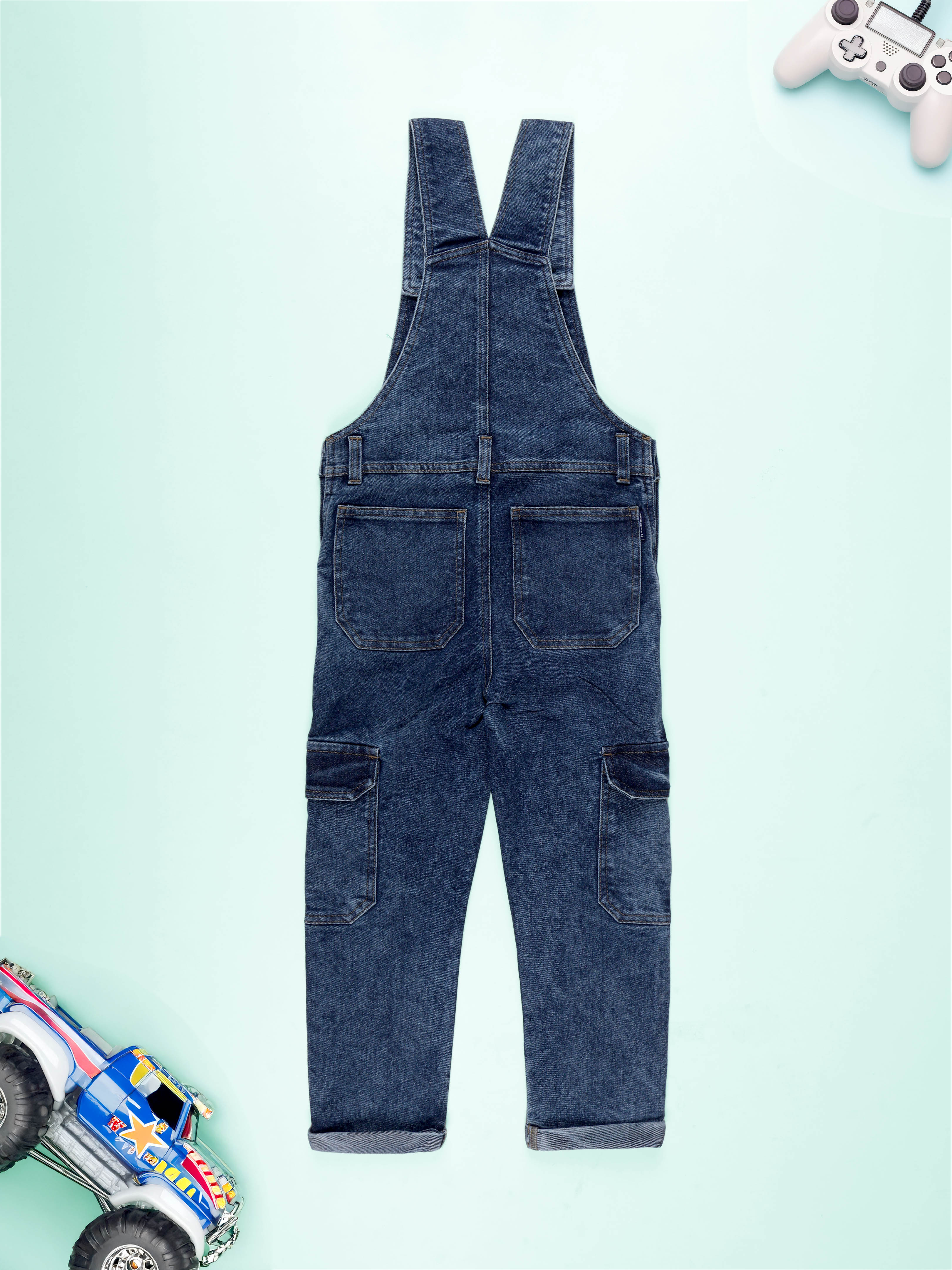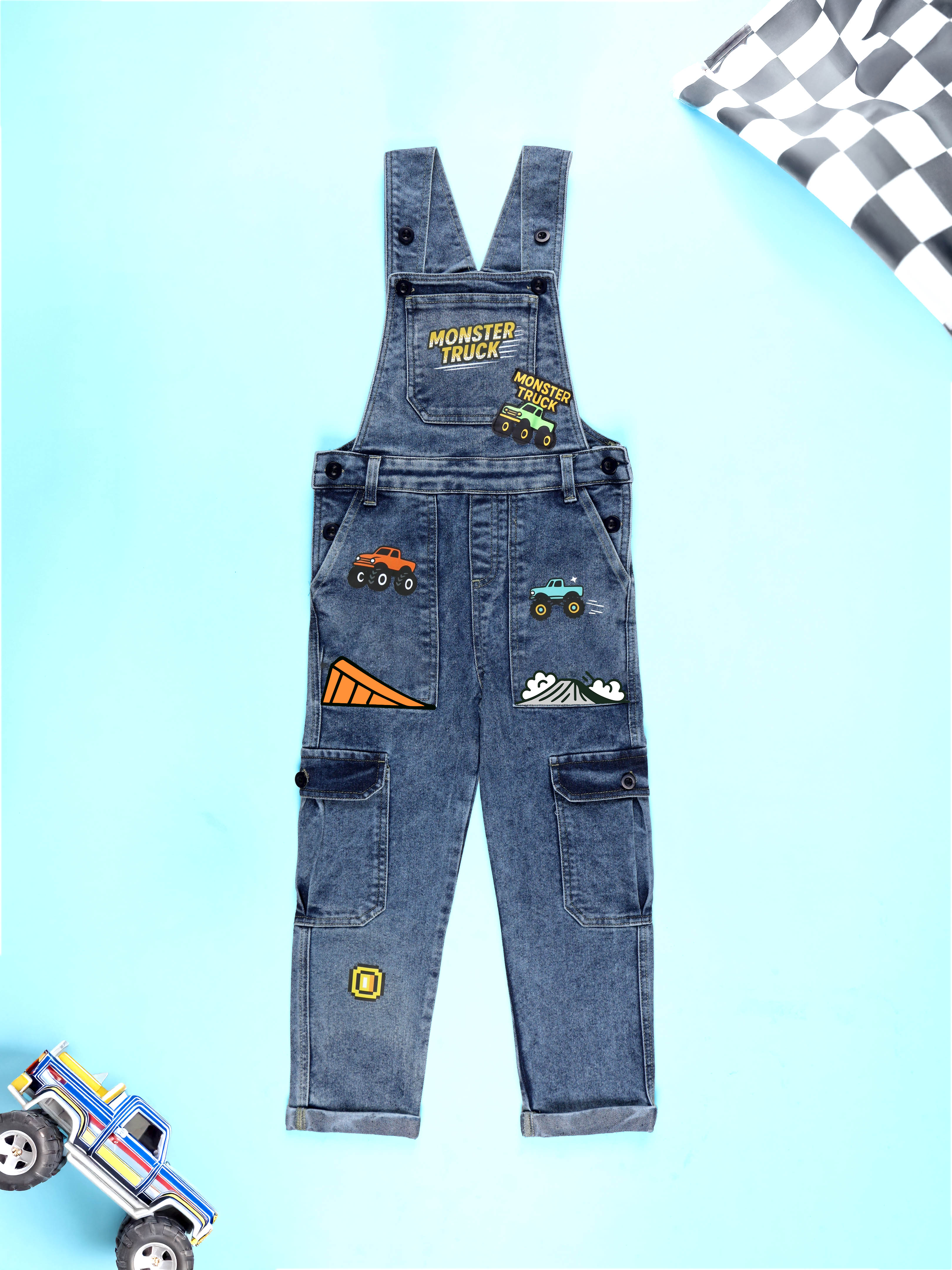 Kiddopanti Boys Denim Gaming and Monstar Truck Printed Dungaree Pant With Cargo Pockets