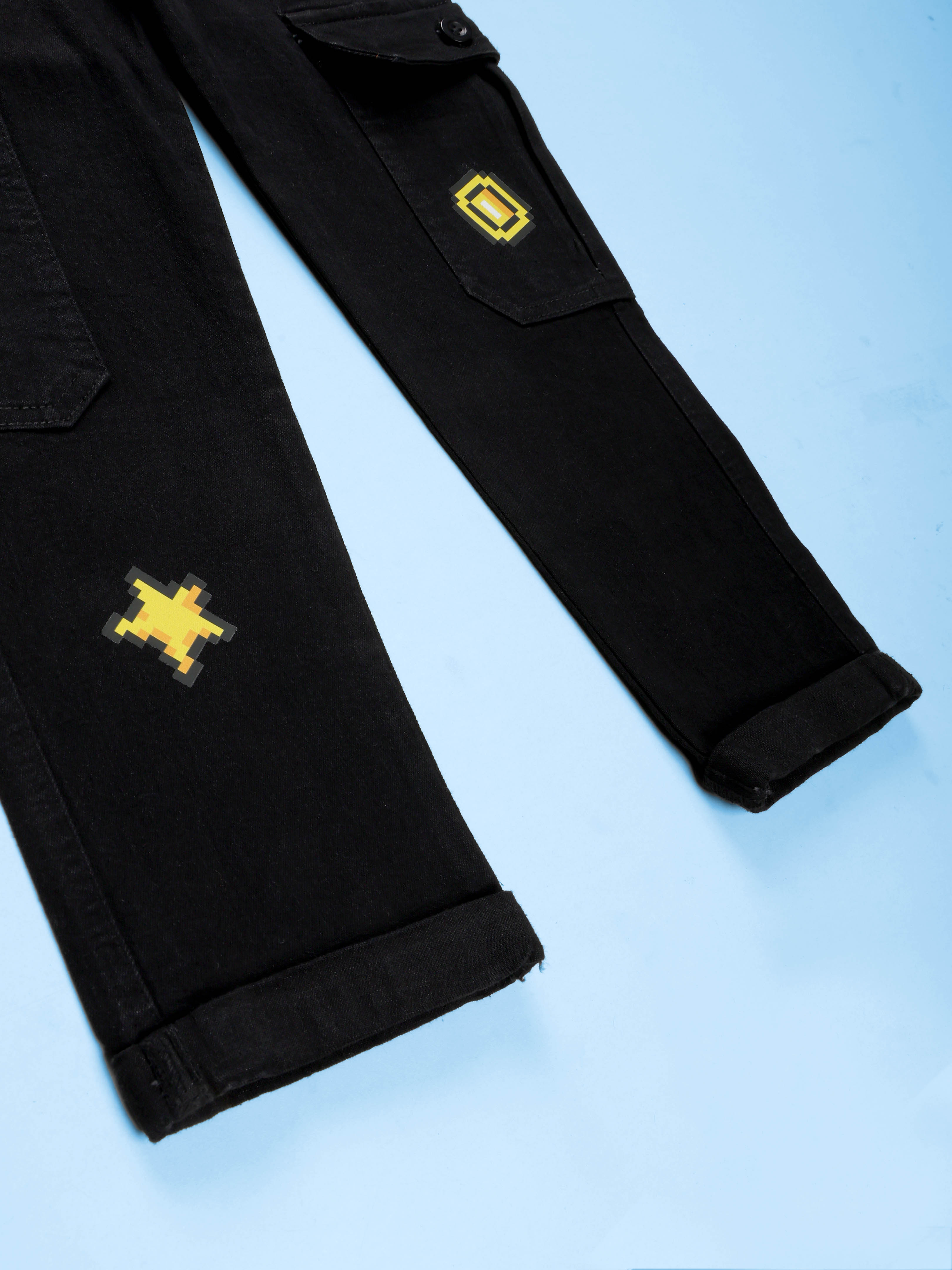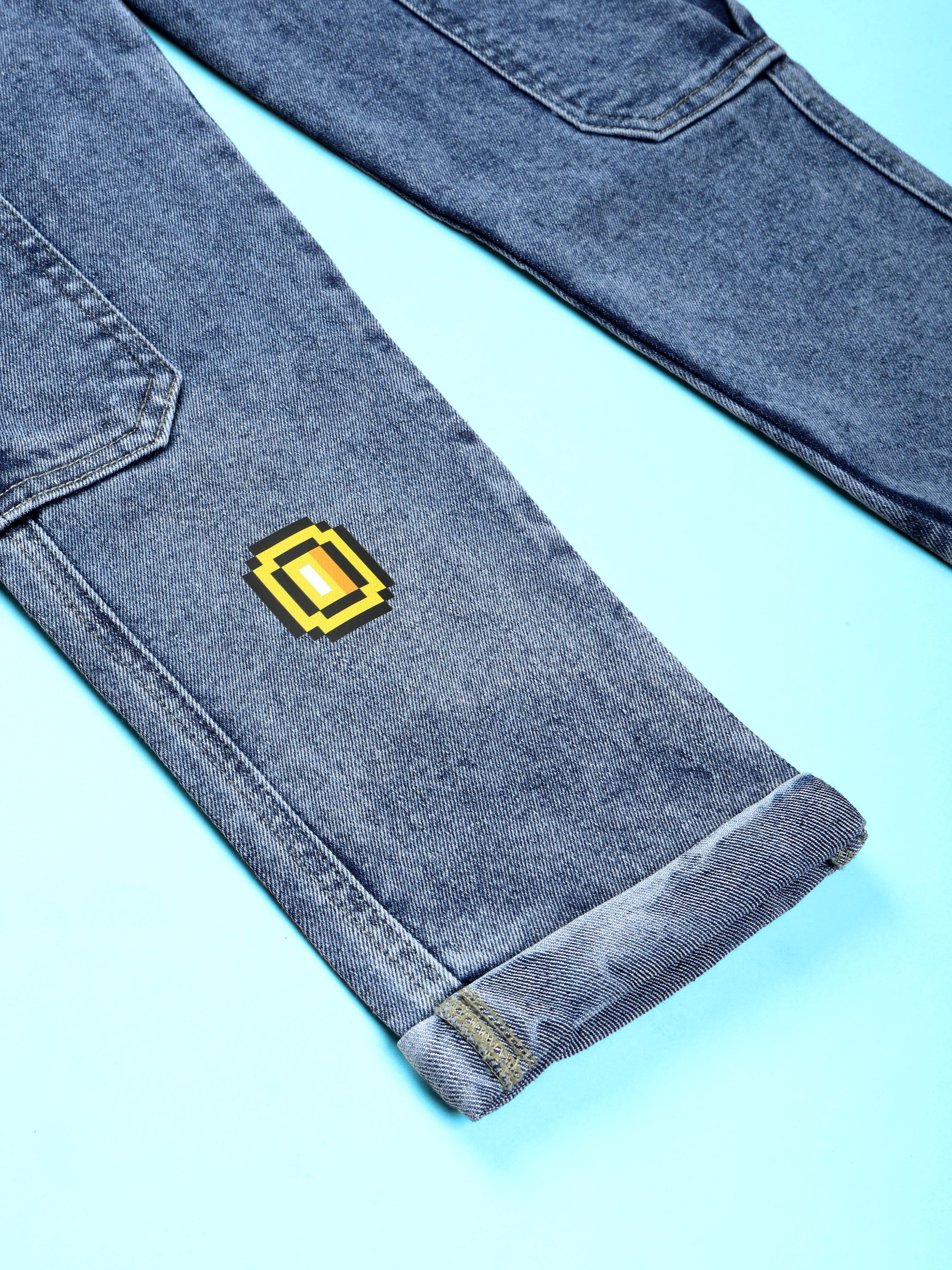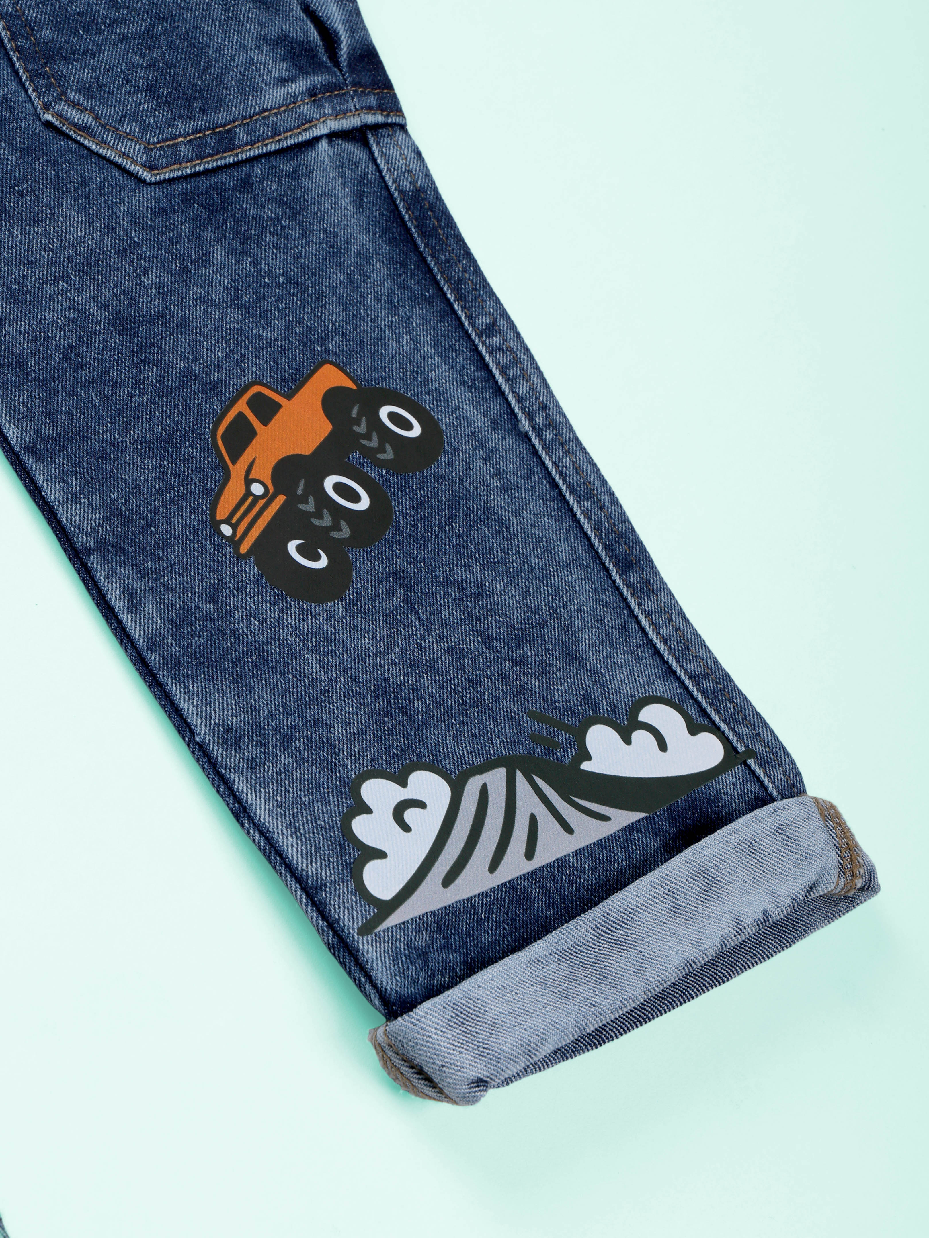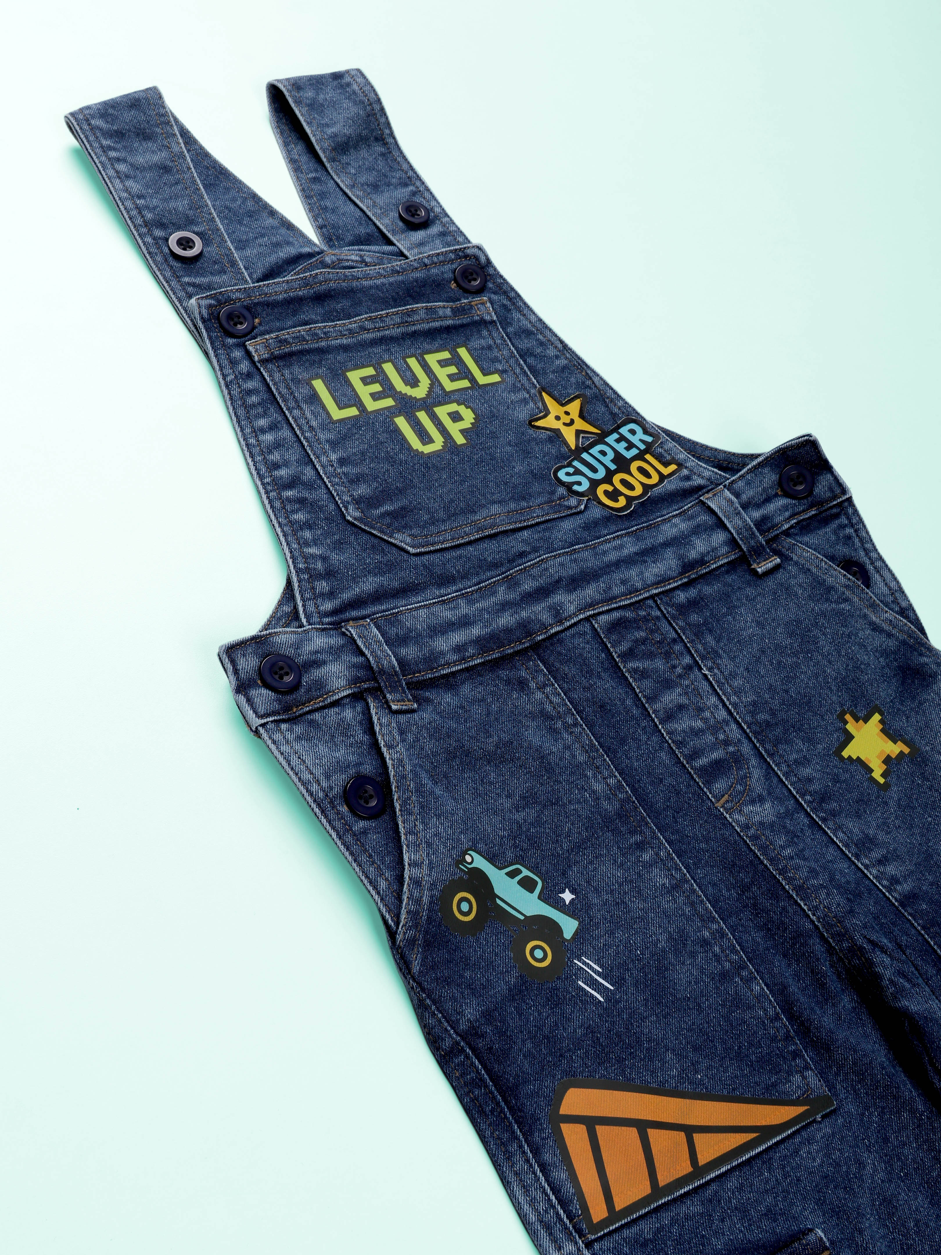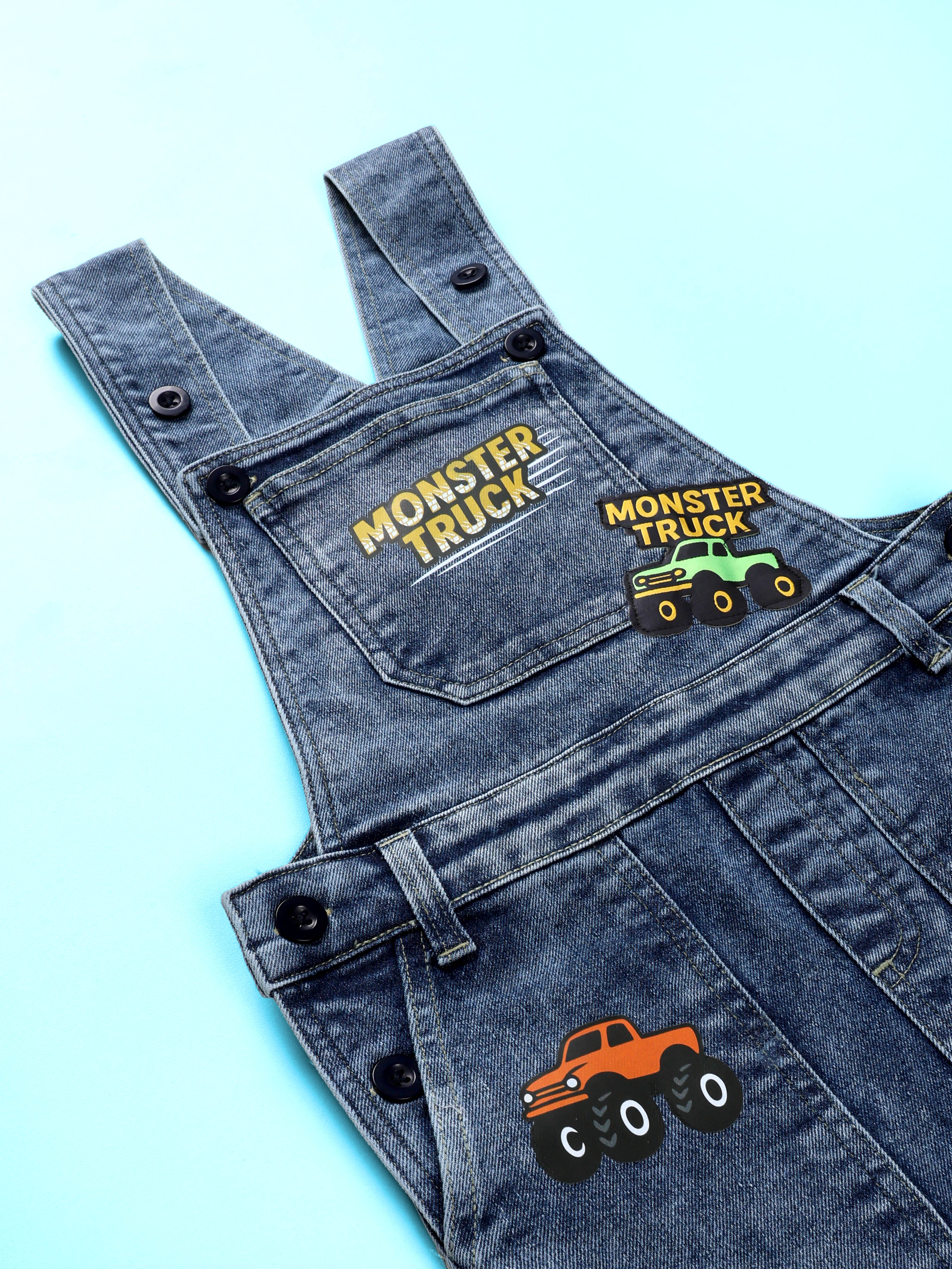 Kiddopanti Boys Denim Gaming and Monstar Truck Printed Dungaree Pant With Cargo Pockets