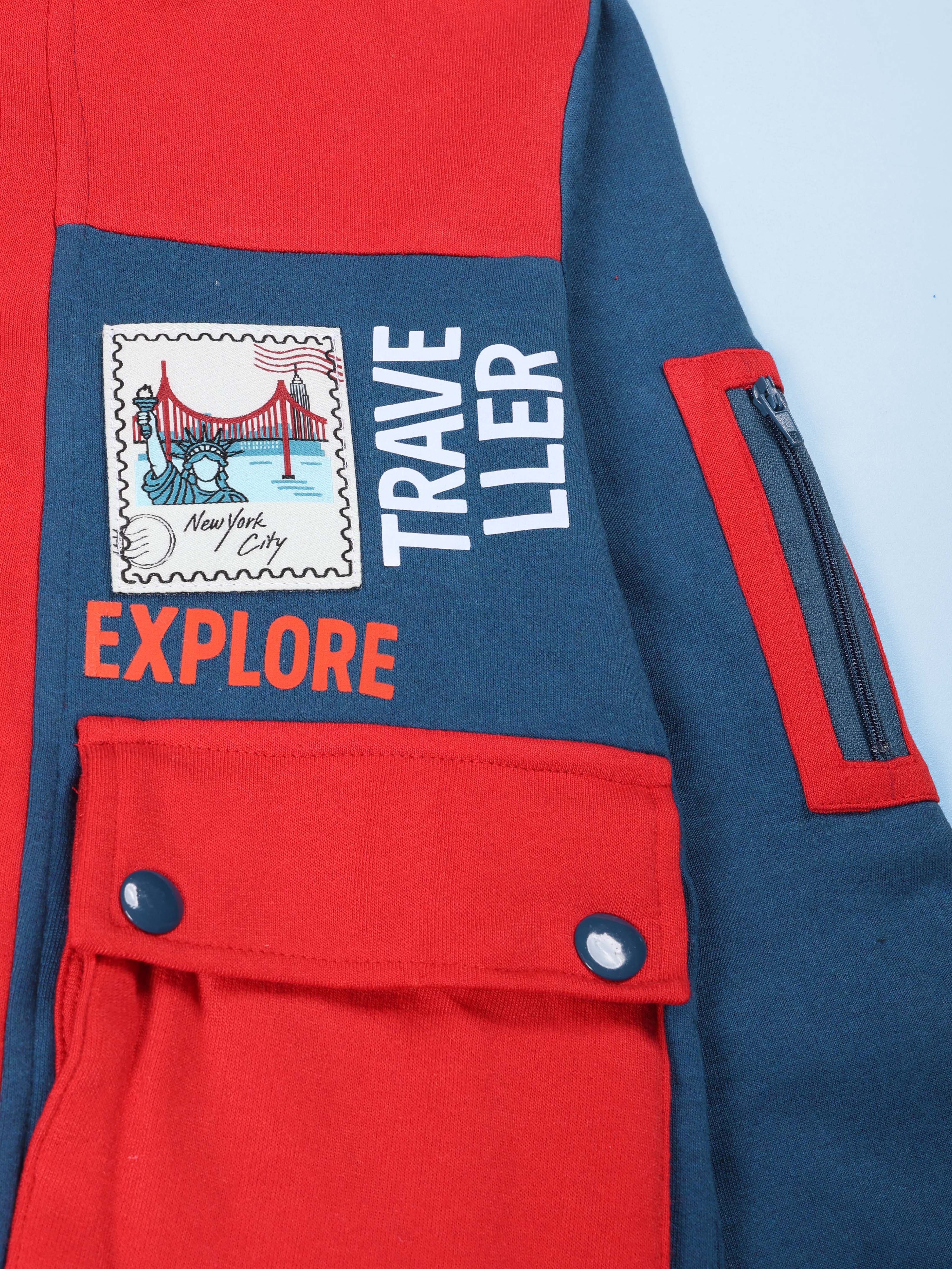 Let your young explorer step into adventure-ready style with this Kiddopanti Explore & Travel Winter Combo! Thoughtfully paired for comfort, warmth, and everyday action, this set includes a bold Travel-Themed Colourblock Hoodie Jacket and cozy Solid Fleece Track Pants β the perfect winter outfit for school, outings, and playful discovery. The Explore & Travel Hoodie Jacket features a striking redβblue colourblock design with an engaging travel stamp patch and βEXPLOREβ graphic that sparks curiosity in every little adventurer. Crafted from soft cotton-poly fleece, it offers dependable warmth, while the snap-button closure, utility pockets, and hood add both functionality and style. Paired with this is Kiddopantiβs super-comfortable fleece track pant β designed with a ribbed waistband, functional drawcord, jogger-style hem, and practical side pockets. Soft, durable, and easy to wear, these pants are perfect for active boys who love to run, roam, and explore freely. Together, this combo brings stylish adventure vibes with all-day comfort β a must-have winter essential for your little wanderer!