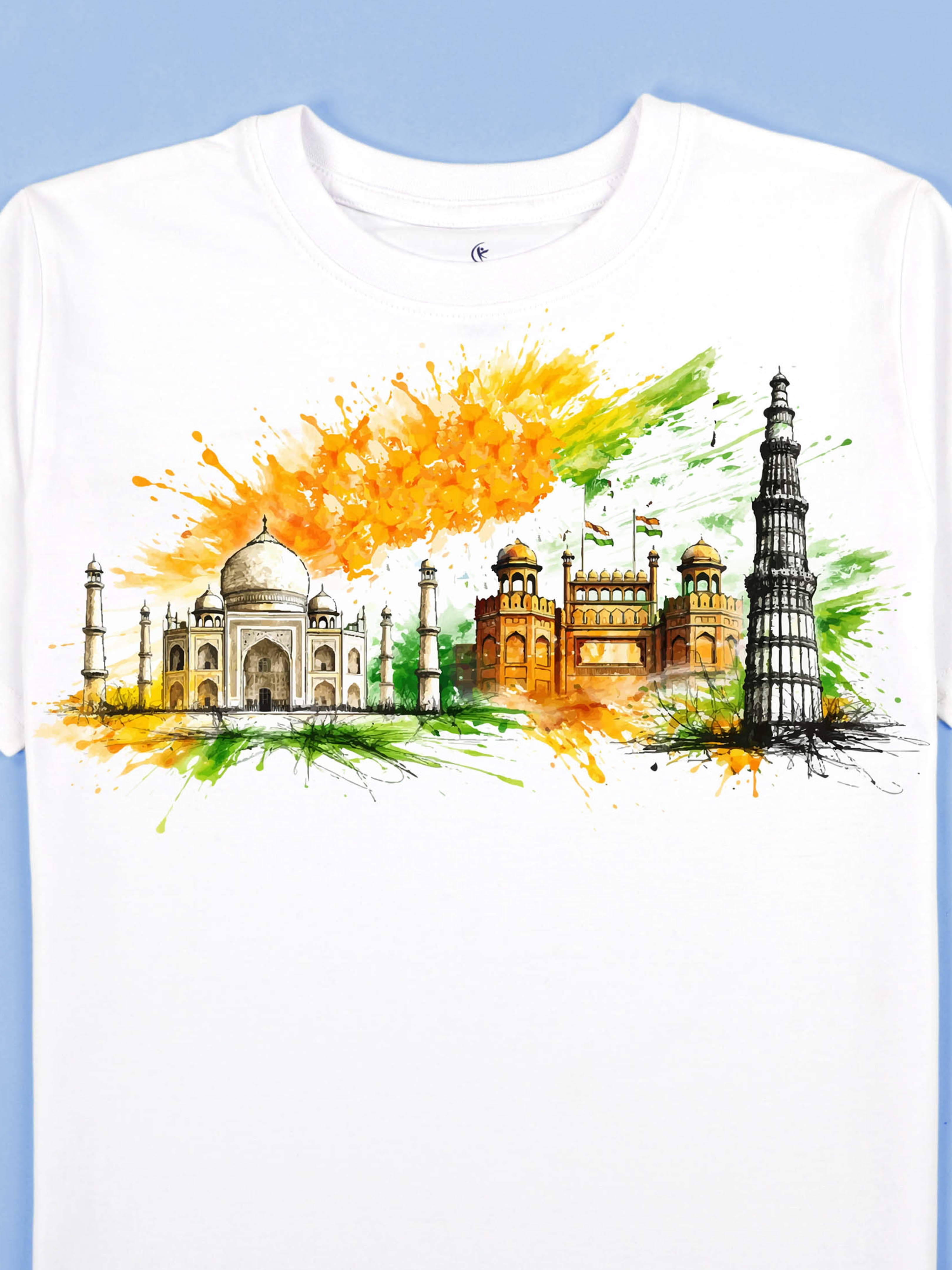 Unisex Cotton Freedom And Indian Monuments Printed Drop Shoulder Round Neck Tee