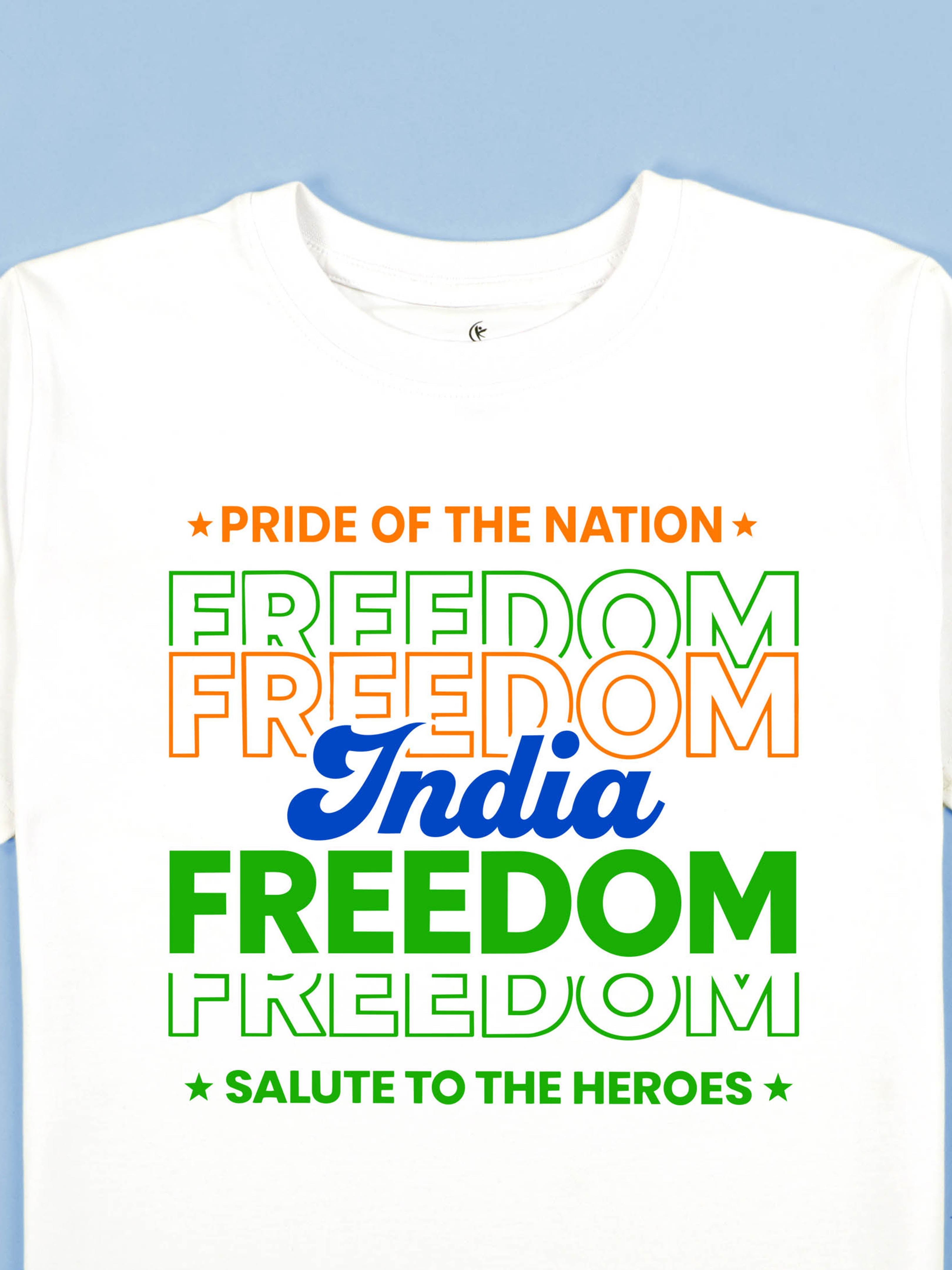 Celebrate the spirit of freedom and patriotism with this Kiddopanti Republic Day Special Graphic T-Shirt. Designed in a classic white base, this tee features a bold and inspiring “Freedom India and Indian Manument” typography artwork highlighted in trcolour hues, along with pride-filled phrases like “Pride of the Nation” and “Salute to the Heroes.” The thoughtfully layered graphic creates a strong visual impact while honouring India’s heritage in a stylish, kid-friendly way. Crafted from soft, breathable cotton fabric, this T-shirt ensures all-day comfort, making it perfect for school celebrations, patriotic events, casual outings, or festive wear around Independence Day and Republic Day. The regular fit and classic round neck design allow easy movement, keeping your little one comfortable while looking proudly patriotic.