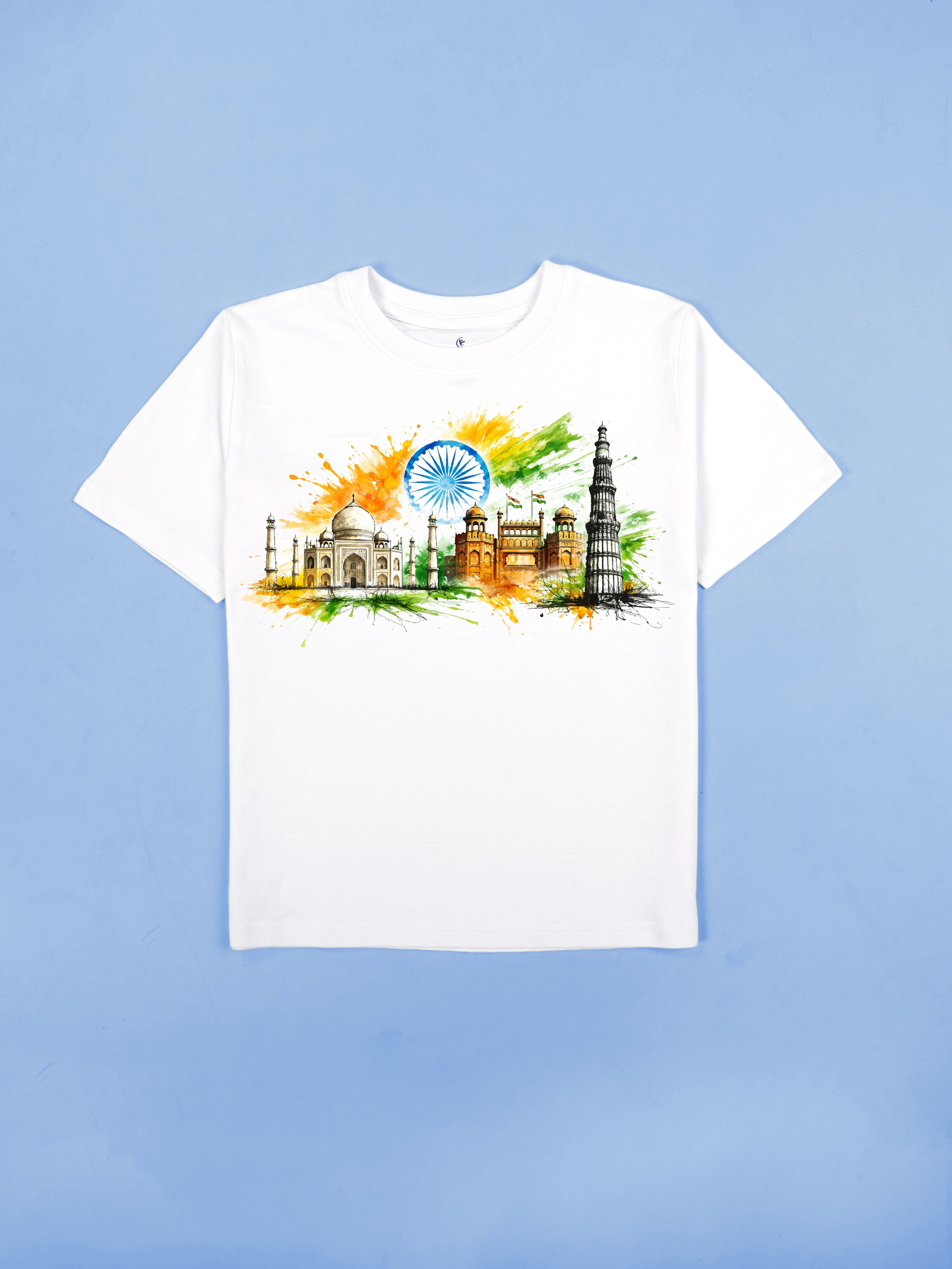 Celebrate the spirit of freedom and patriotism with this Kiddopanti Republic Day Special Graphic T-Shirt. Designed in a classic white base, this tee features a bold and inspiring “Freedom India and Indian Manumenst” typography artwork highlighted in tricolour hues, along with pride-filled phrases like “Pride of the Nation” and “Salute to the Heroes.” The thoughtfully layered graphic creates a strong visual impact while honouring India’s heritage in a stylish, kid-friendly way. Crafted from soft, breathable cotton fabric, this T-shirt ensures all-day comfort, making it perfect for school celebrations, patriotic events, casual outings, or festive wear around Independence Day and Republic Day. The regular fit and classic round neck design allow easy movement, keeping your little one comfortable while looking proudly patriotic.