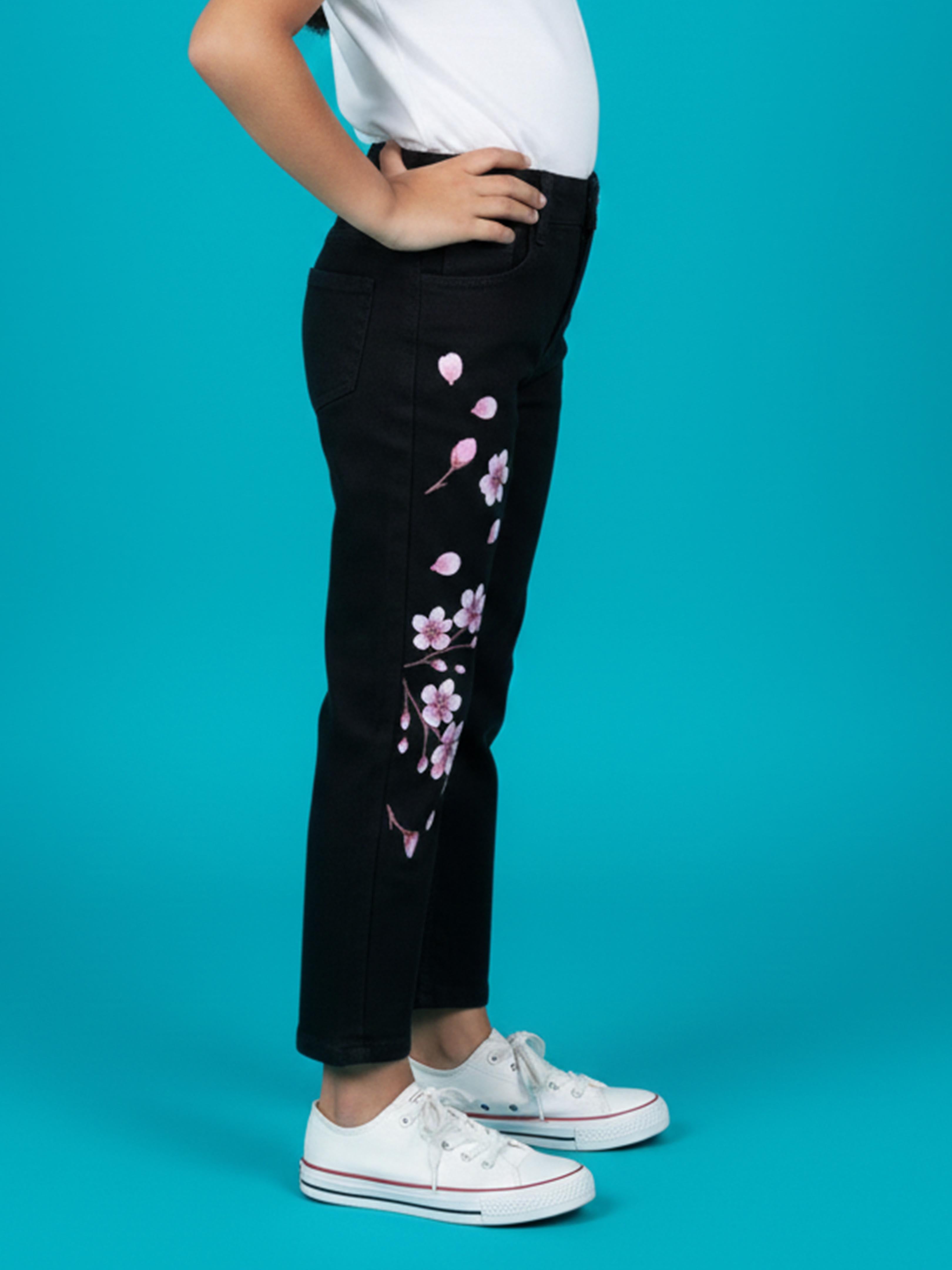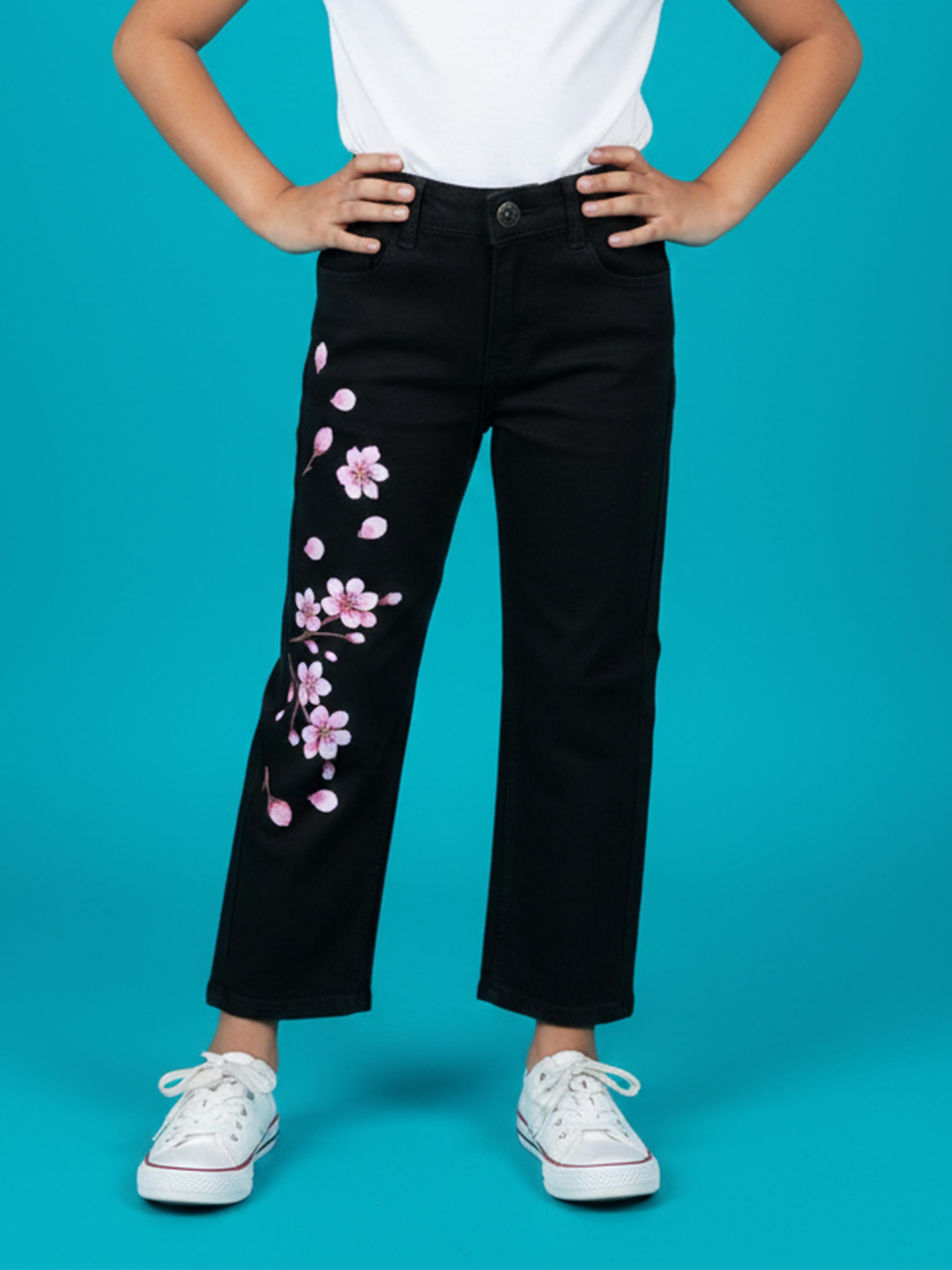 Kiddopanti brings to you the latest fashion for your smart dressing young ones. These Girls Floral Printed Denim Jeans are designed to add a stylish yet elegant touch to everyday outfits. Crafted in a classic black denim base, the jeans feature a beautiful floral print detail along one leg, giving it a trendy and graceful look. Made from soft, stretchable denim fabric, these jeans offer all-day comfort while allowing easy movement. Perfect for casual outings, parties, school wear, or festive styling, this pair blends fashion with comfort effortlessly.