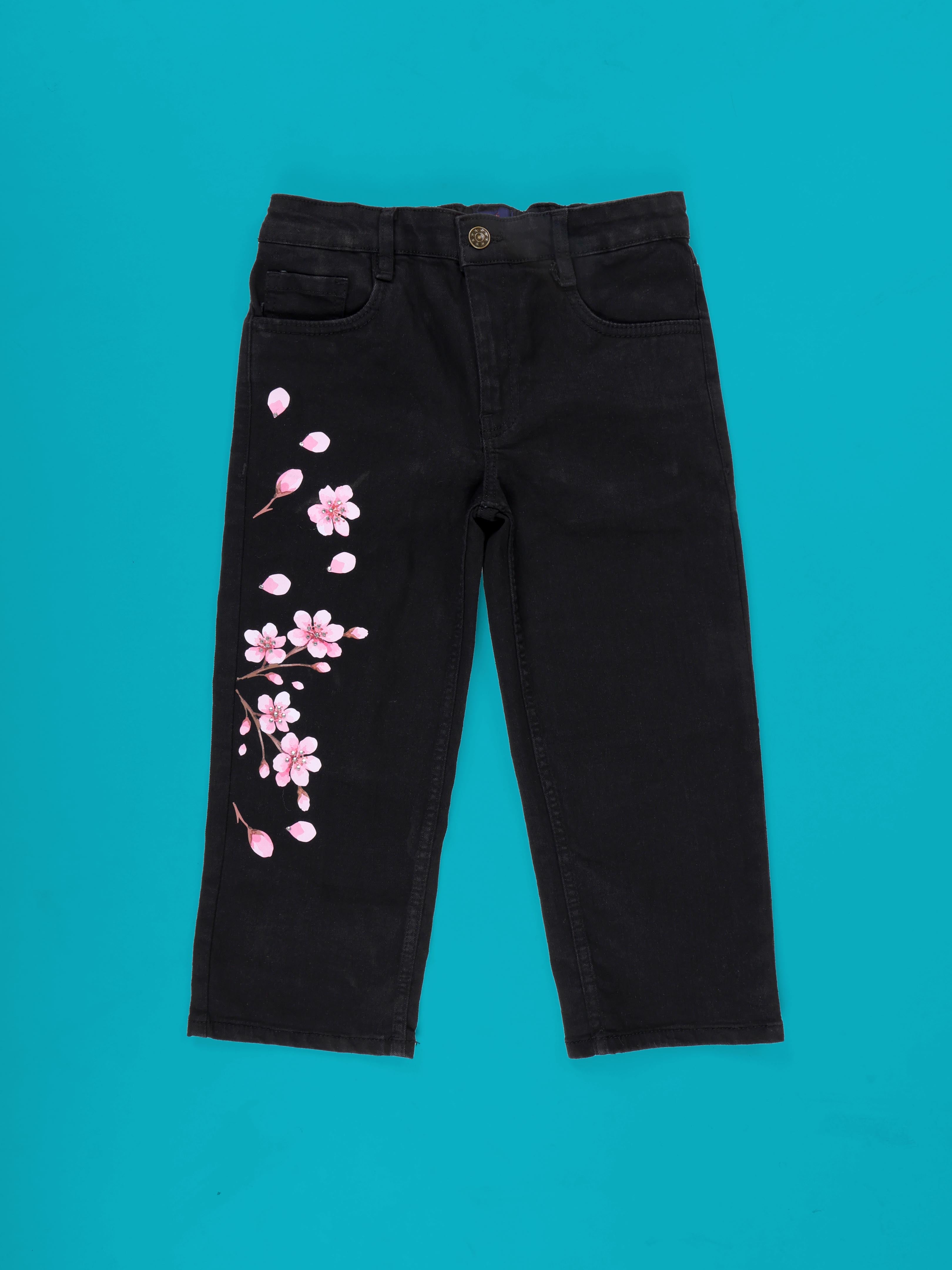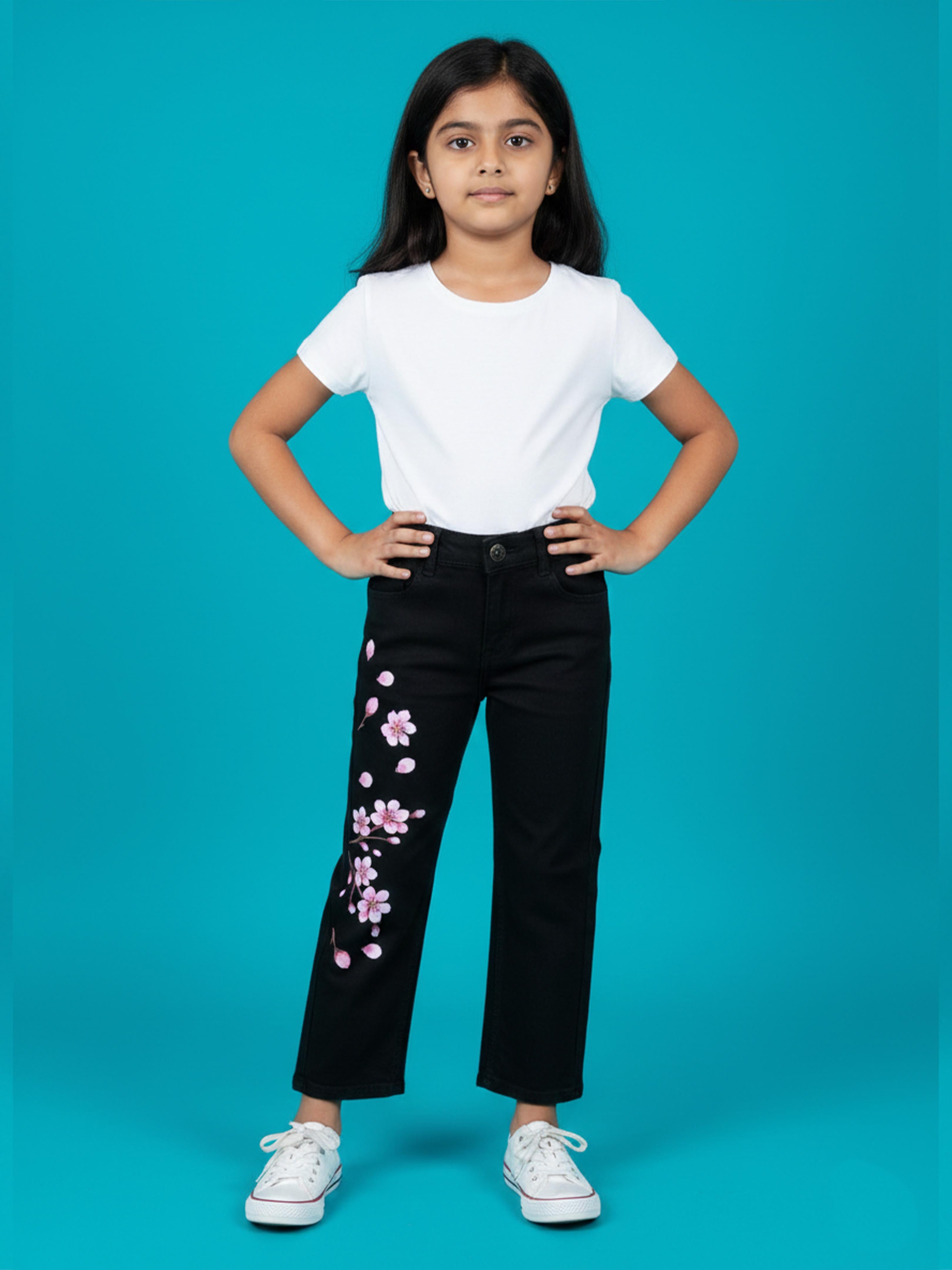 Kiddopanti brings to you the latest fashion for your smart dressing young ones. These Girls Floral Printed Denim Jeans are designed to add a stylish yet elegant touch to everyday outfits. Crafted in a classic black denim base, the jeans feature a beautiful floral print detail along one leg, giving it a trendy and graceful look. Made from soft, stretchable denim fabric, these jeans offer all-day comfort while allowing easy movement. Perfect for casual outings, parties, school wear, or festive styling, this pair blends fashion with comfort effortlessly.