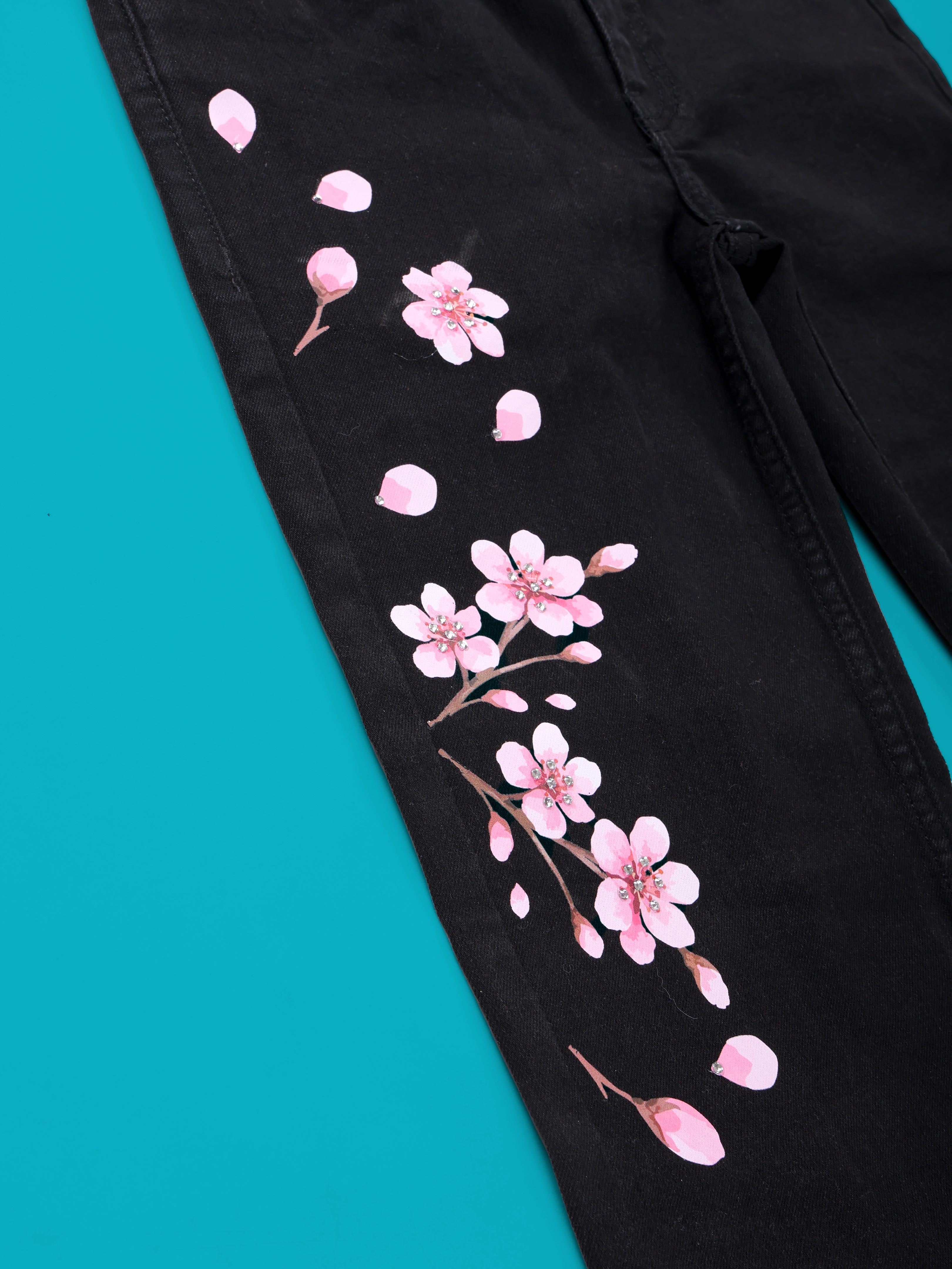 Kiddopanti Denim Woven Flower Printed Rhinestones Detailed Straight Fit Jeans With Elasticated Waistband