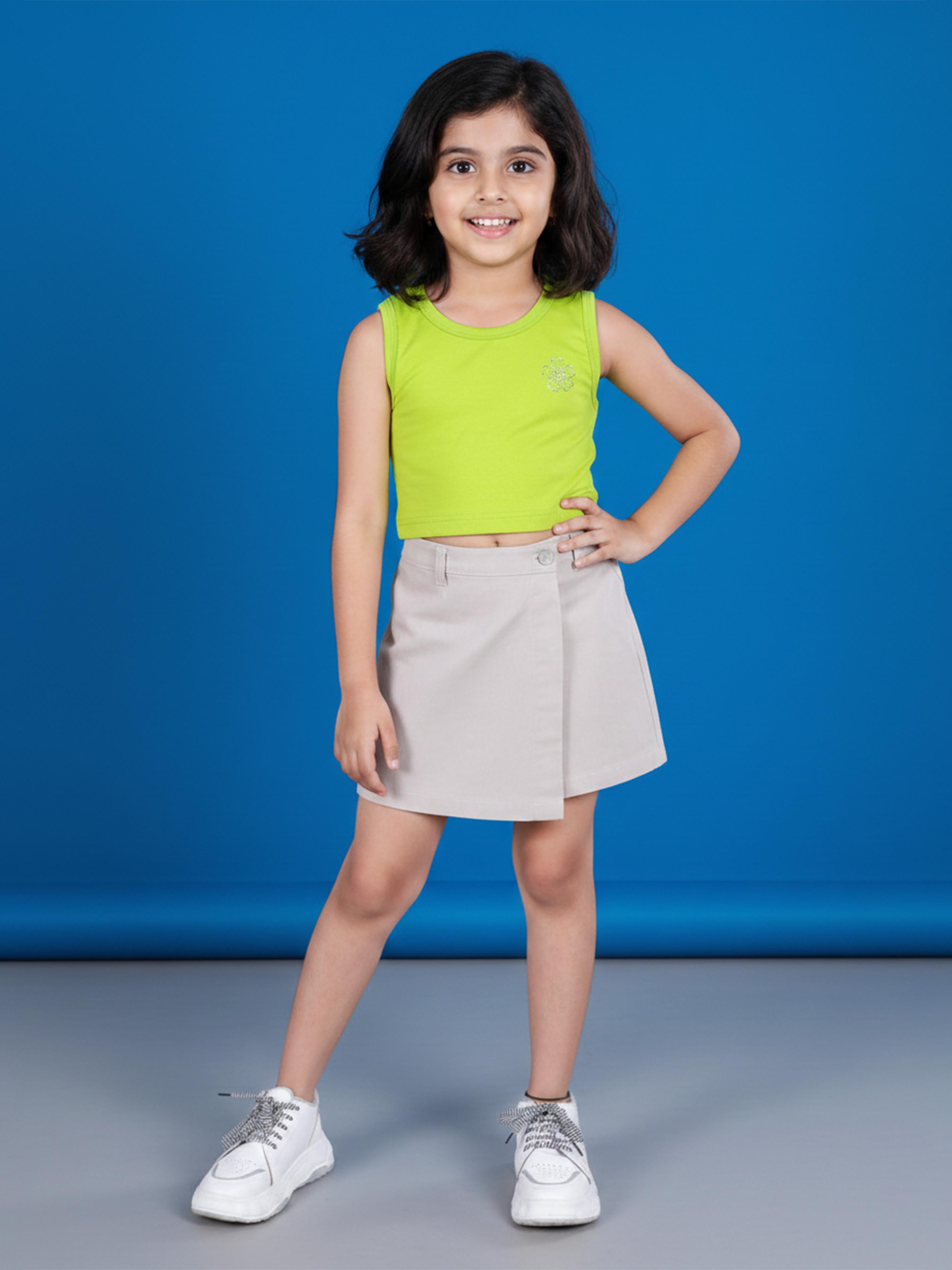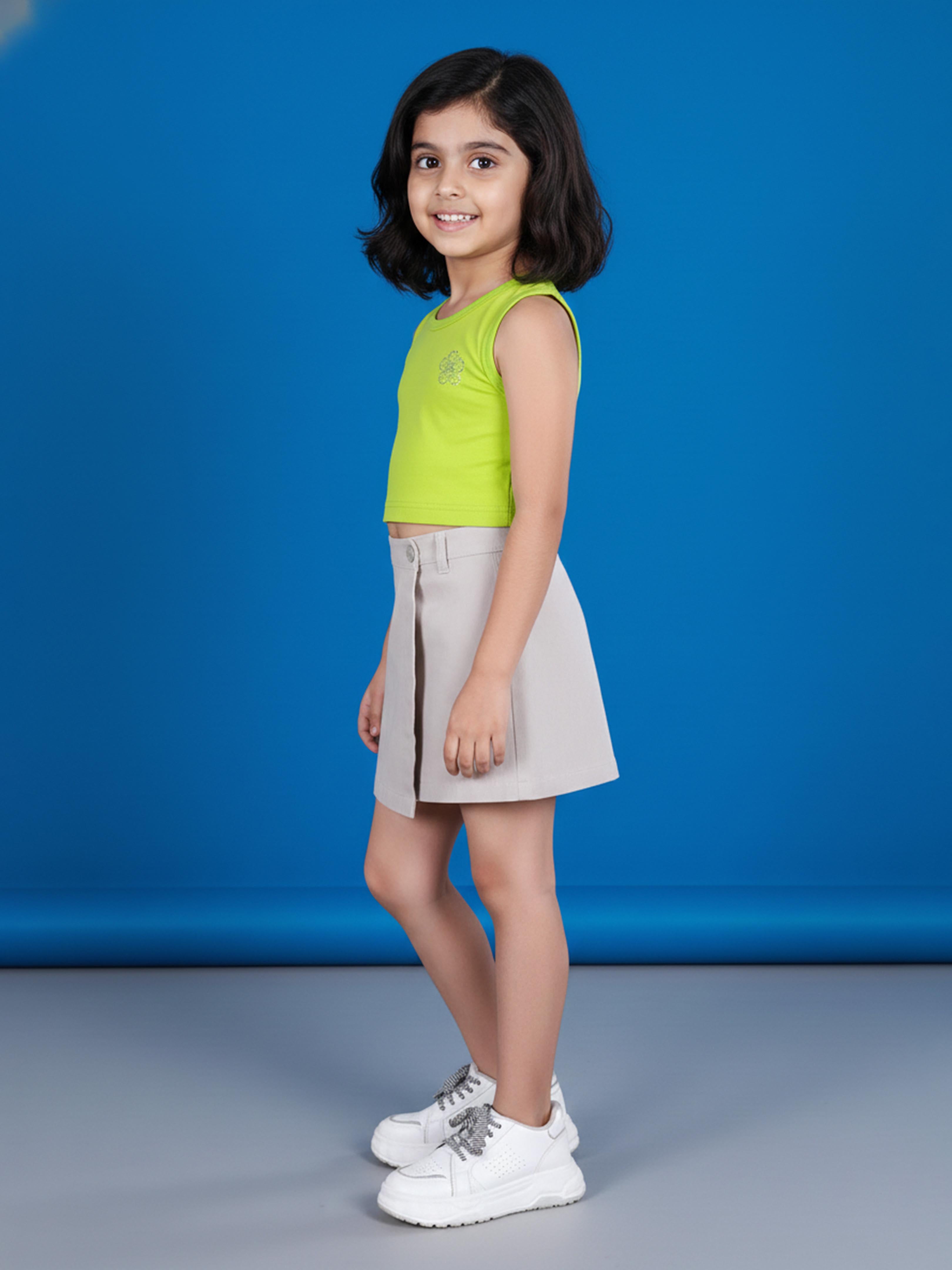 Kiddopanti brings to you the latest fashion essentials for your smart-dressing young ones. This Girls Rib Crop T-shirt with Stone Flower Detail & Skort Set is designed to add a fresh, modern touch to your little girl’s everyday wardrobe. The vibrant lime green ribbed crop top features a delicate stone flower embellishment on the chest, adding a subtle sparkle and stylish charm. The sleeveless silhouette and soft stretch rib fabric provide breathability and comfort, making it perfect for warm-weather wear. Paired with a chic grey wrap-style skort, this set combines the elegance of a skirt with the practicality and comfort of shorts. The structured skort design gives a neat, polished look, making it ideal for outings, birthday parties, casual gatherings, and summer events. This coordinated set blends playful colour with contemporary style for effortless everyday fashion.
