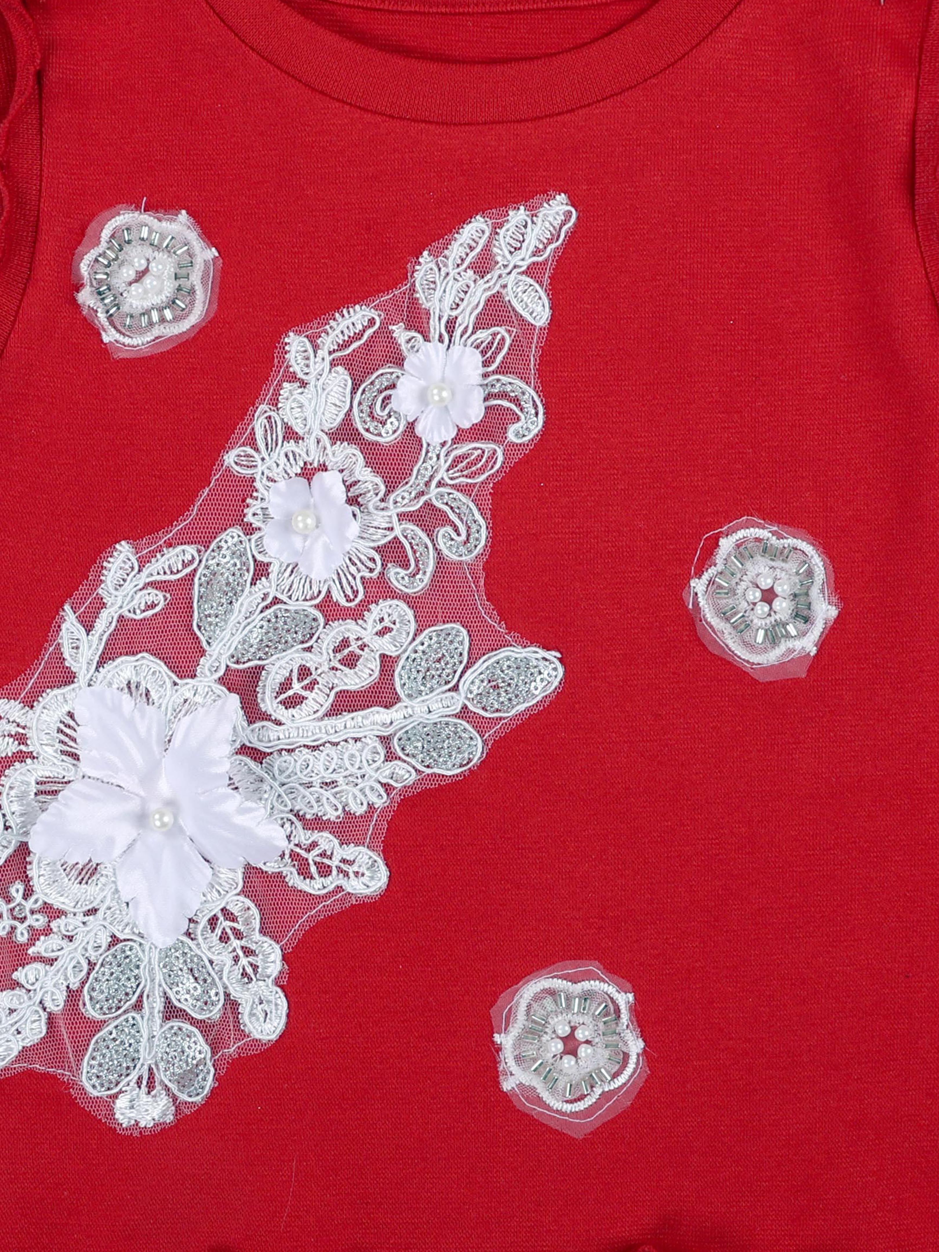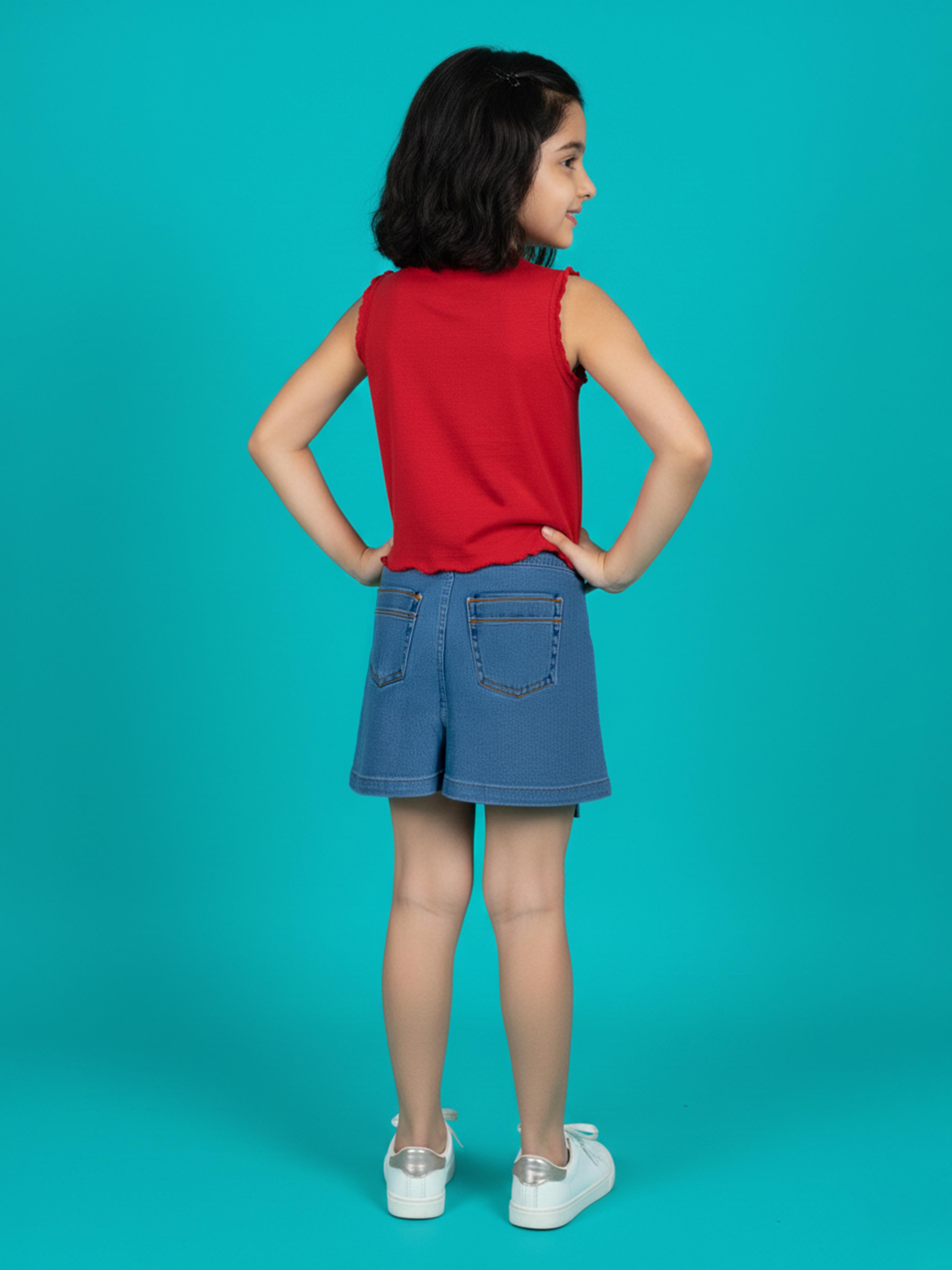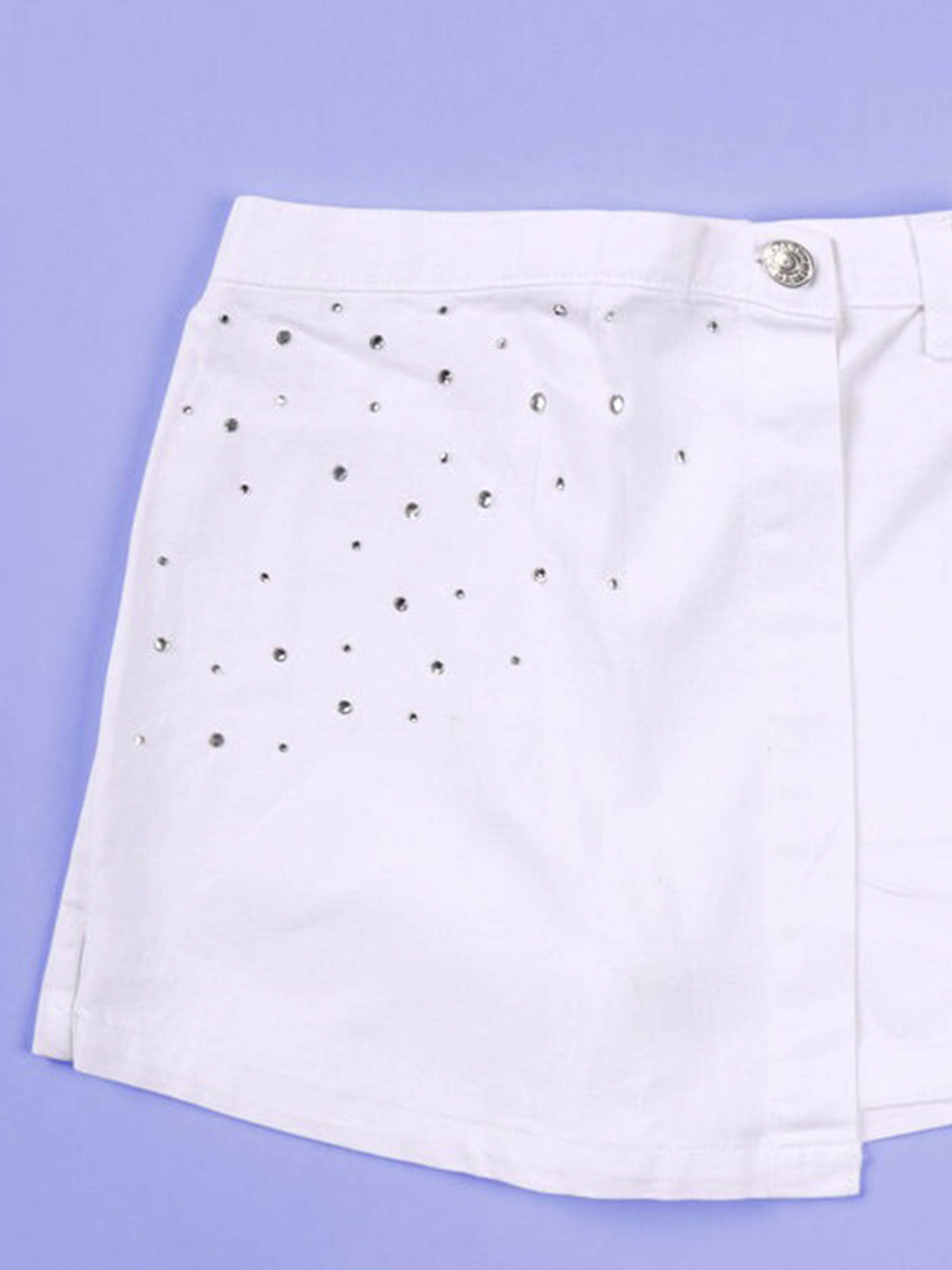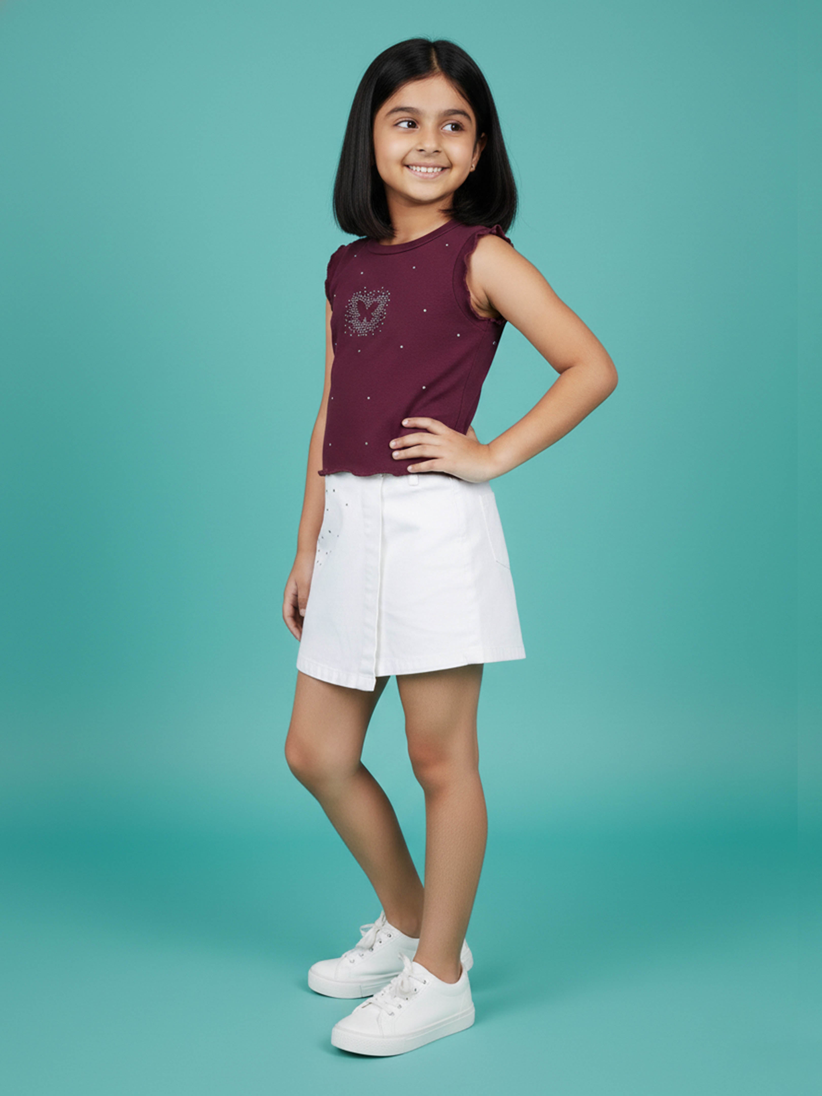 Kiddopanti Girls Rib Round Neck Sleeveless Crop T-shirt with Stone Work Applique & Skort Clothing Set