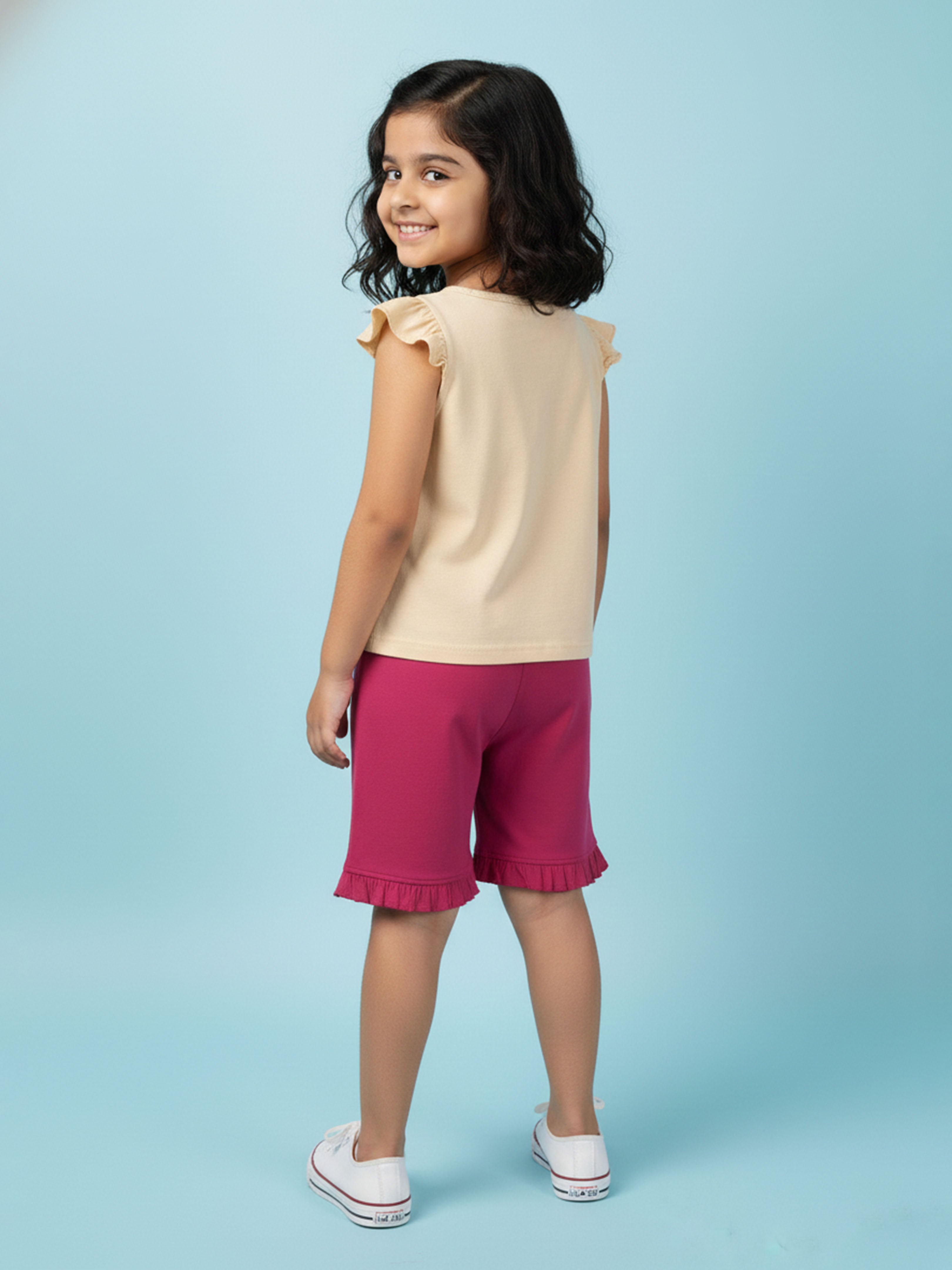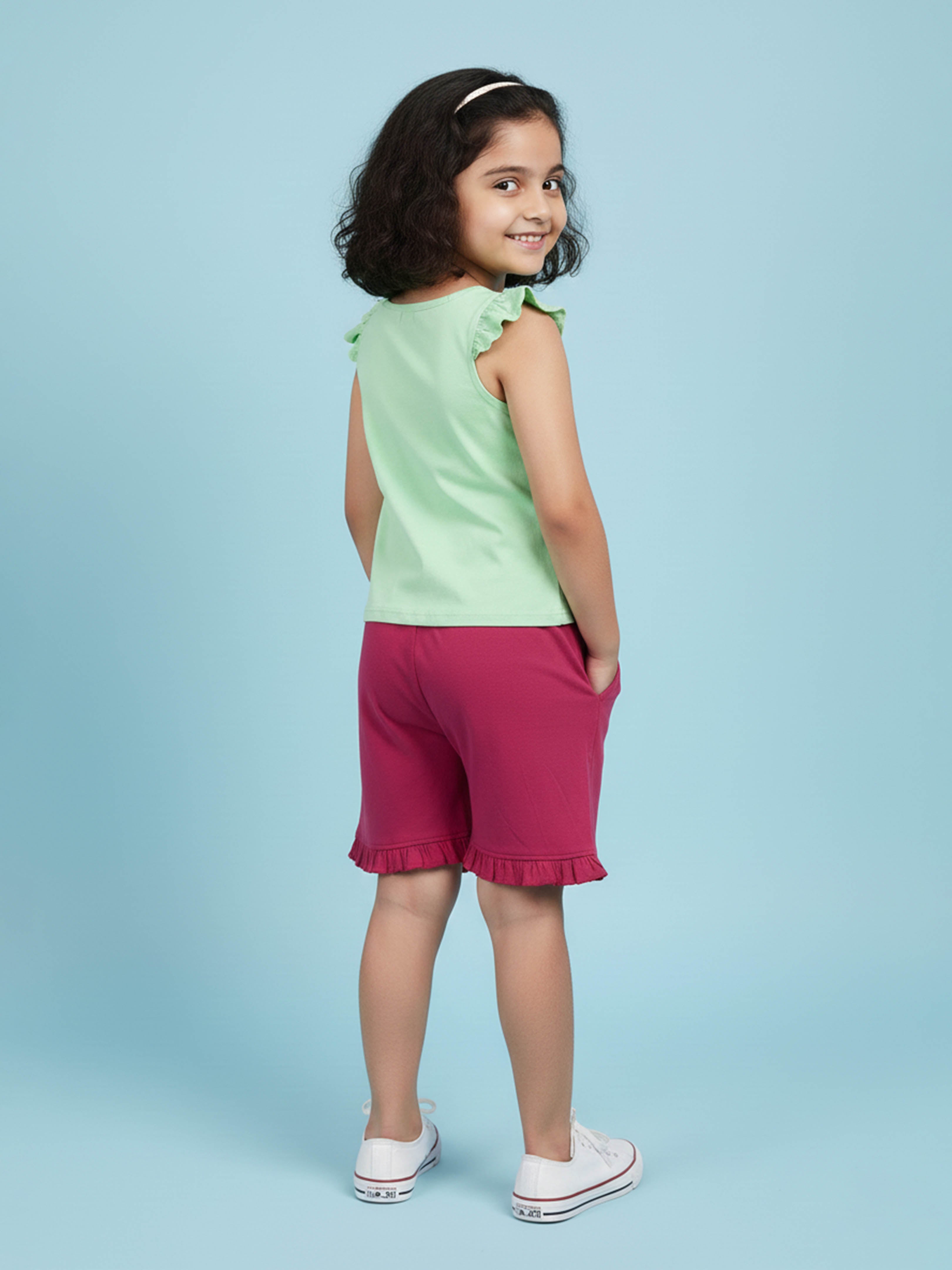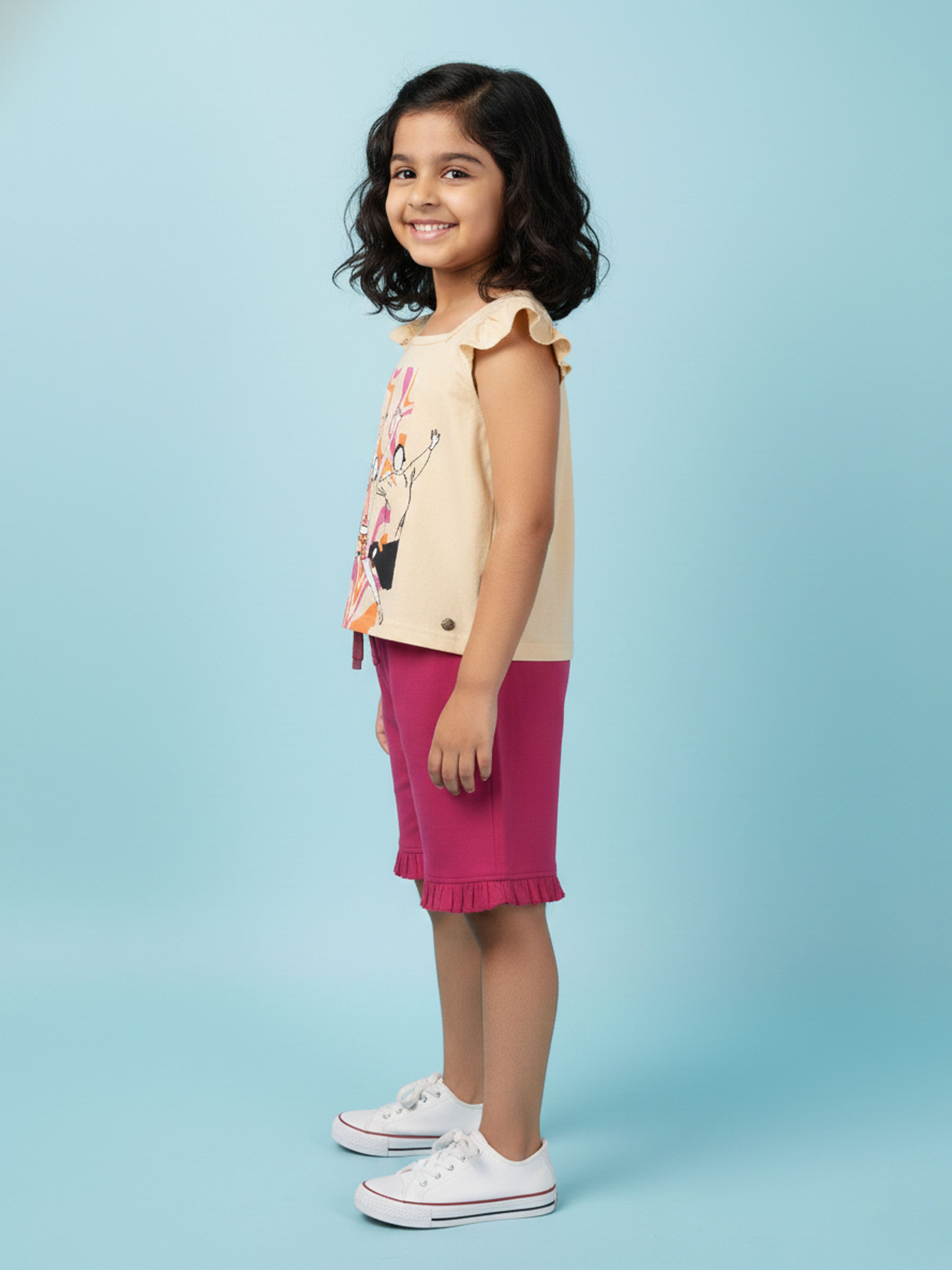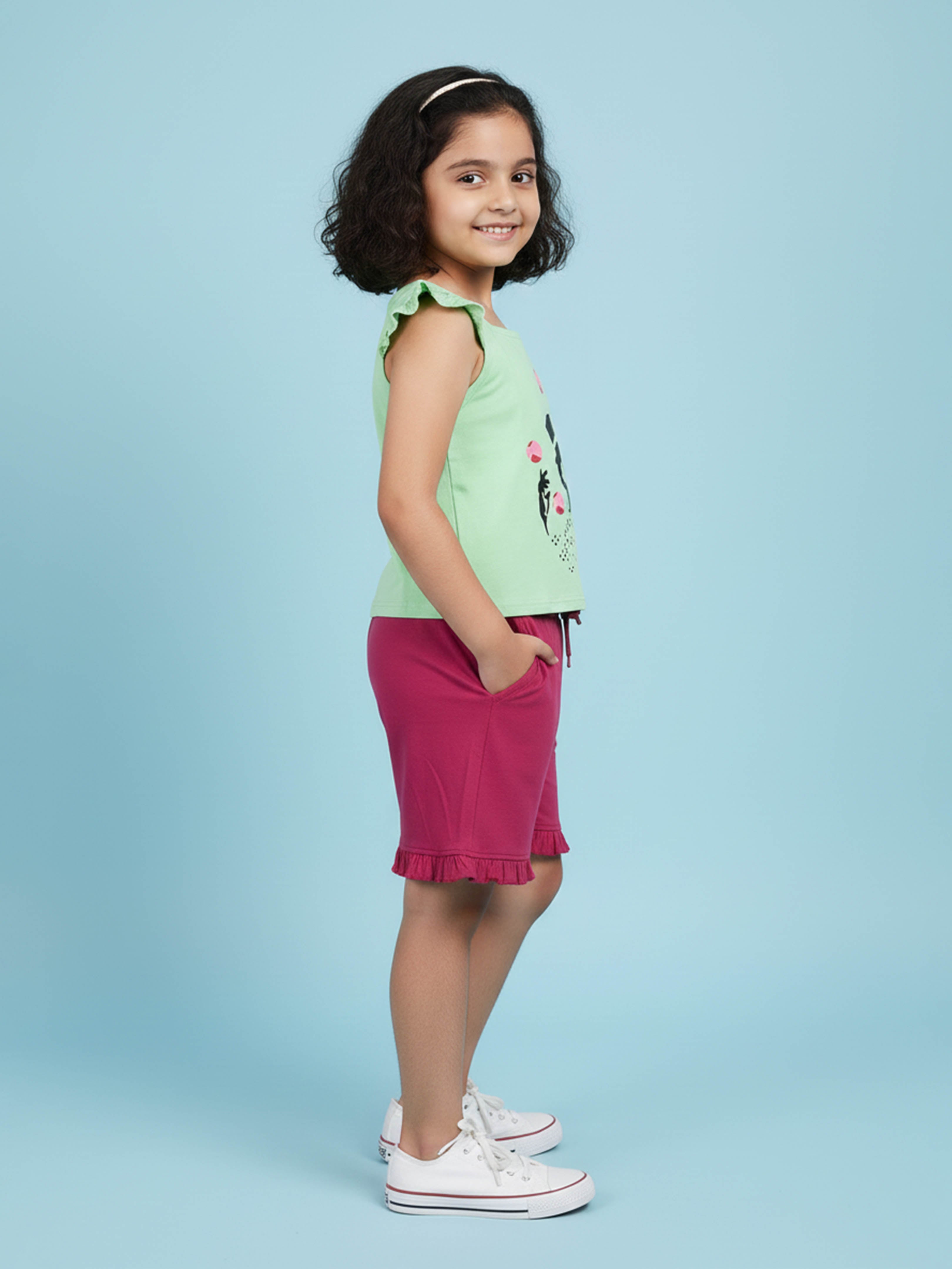 Kiddopanti brings to you the latest fashion clothes for your smart dressing young ones. This Printed Sleeveless T-Shirt & Frill Hem Shorts Combo is a fun and lively addition to her everyday wardrobe. The sleeveless round neck T-shirt features a vibrant dance-inspired placement print that captures playful energy, while cute frill detailing on the shoulders adds a stylish charm. Paired with soft knit bottom hem frill hot shorts, this combo ensures all-day comfort and ease of movement—perfect for playdates, outings, vacations, or casual summer wear.