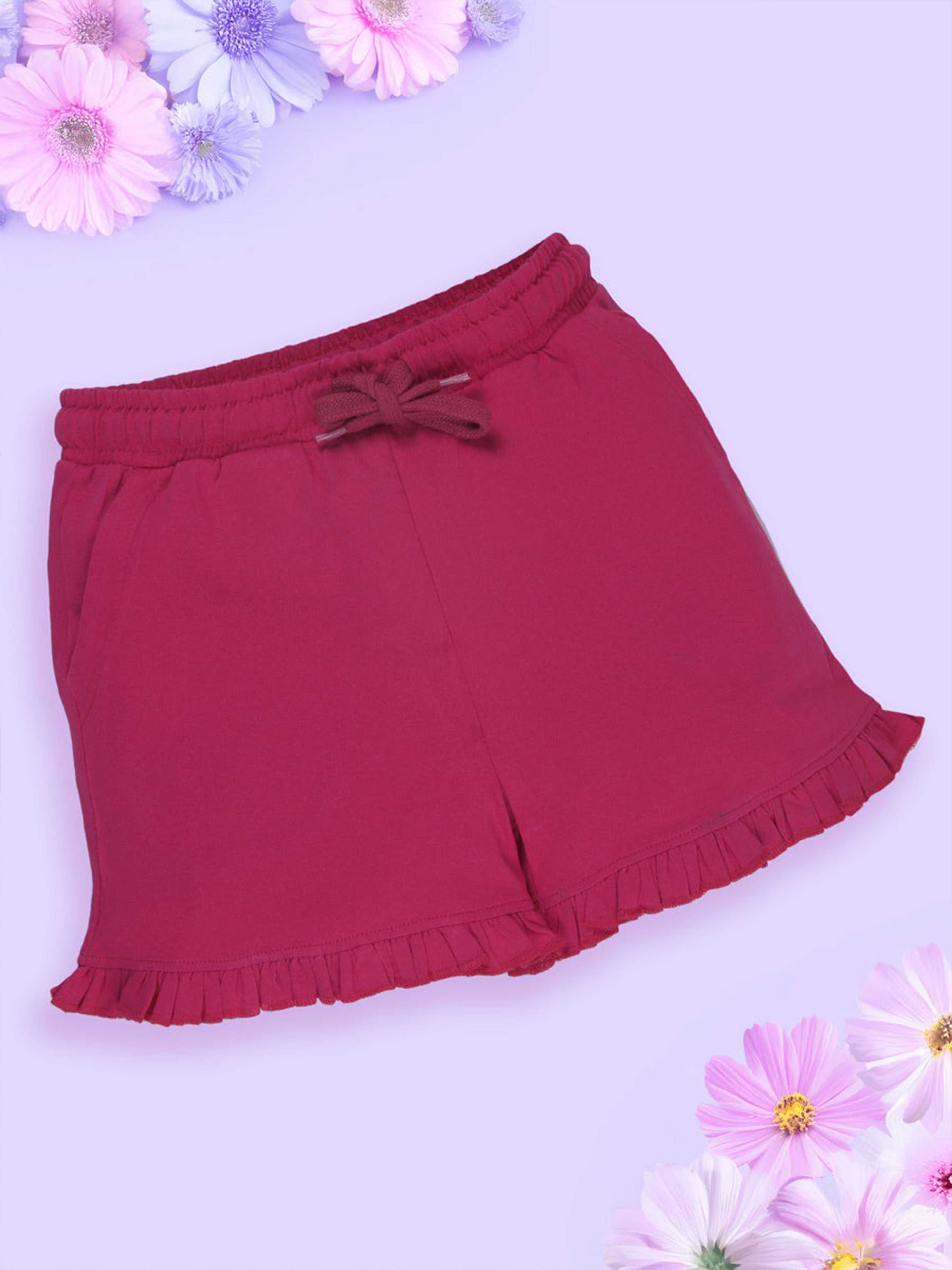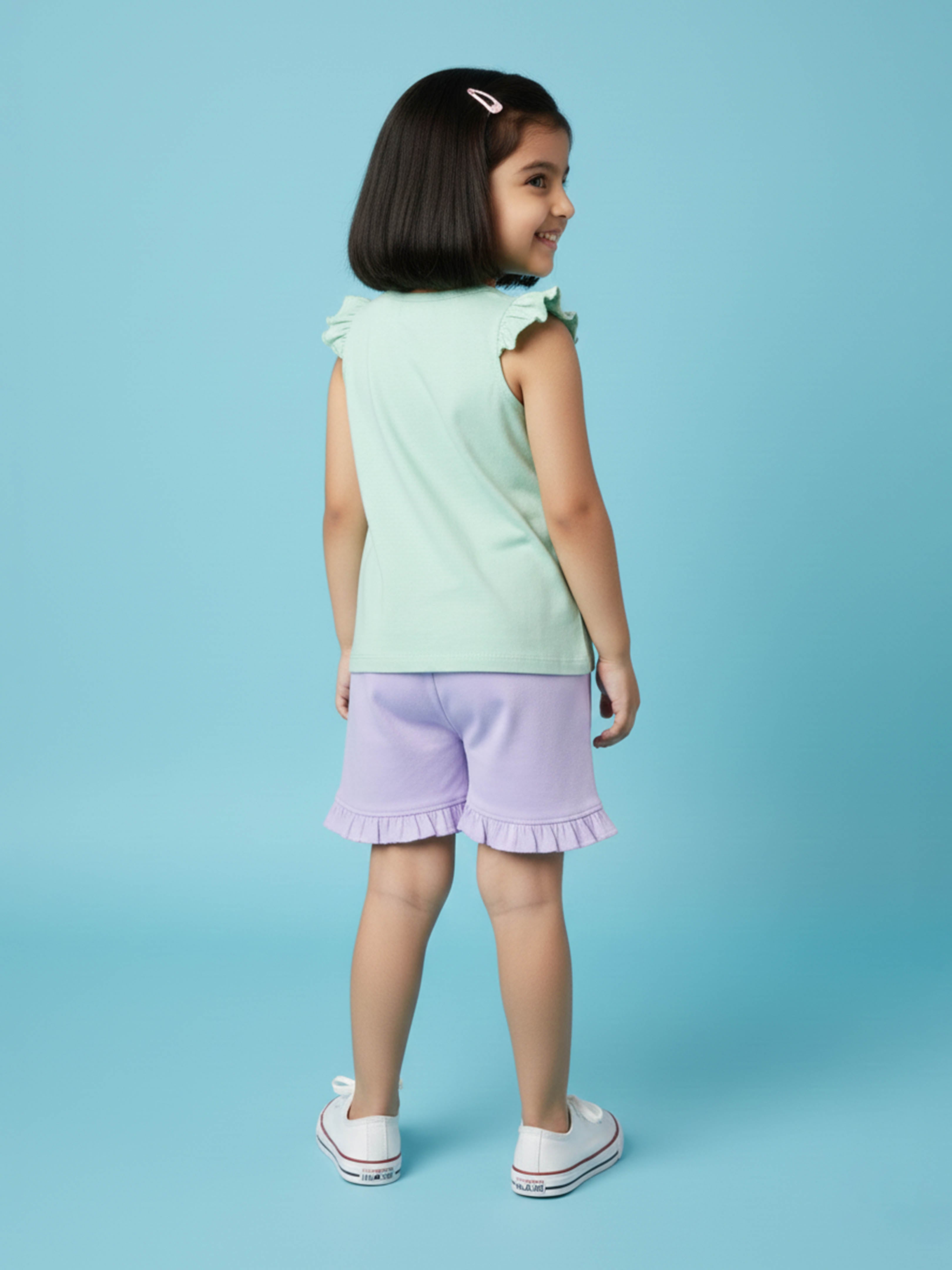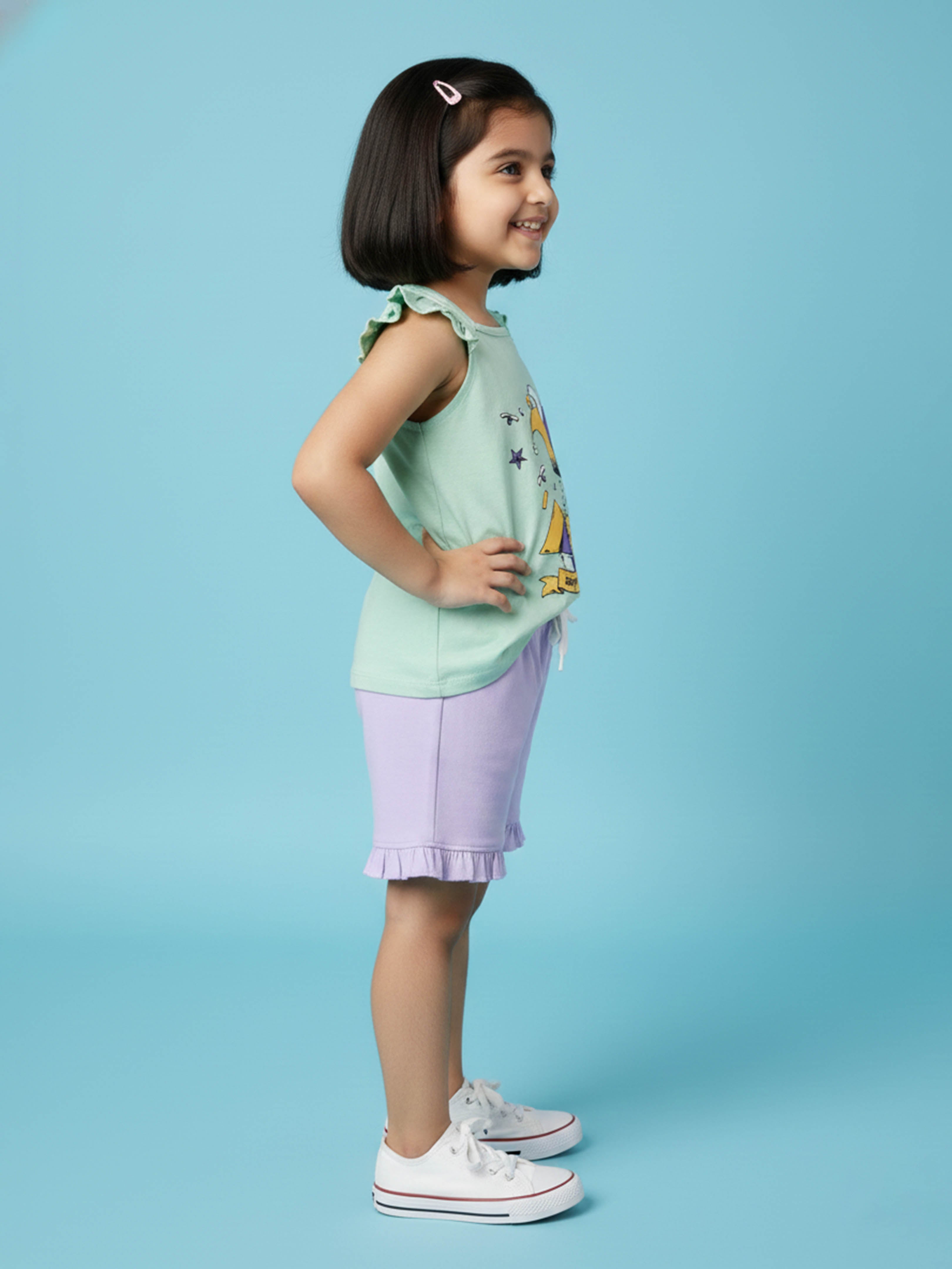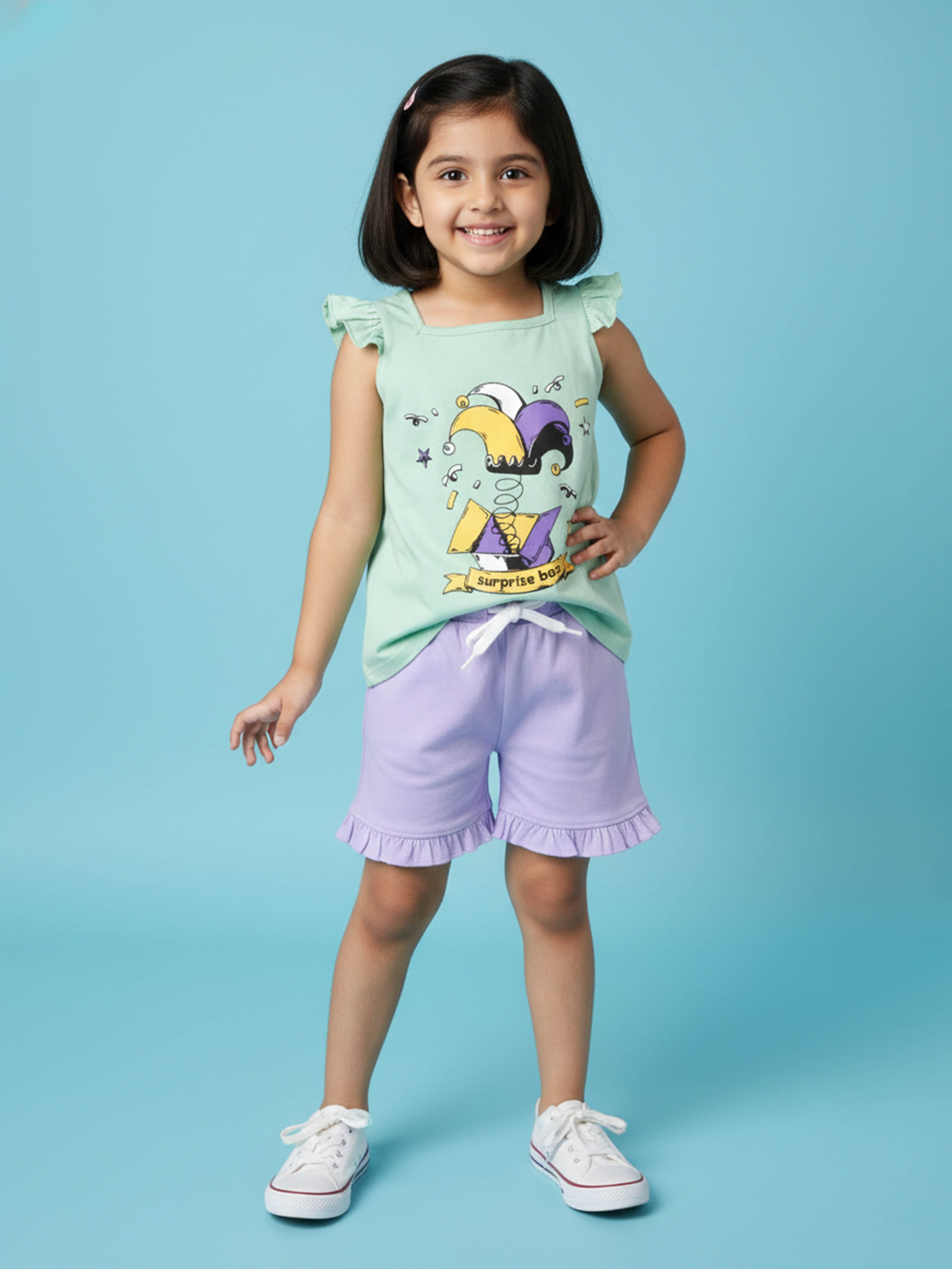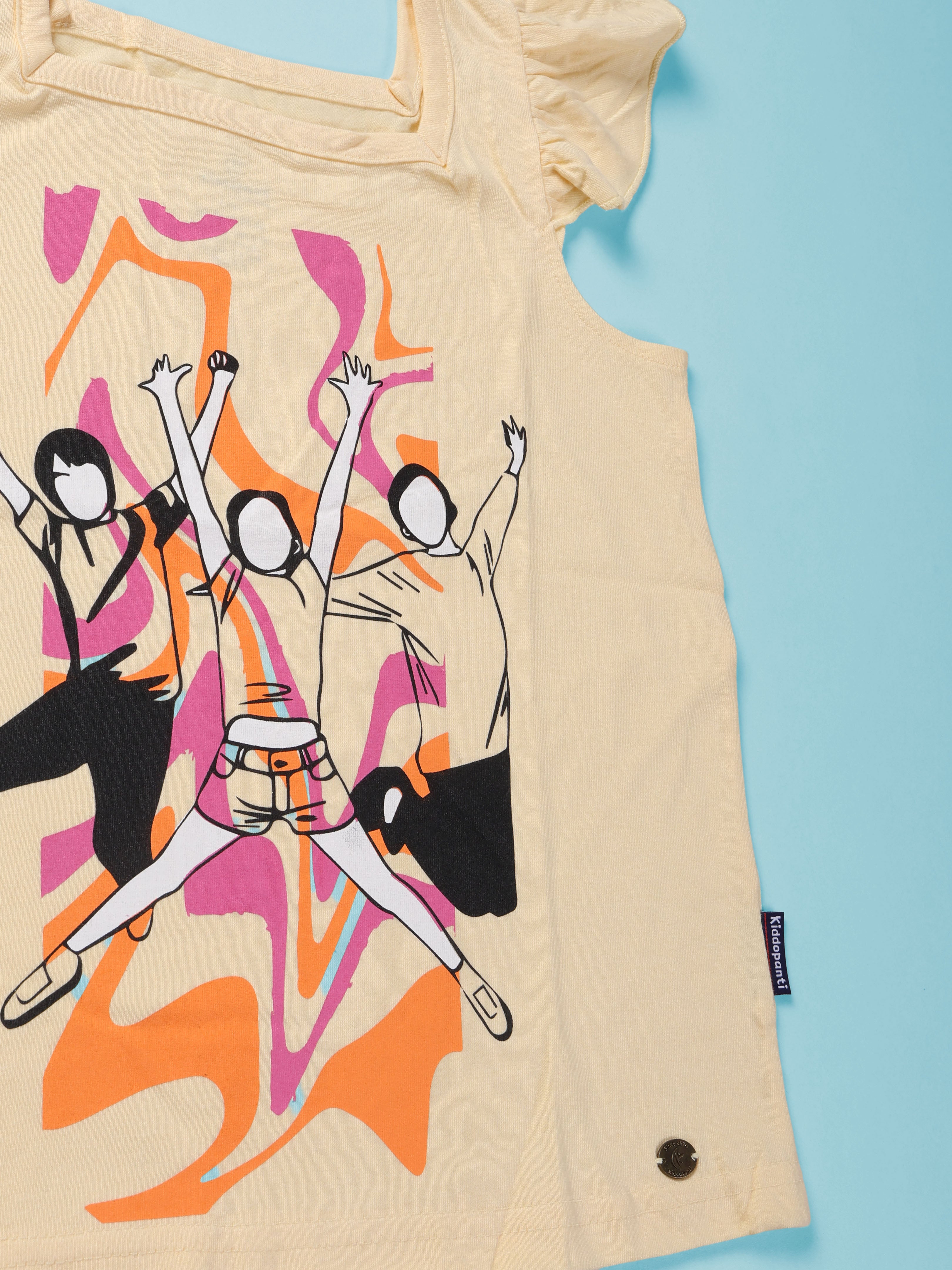 Kiddopanti brings to you the latest fashion clothes for your smart dressing young ones. This Printed Sleeveless T-Shirt & Frill Hem Shorts Combo is a fun and lively addition to her everyday wardrobe. The sleeveless round neck T-shirt features a vibrant dance-inspired placement print that captures playful energy, while cute frill detailing on the shoulders adds a stylish charm. Paired with soft knit bottom hem frill hot shorts, this combo ensures all-day comfort and ease of movement—perfect for playdates, outings, vacations, or casual summer wear.