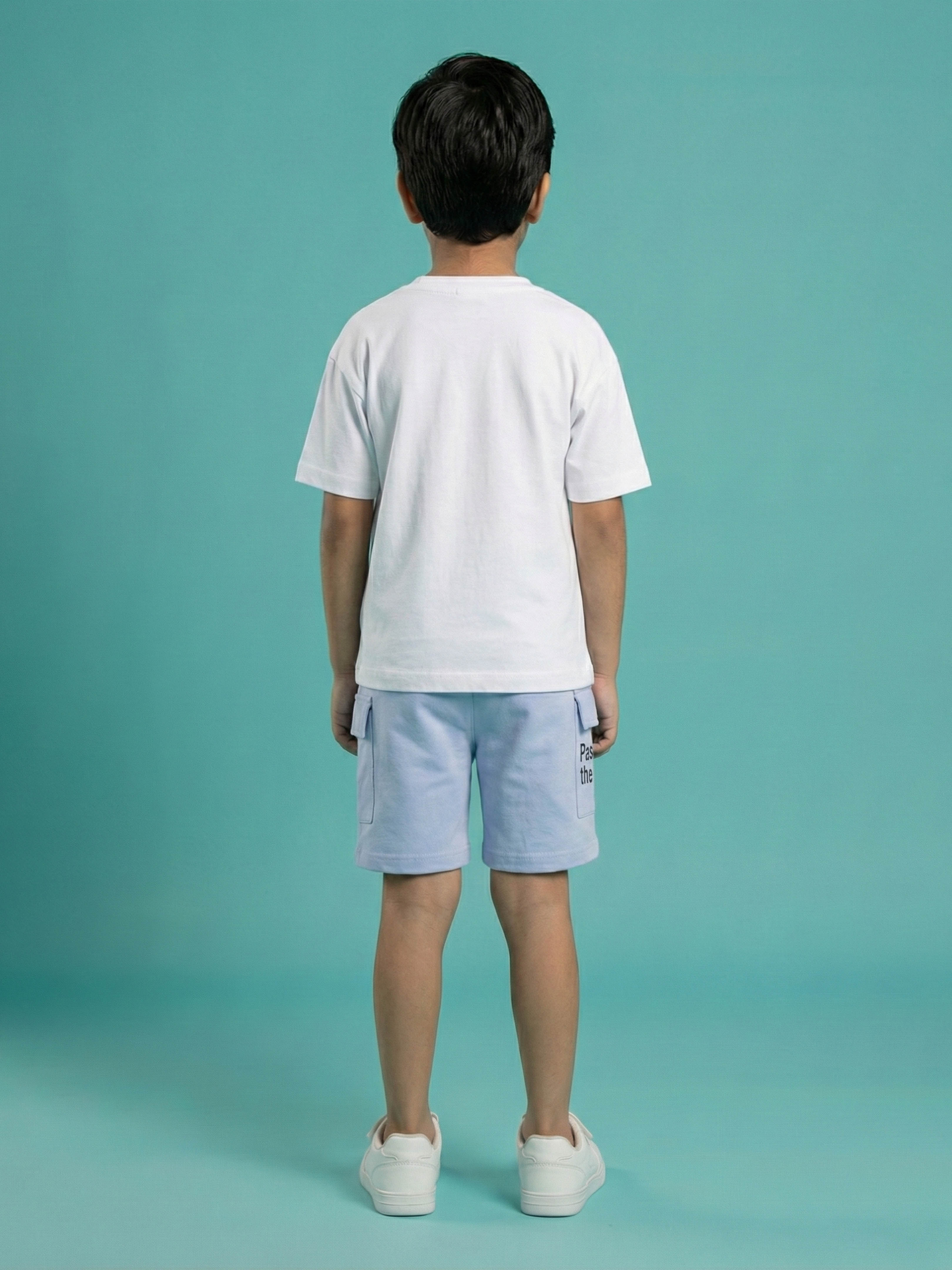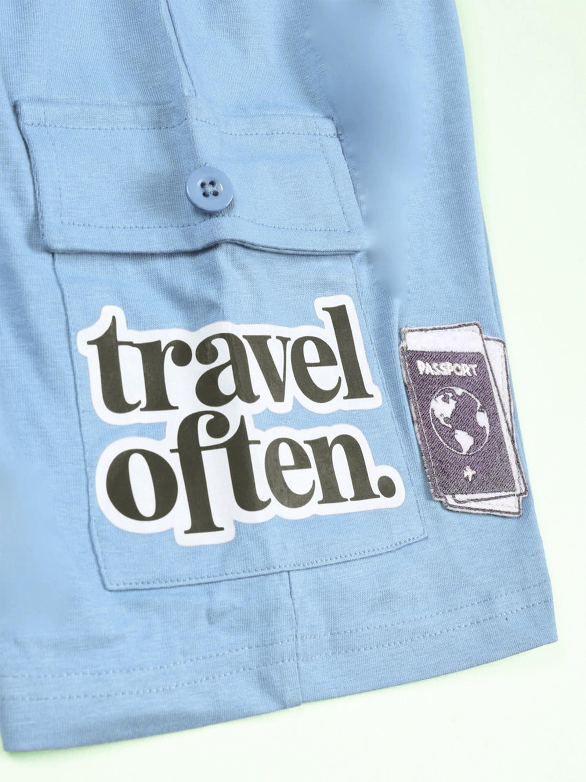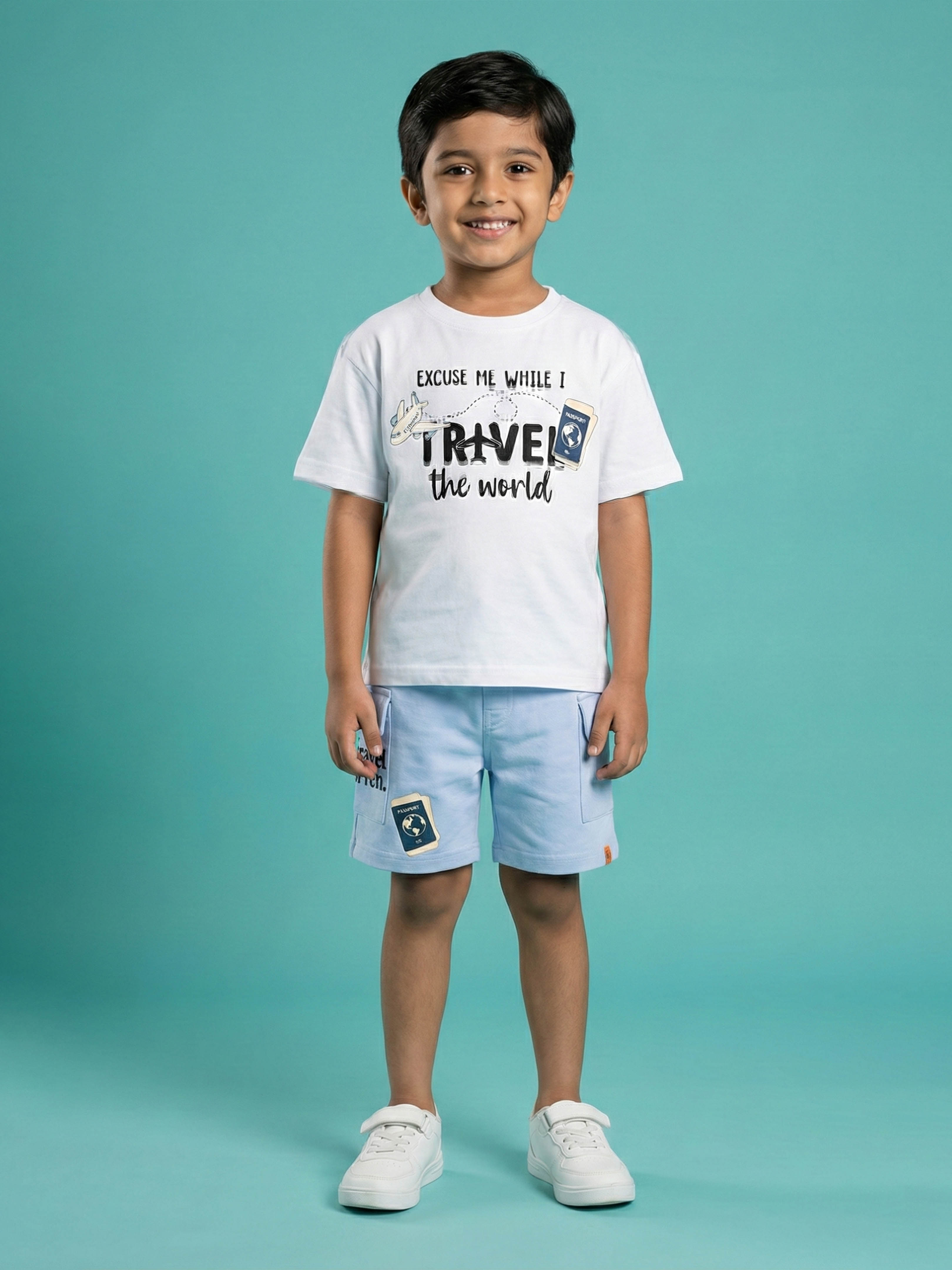 Get him ready for takeoff with this bright and breezy coordinated set. Made from 100% pure cotton, this outfit pairs a crisp white "Travel the World" tee with functional light blue cargo shorts, offering a cool, vacation-ready look that doesn't compromise on comfort.