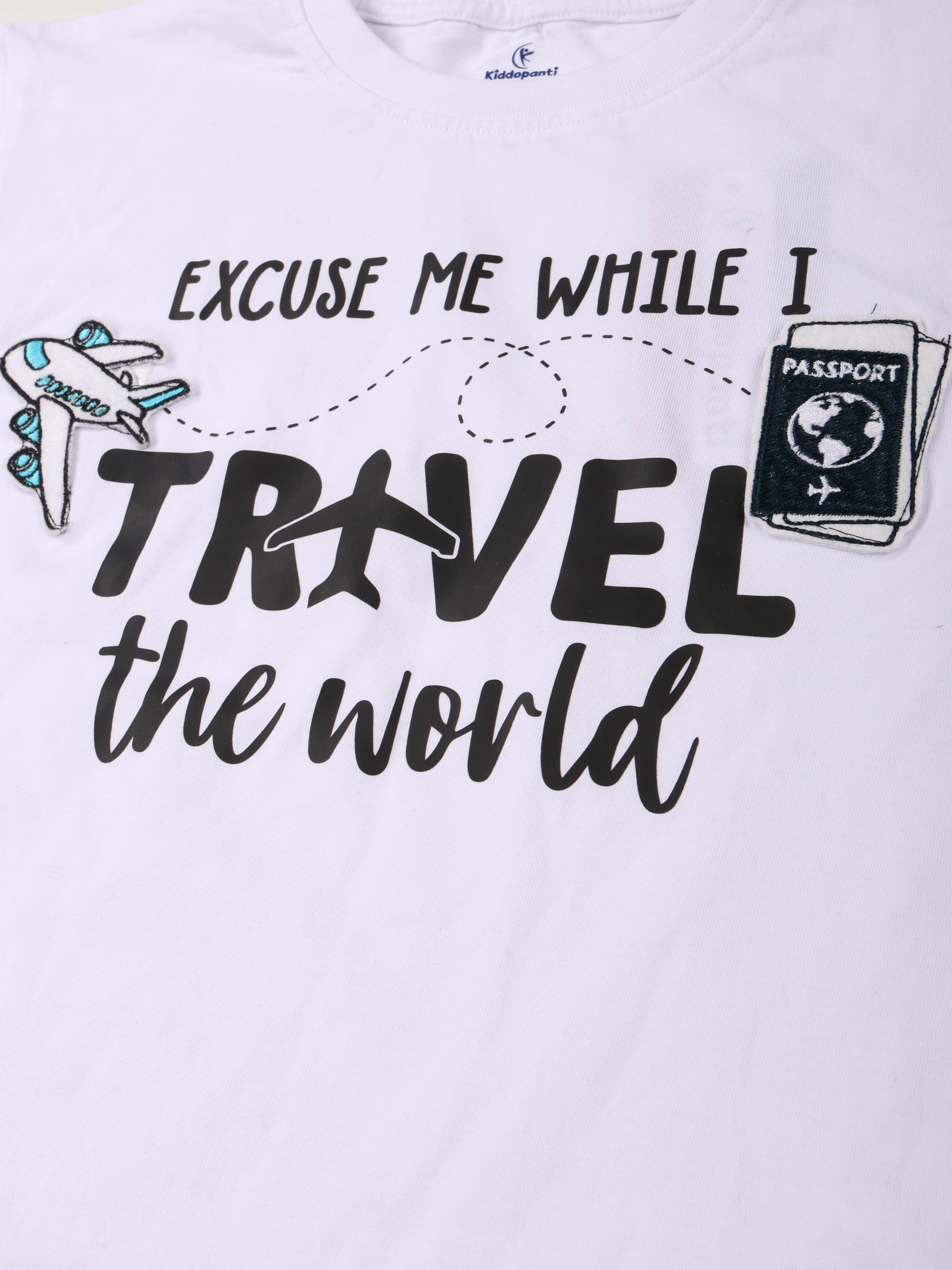 Adventure-Ready Graphic: Features a stylish "Excuse Me While I Travel The World" print with plane and passport motifs.
