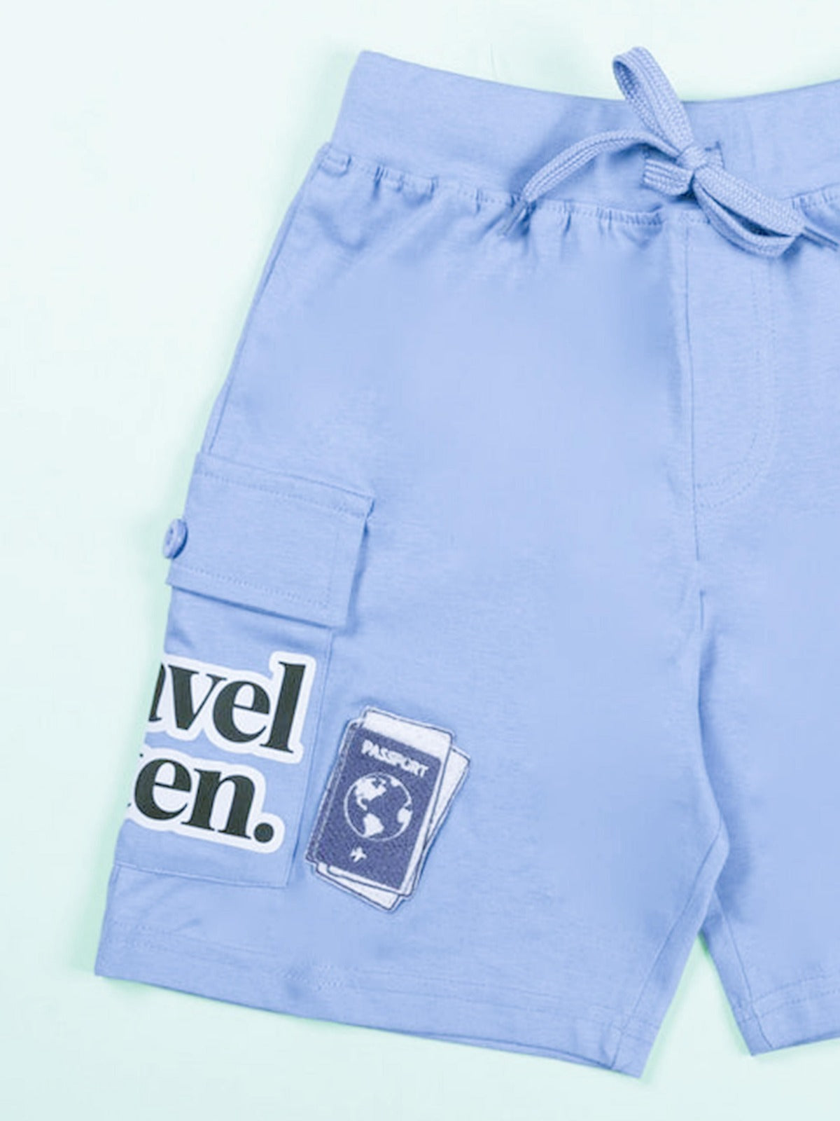 Cargo Style Utility: Light blue shorts featuring side cargo pockets with flap details for a trendy, adventurous look.