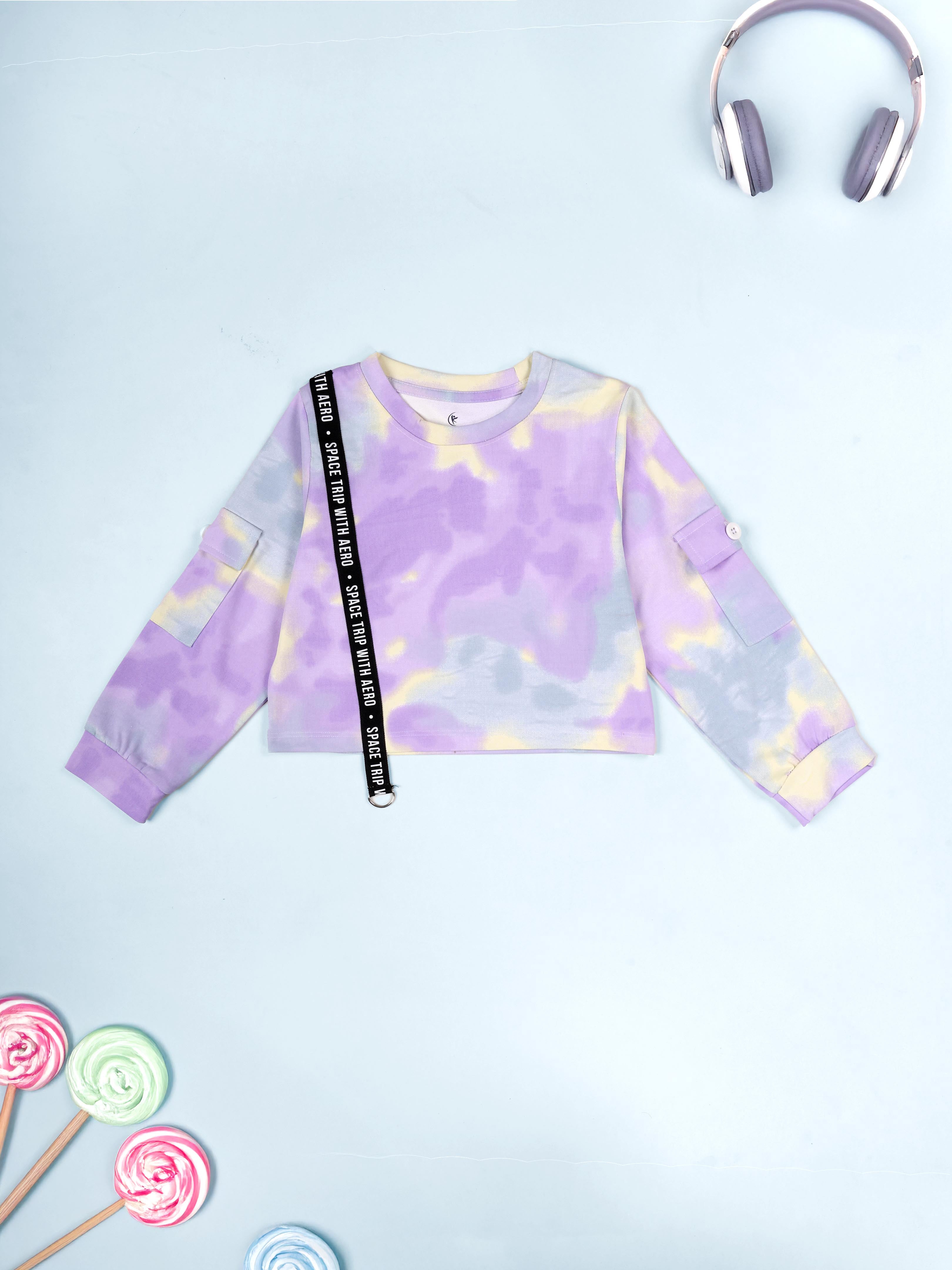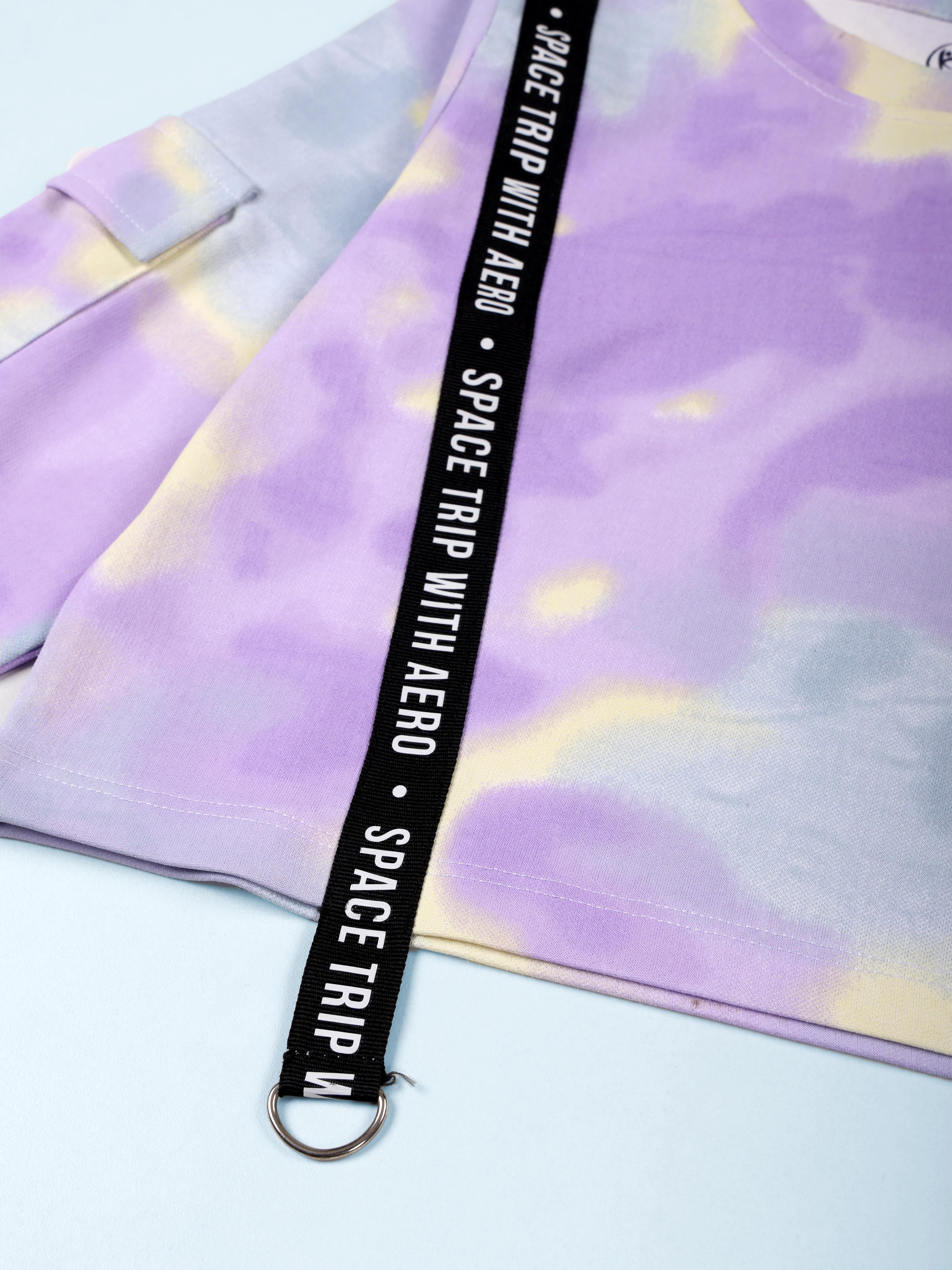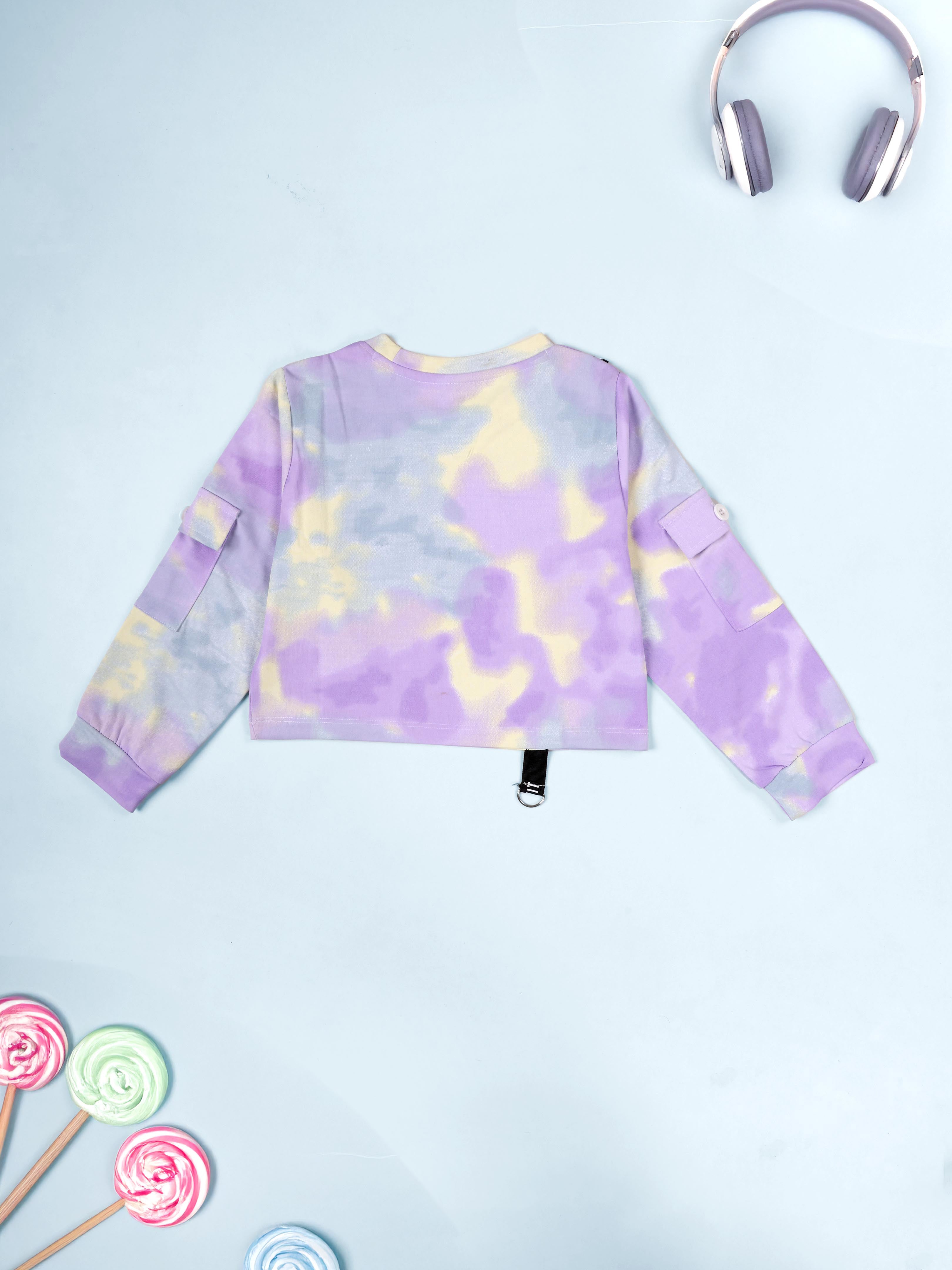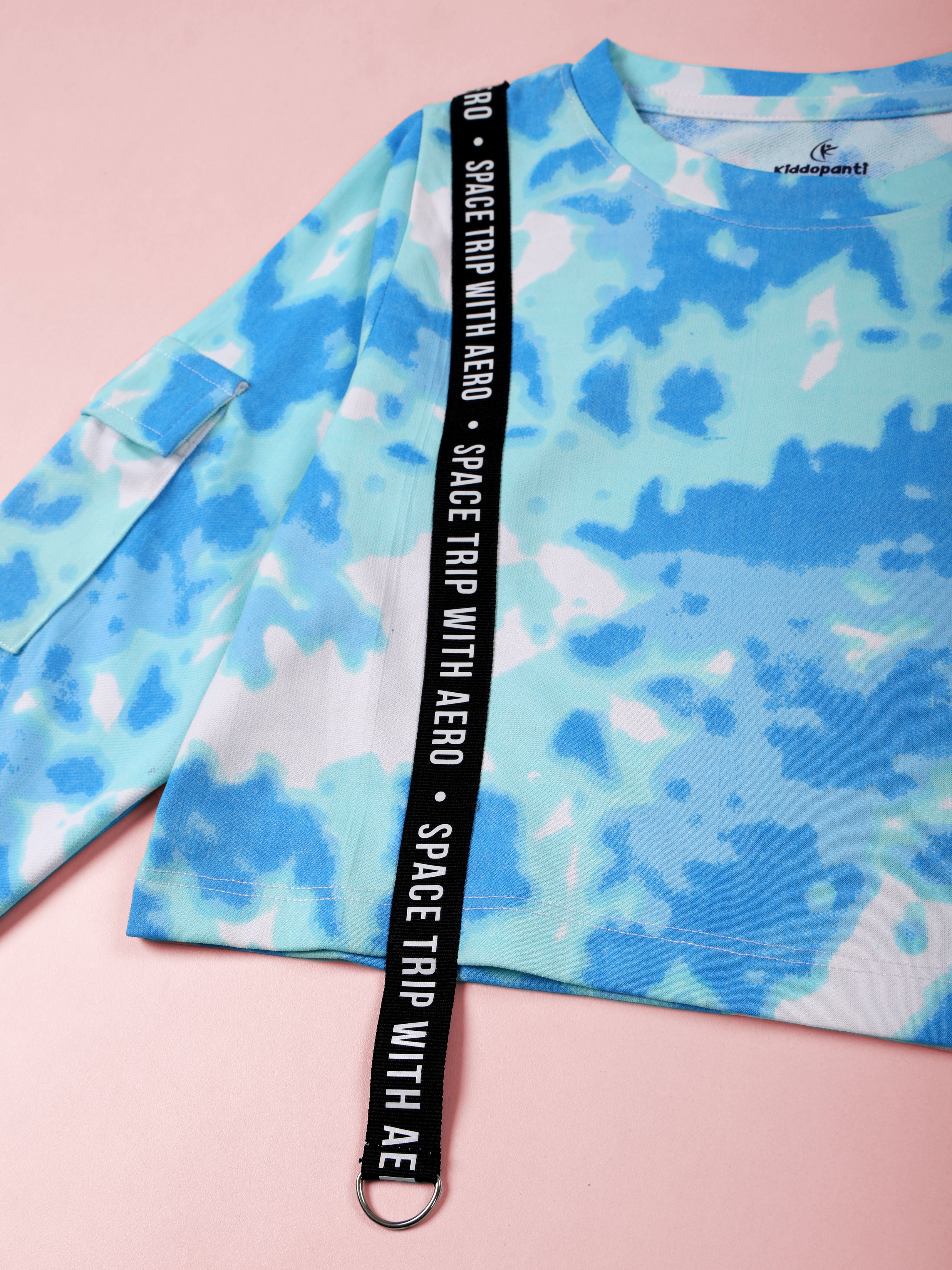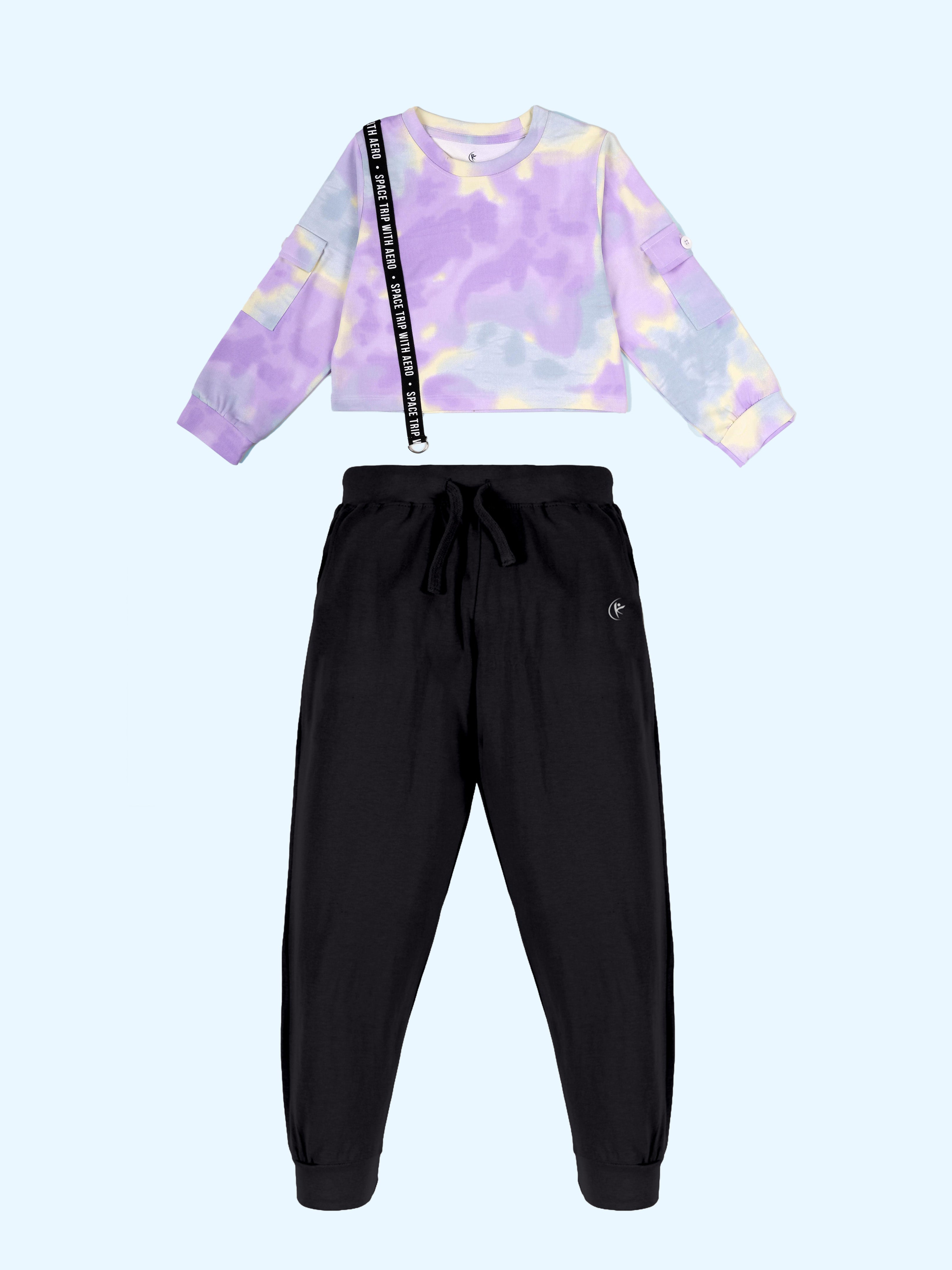Kiddopanti Girls Cotton Tie & Dye Full Sleeve Crop Length Round Neck Tee With Solid Track Pant Set