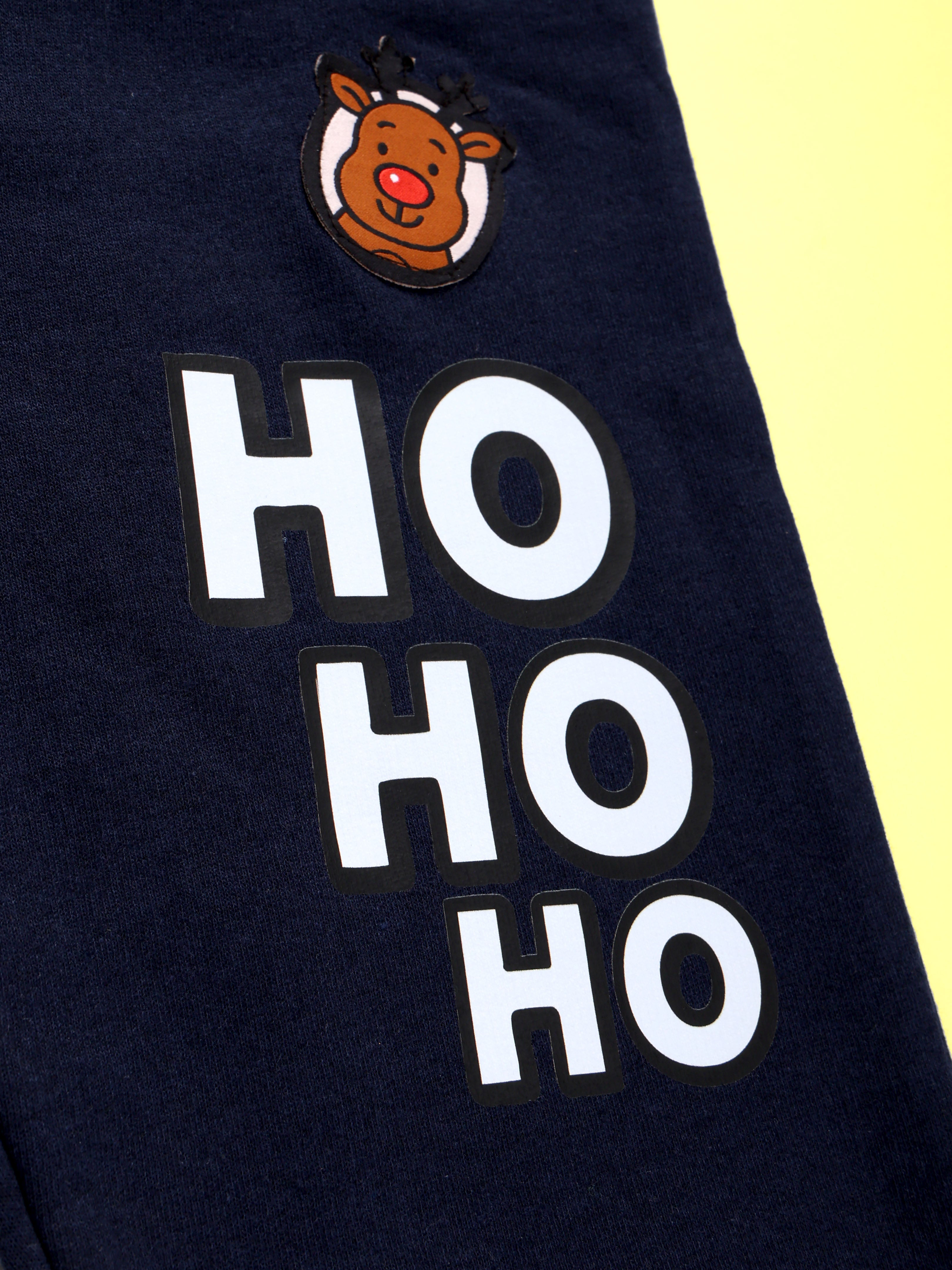 Festive Design β Santa & Reindeer patches with bold HO HO HO print