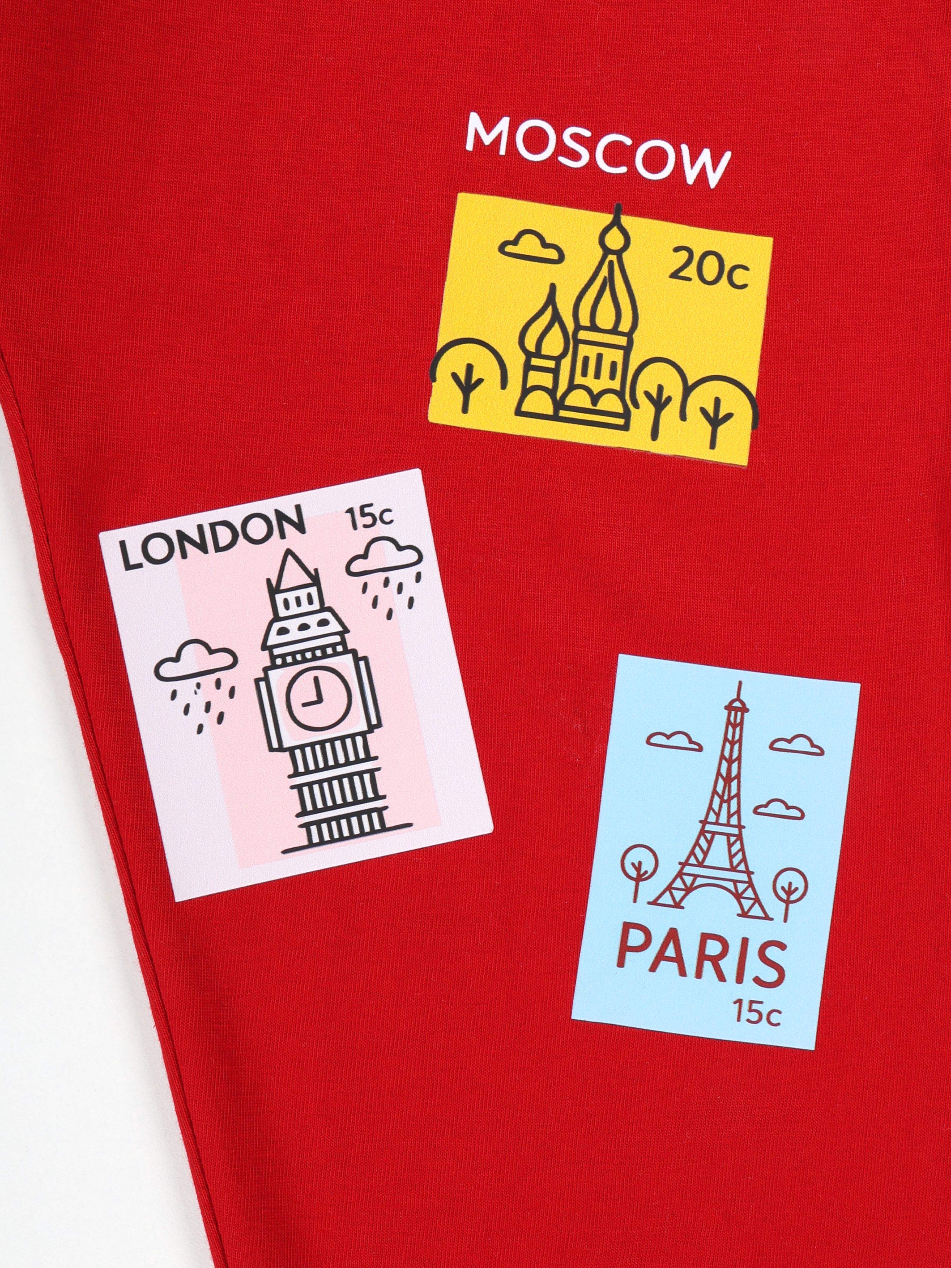 Travel-themed red jogger with vibrant city stamp graphics – London, Paris, Moscow, Italy – encouraging little explorers