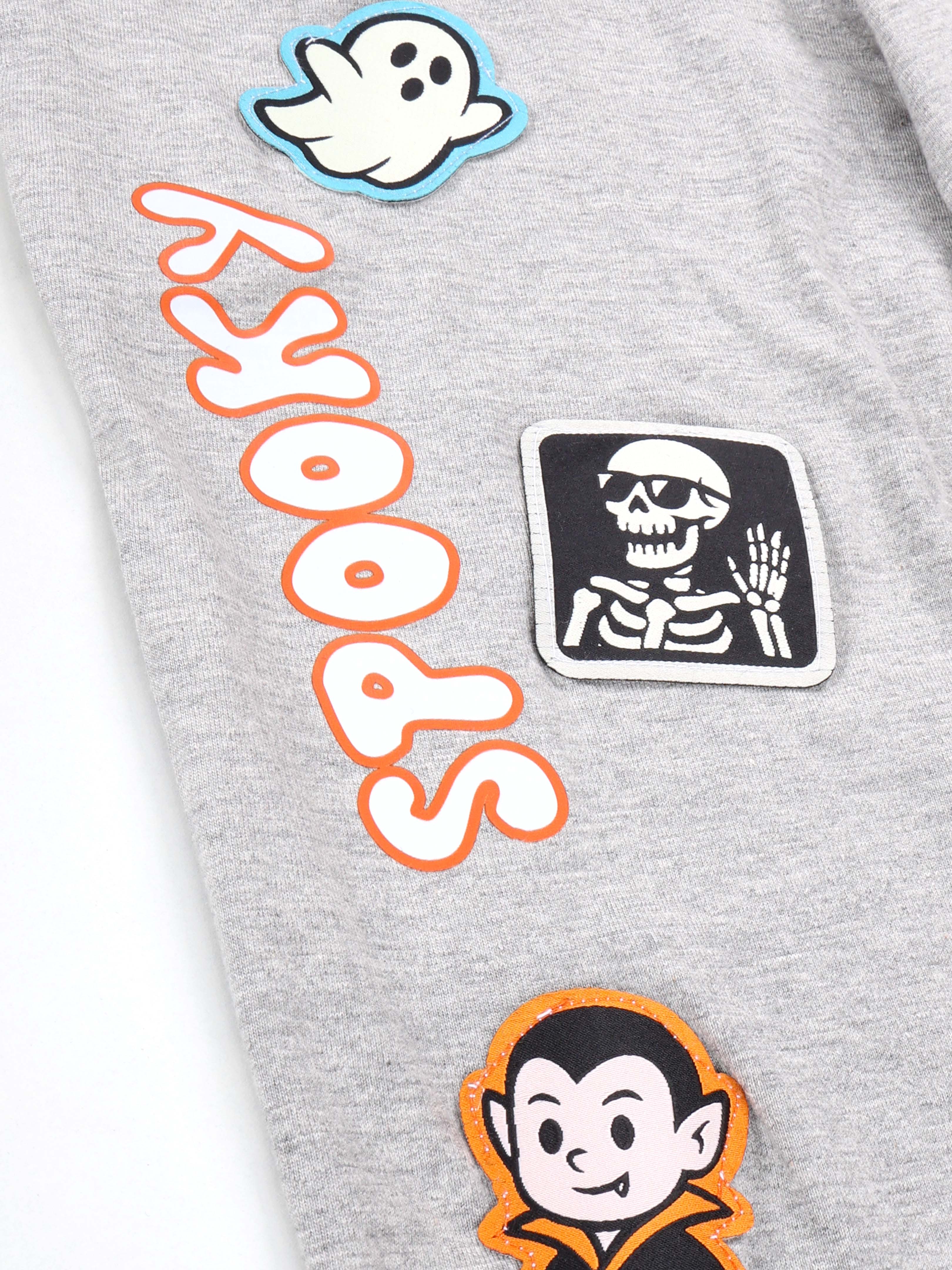 Grey jogger with playful “Spooky” badges and cute Halloween-inspired character patches, perfect for fun and quirky styling