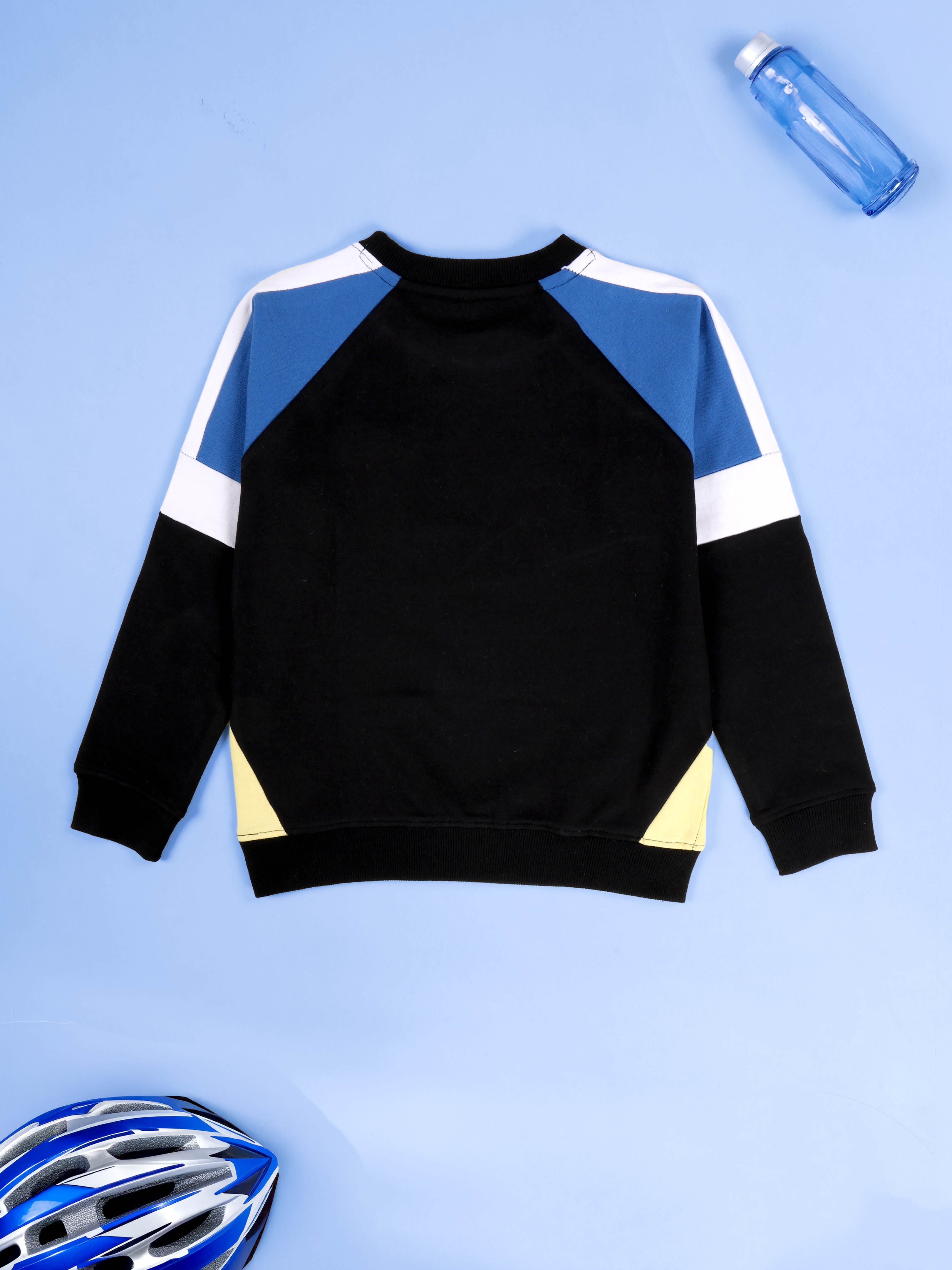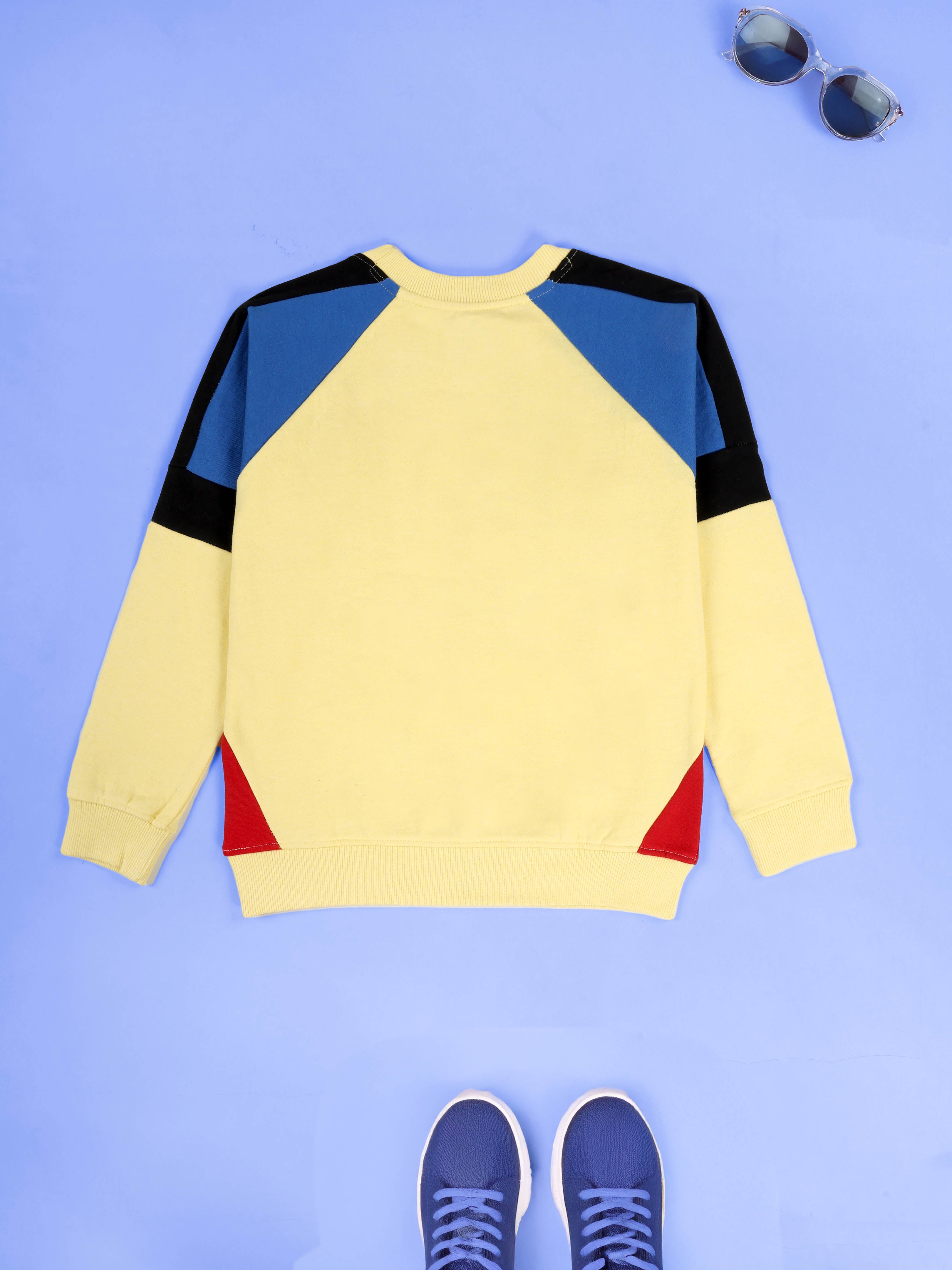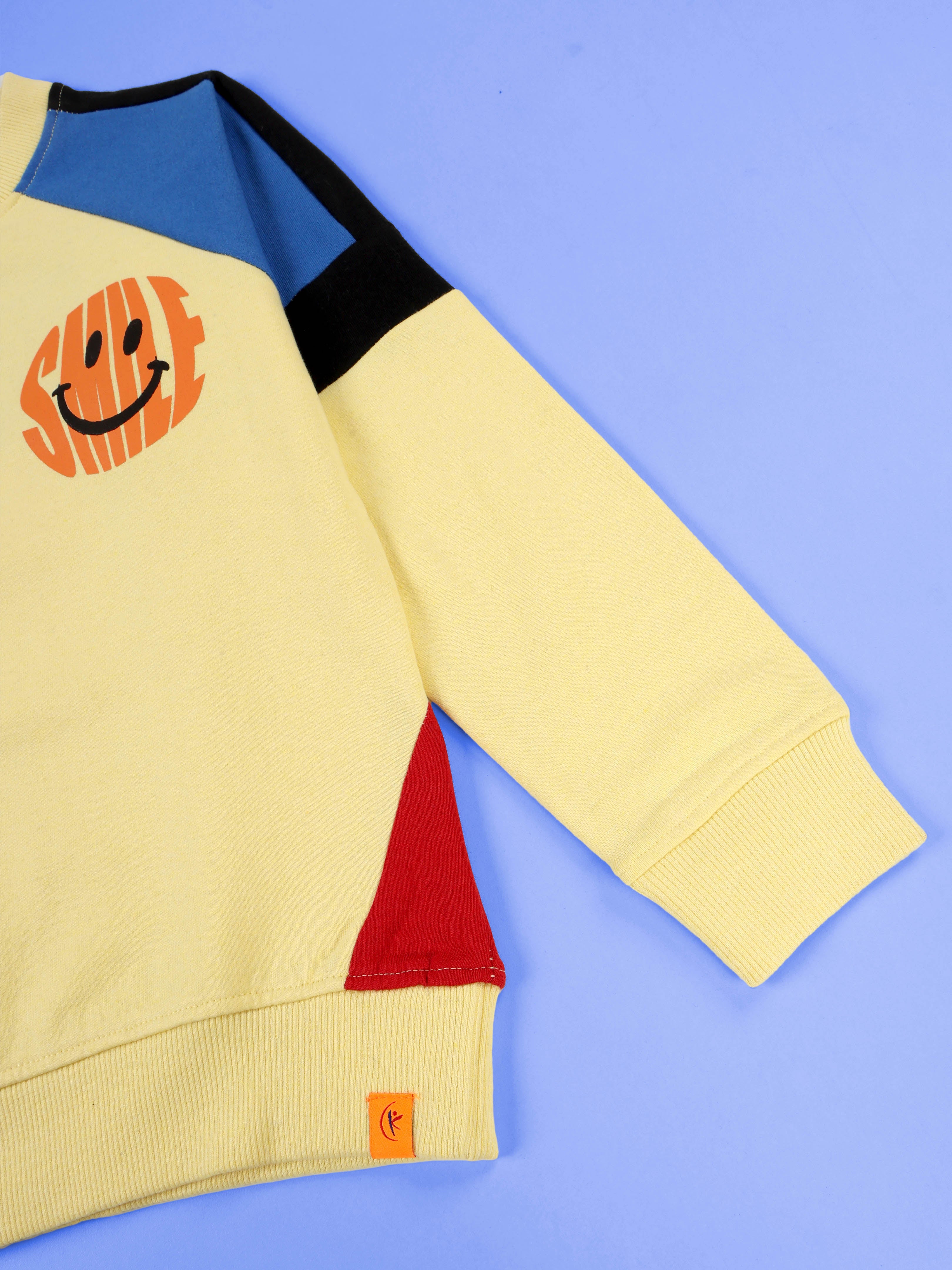 Kiddopanti brings elevated streetwear style to your kid’s winter lineup with this bold colorblock fleece sweatshirt. A fusion of sporty elements and cool attitude, this piece features contrast panelling, varsity-inspired stripes, and a graffiti-style smiley chest print. Perfect for boys who love motion and mood, this sweatshirt blends warmth with weekend-ready edge.