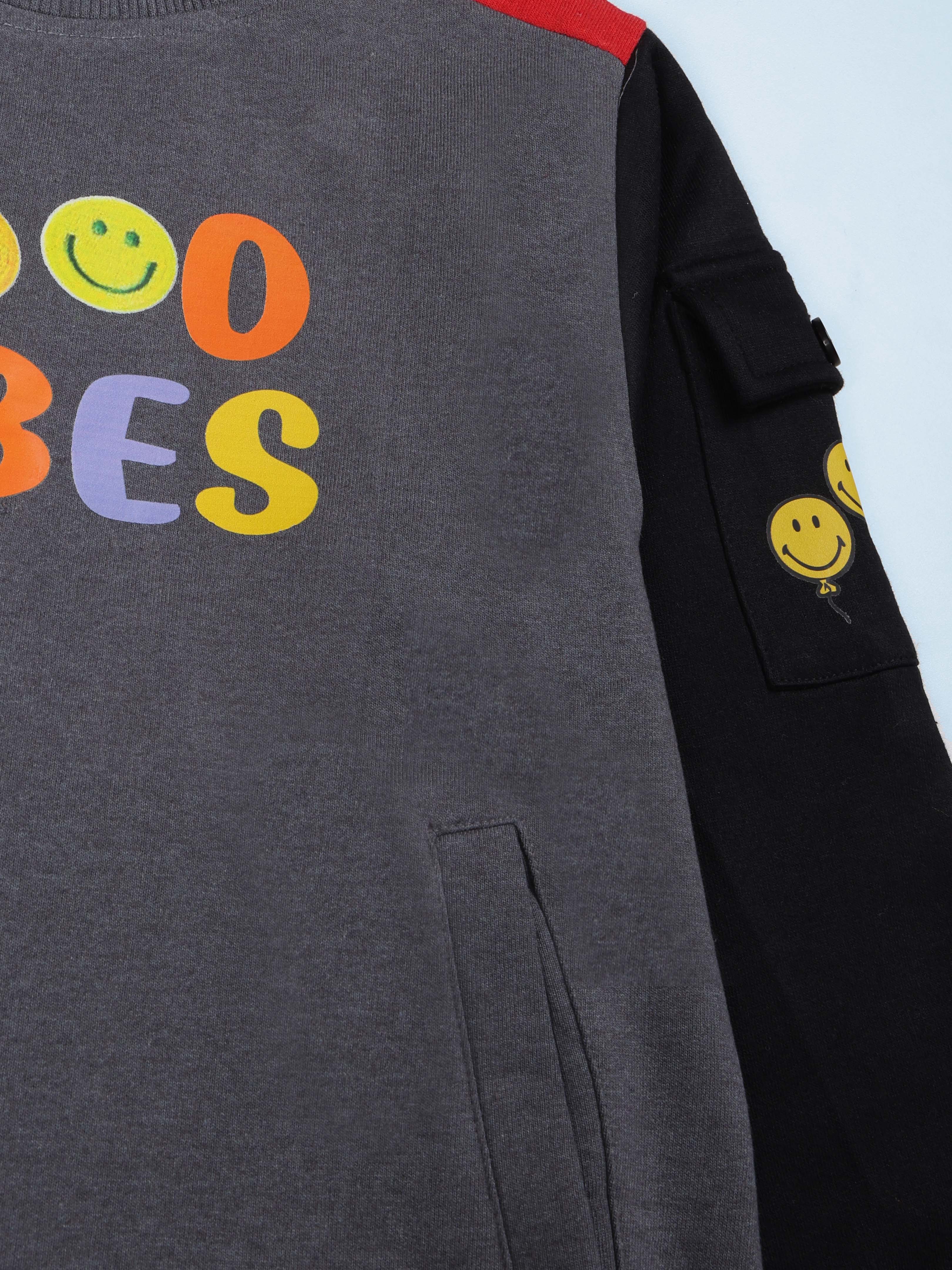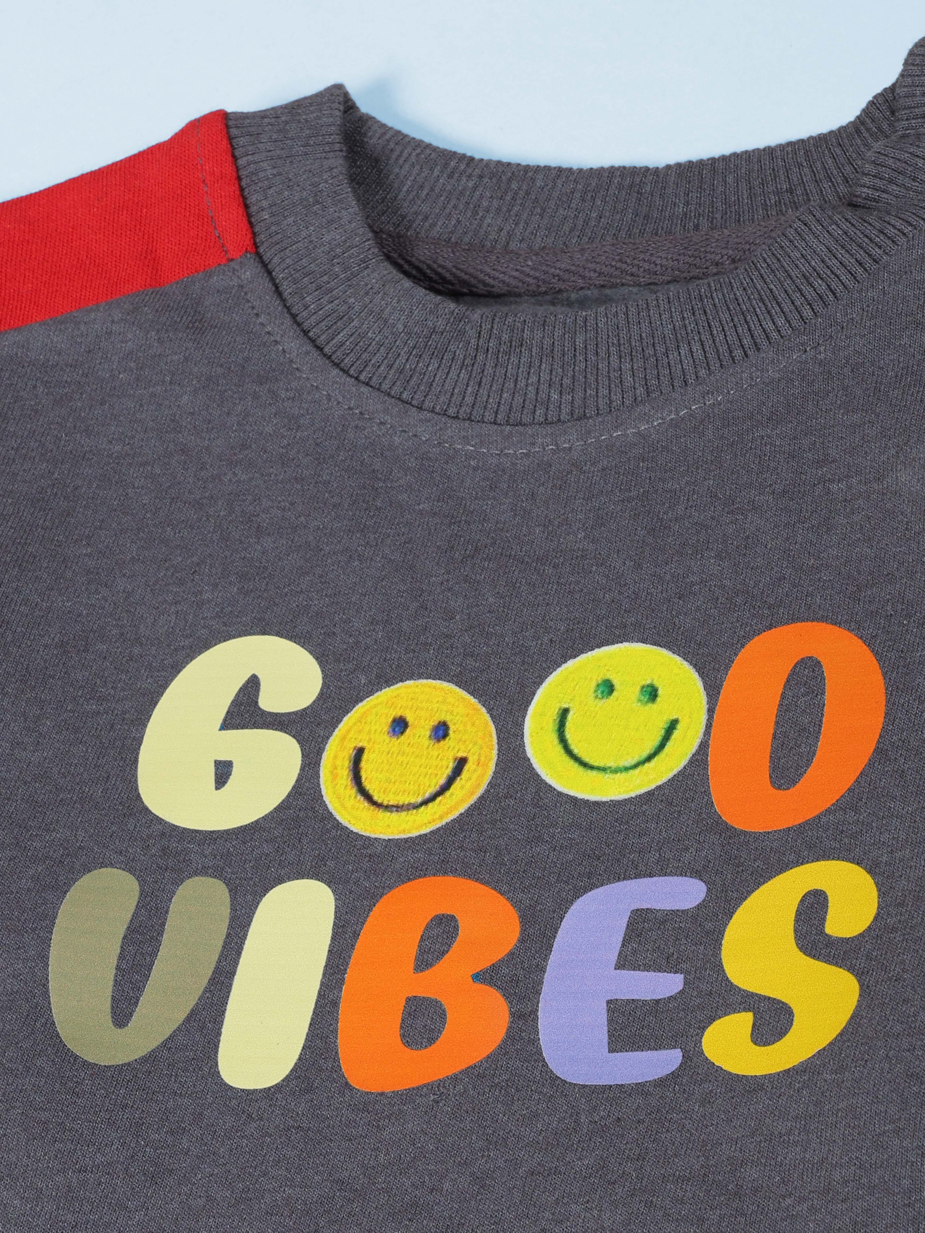 Bring positivity and style to your young champ’s winter wardrobe with this trendy “GOOD VIBES” Fleece Sweatshirt from Kiddopanti. Designed with a cool colour-blocked pattern in grey, black, and a pop of red on the shoulders, this sweatshirt adds both comfort and flair to everyday dressing. The cheerful multi colour “GOOD VIBES” print with smiley icons gives it a fun, energetic touch kids will love. Perfect for school, outings, playtime, or comfy winter days!