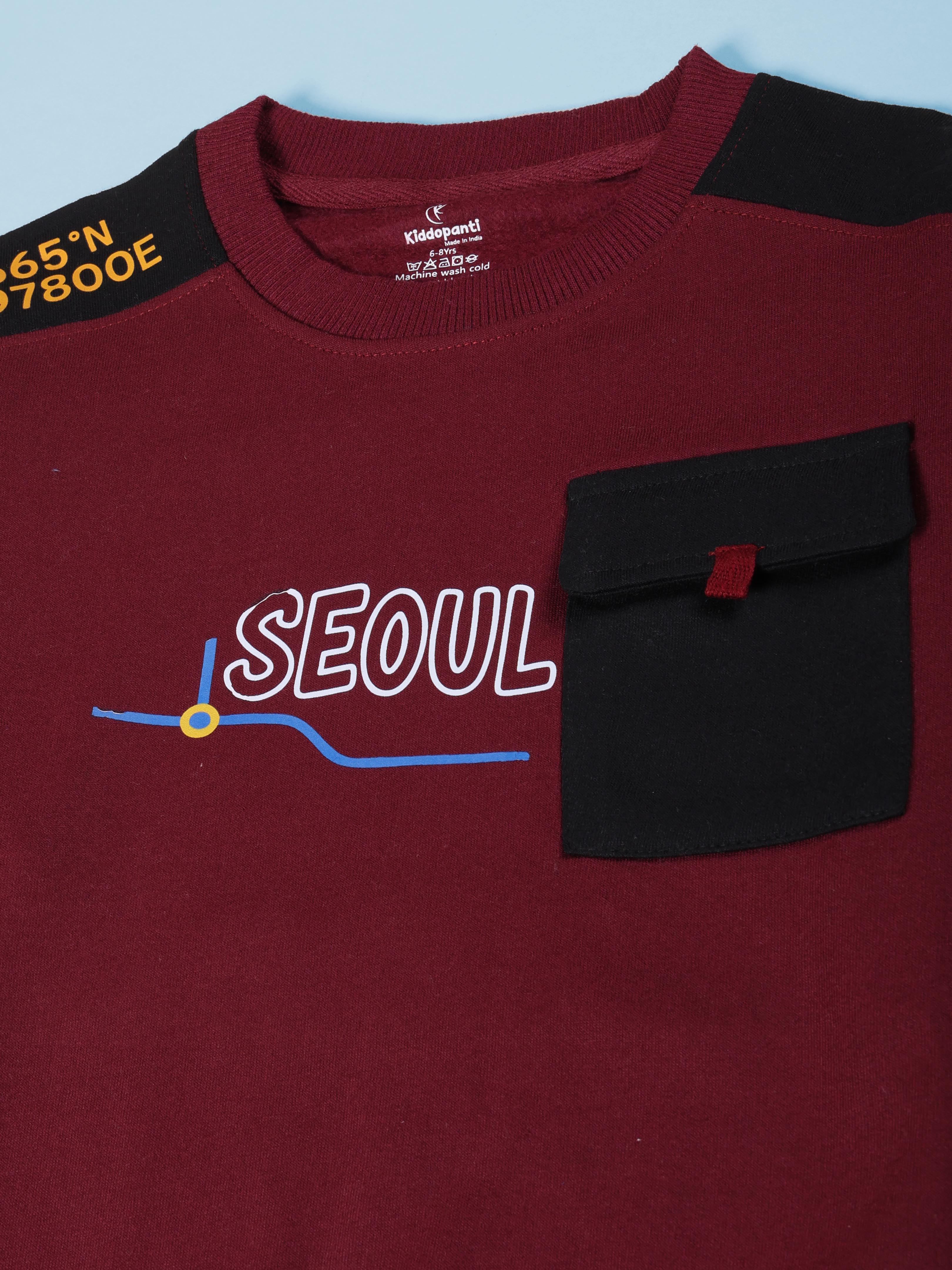 Add a global street-style touch to your little one’s winter wardrobe with this Kiddopanti “Seoul” Travel-Themed Sweatshirt. Designed in a rich maroon colour with contrast dark shoulder panels, this sweatshirt features a modern Seoul city graphic inspired by travel coordinates, giving it a cool urban vibe. The functional flap chest pocket adds a stylish utility element, making it perfect for young explorers who love comfort with character. Crafted from soft fleece fabric, this sweatshirt keeps your child warm and cozy while offering ease of movement for school, playtime, outings, or casual winter days.