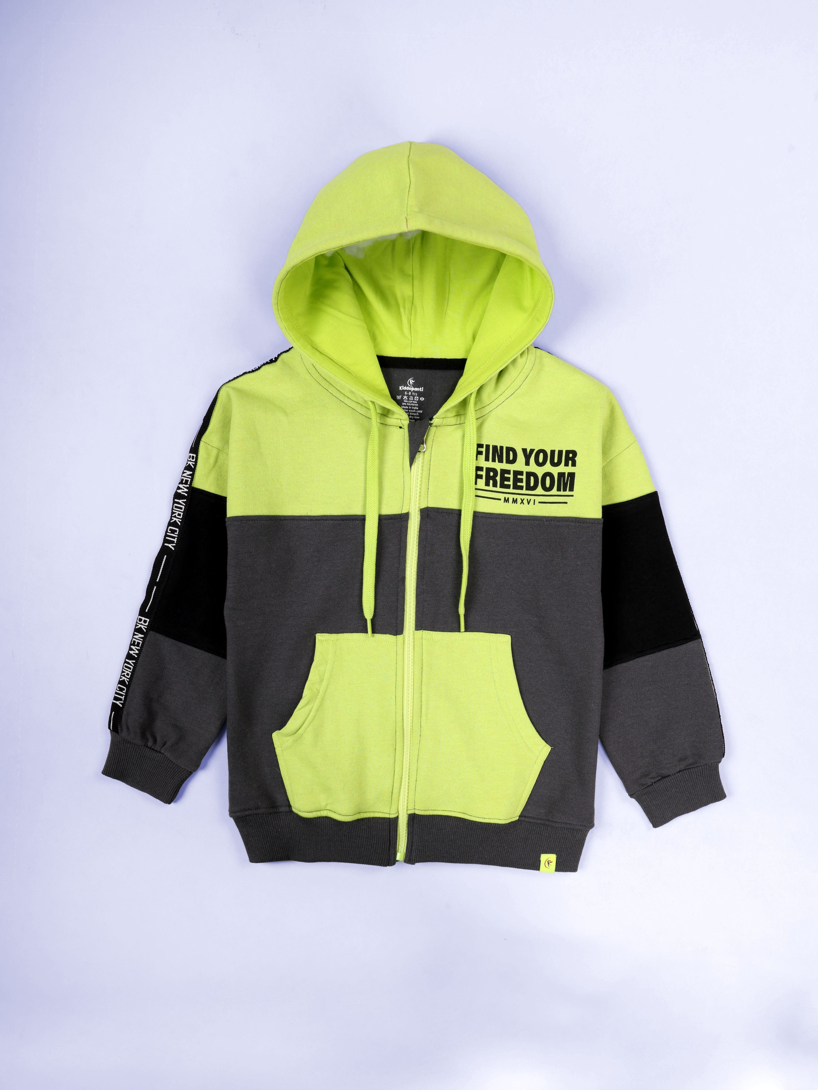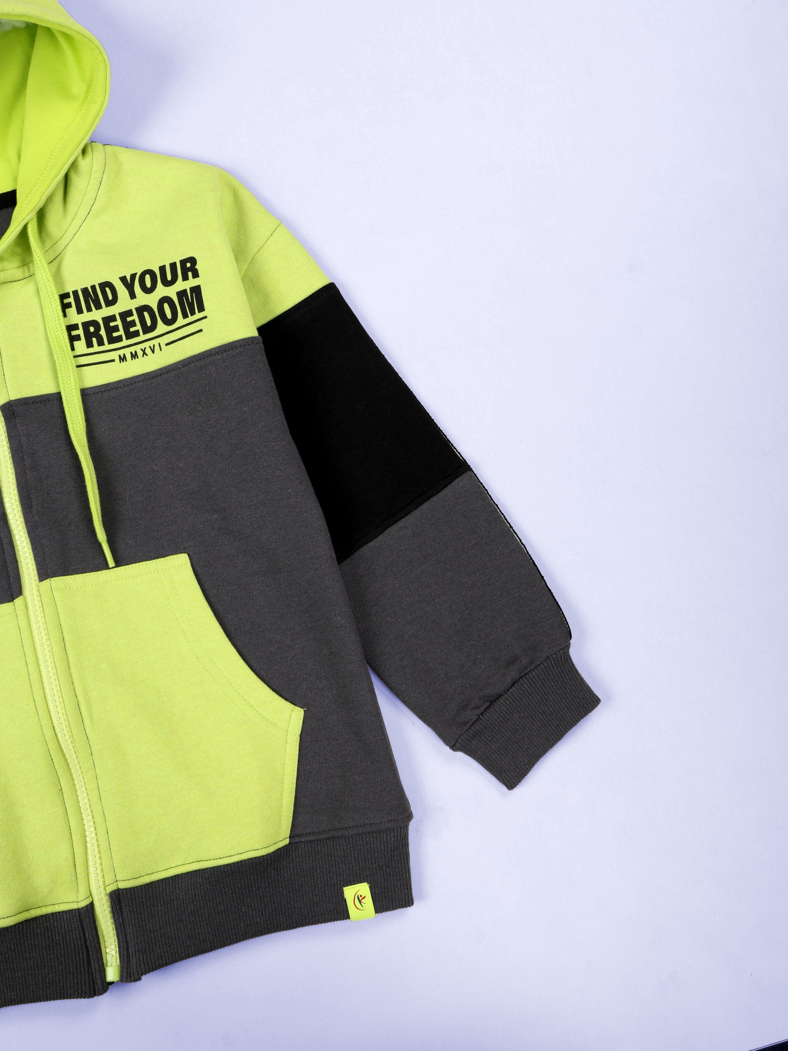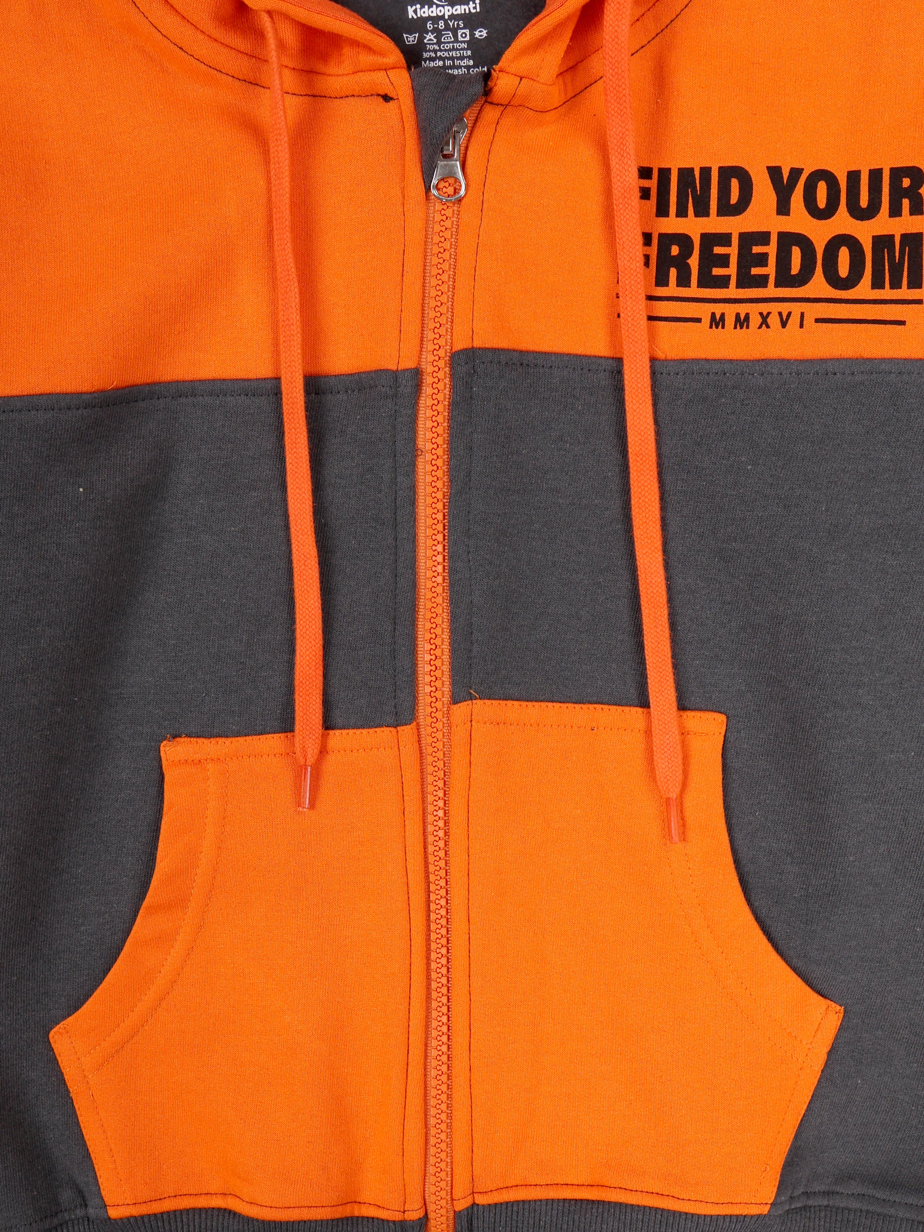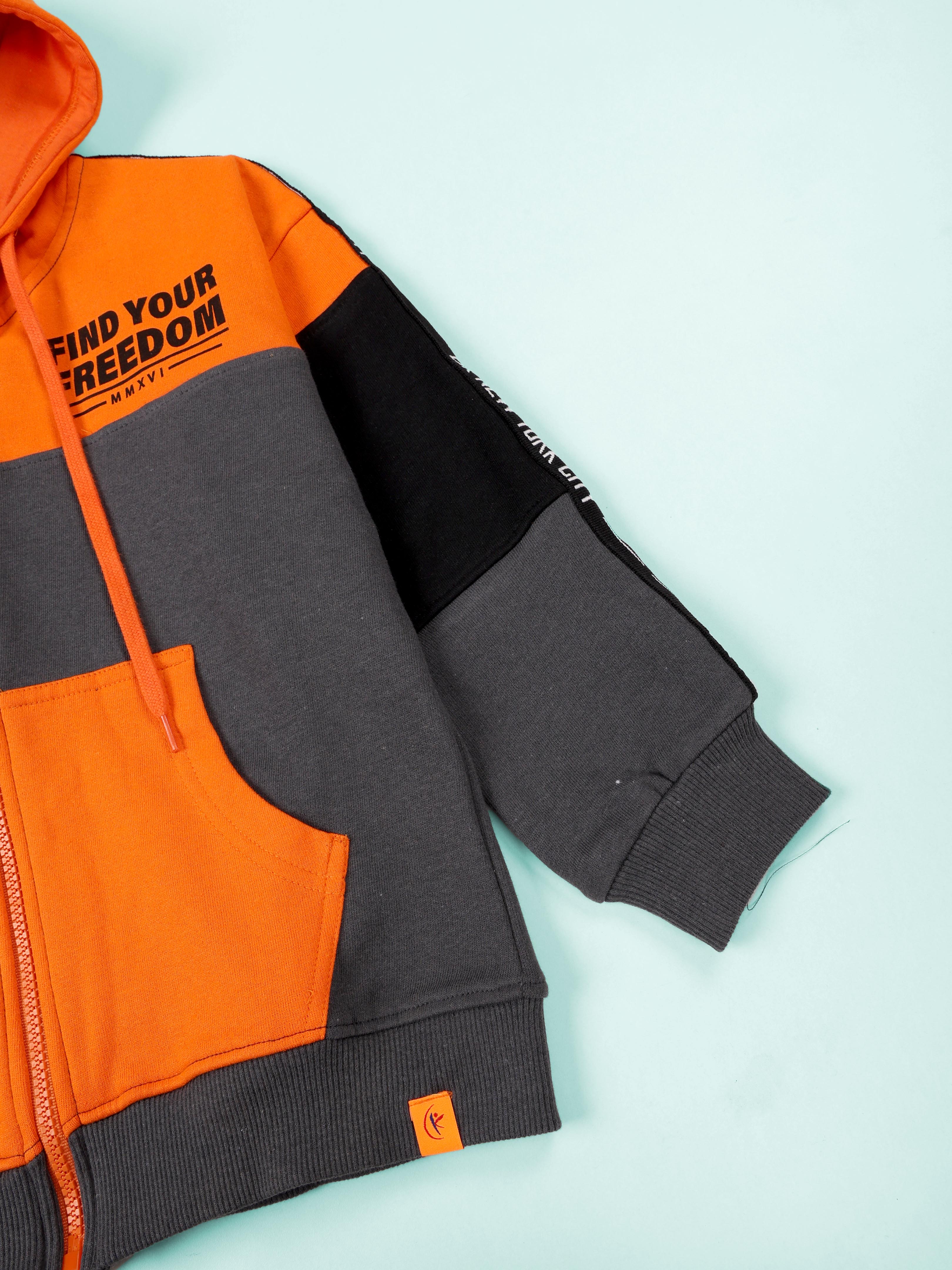 Unleash your little rebel’s style with the bold and energetic "Find Your Freedom" hoodie from Kiddopanti. Designed in an eye-catching colorblock pattern combining vibrant orange, cool grey, and classic black, this hoodie is a perfect blend of statement-making fashion and everyday comfort. The front features a motivational chest print that reads “Find Your Freedom,” encouraging self-expression and confidence. Stylish branded taping on the sleeves adds a sporty, trendy edge, making it a standout piece for school days, weekend outings, or casual play. Crafted in a soft fleece knit, the hoodie ensures all-day warmth and coziness. With its full front zipper, practical kangaroo pockets, and ribbed cuffs and hem, it’s both functional and fashion-forward.