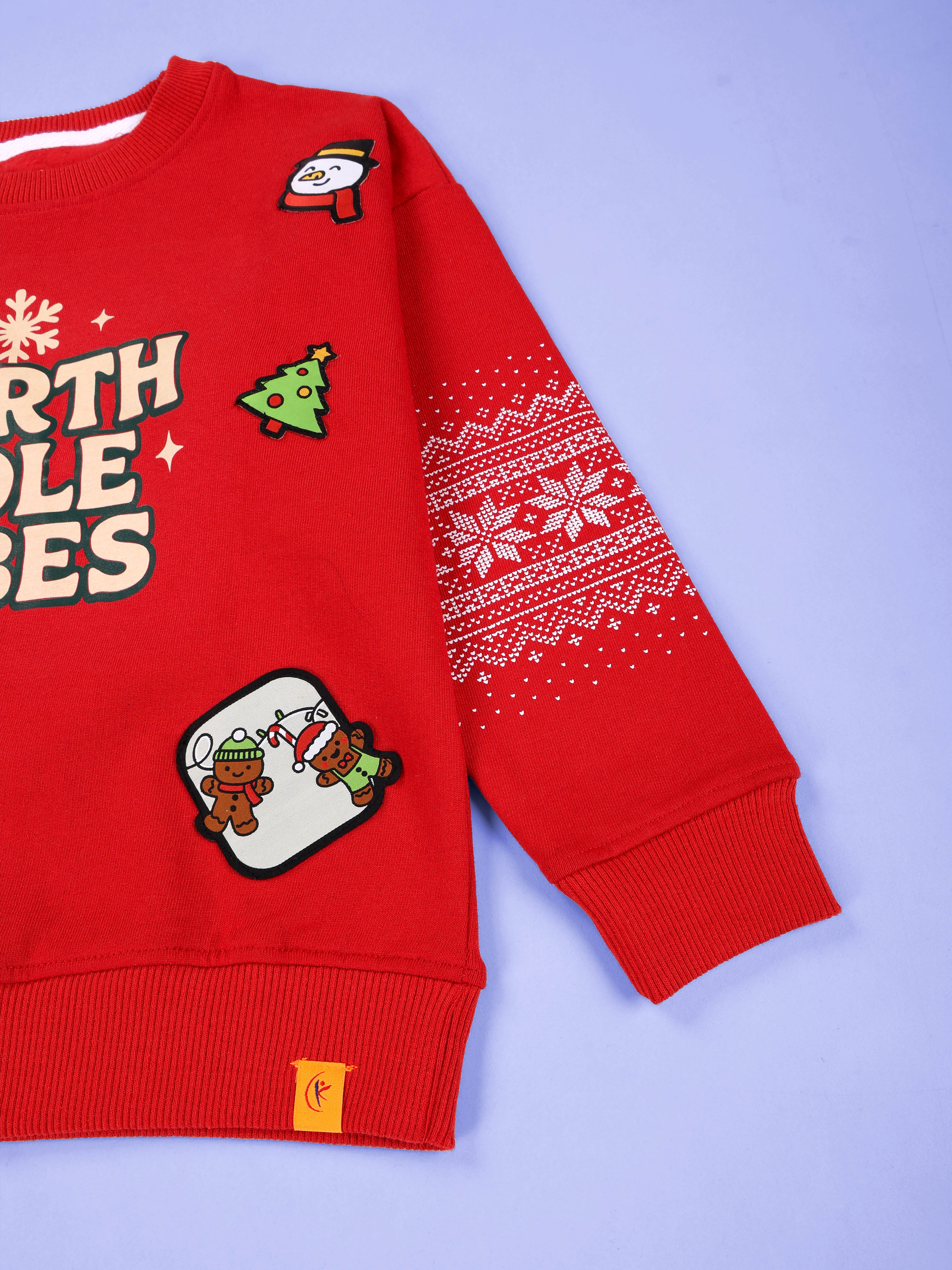 Kiddopanti brings winter warmth with a festive twist in this bright red fleece sweatshirt. Featuring subtle Nordic-inspired patterns on the sleeves, this piece is perfect for cozy family outings, holiday photos, or chilly school days. Made with soft fleece and finished with thoughtful details, it offers both seasonal charm and all-day comfort for your little one.