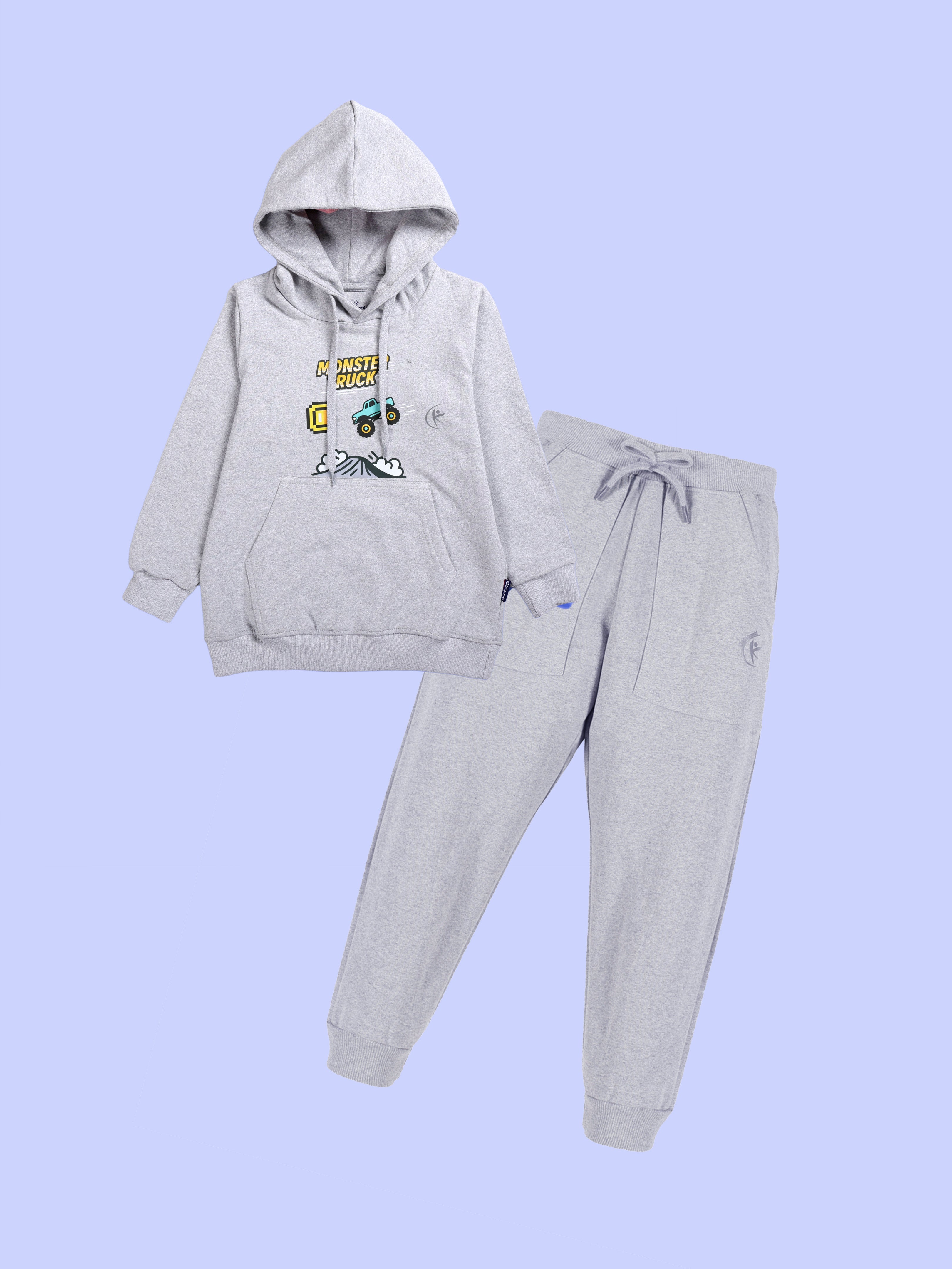 Boys Cotton Fleece Full Sleeve Hooded Sweatshirt With Monster Truck themed Prints & Fleece Track Pant Set