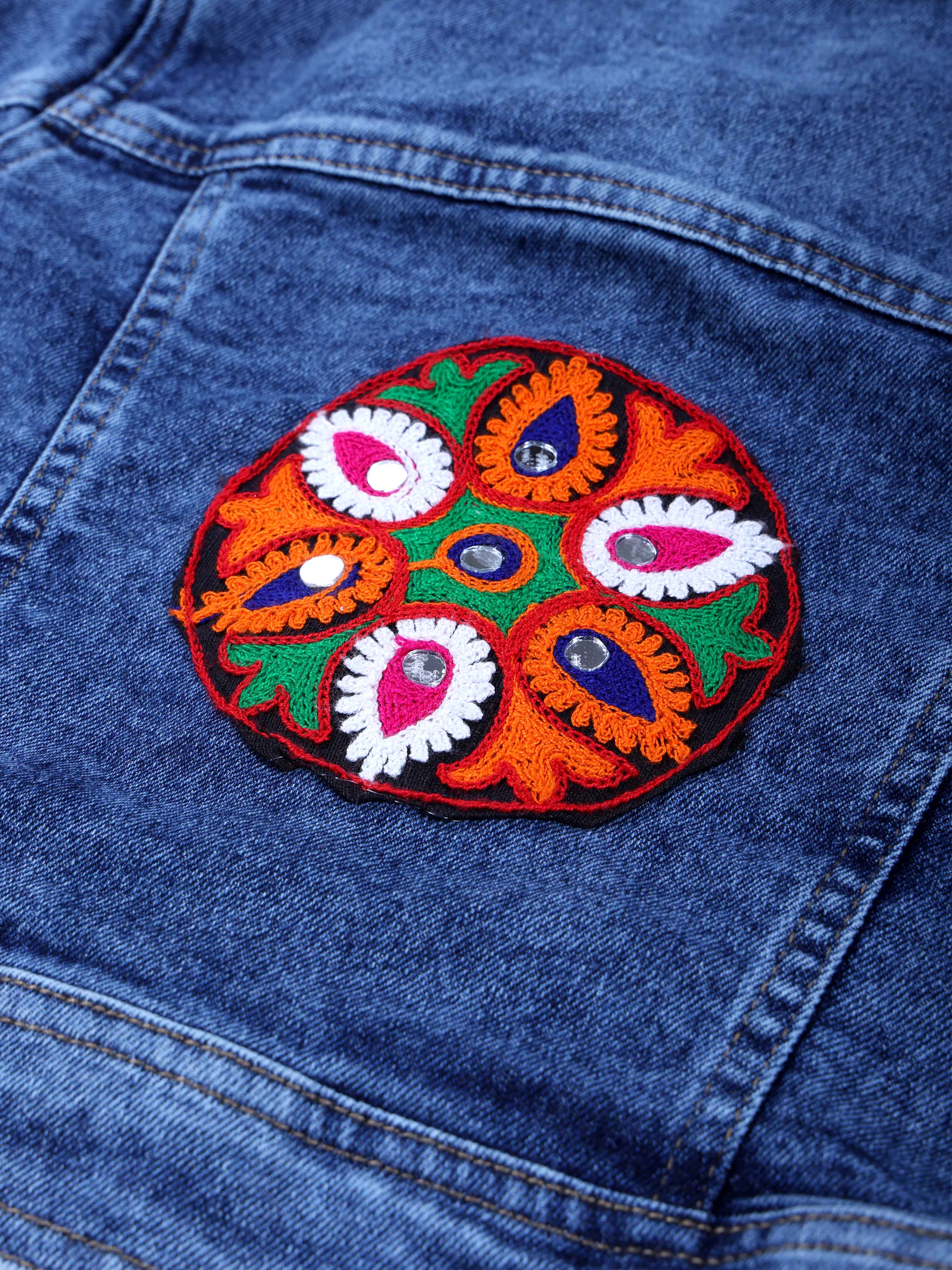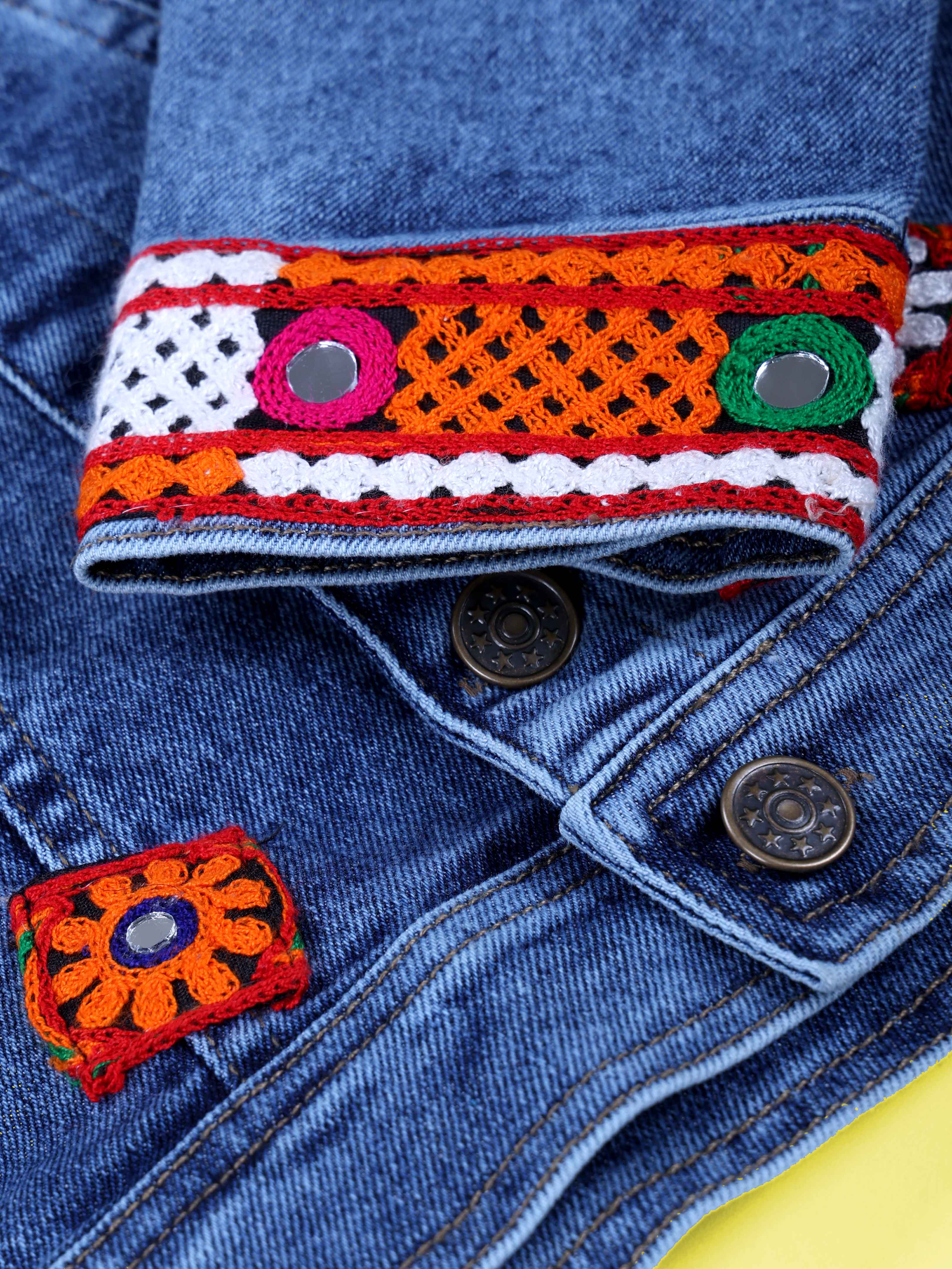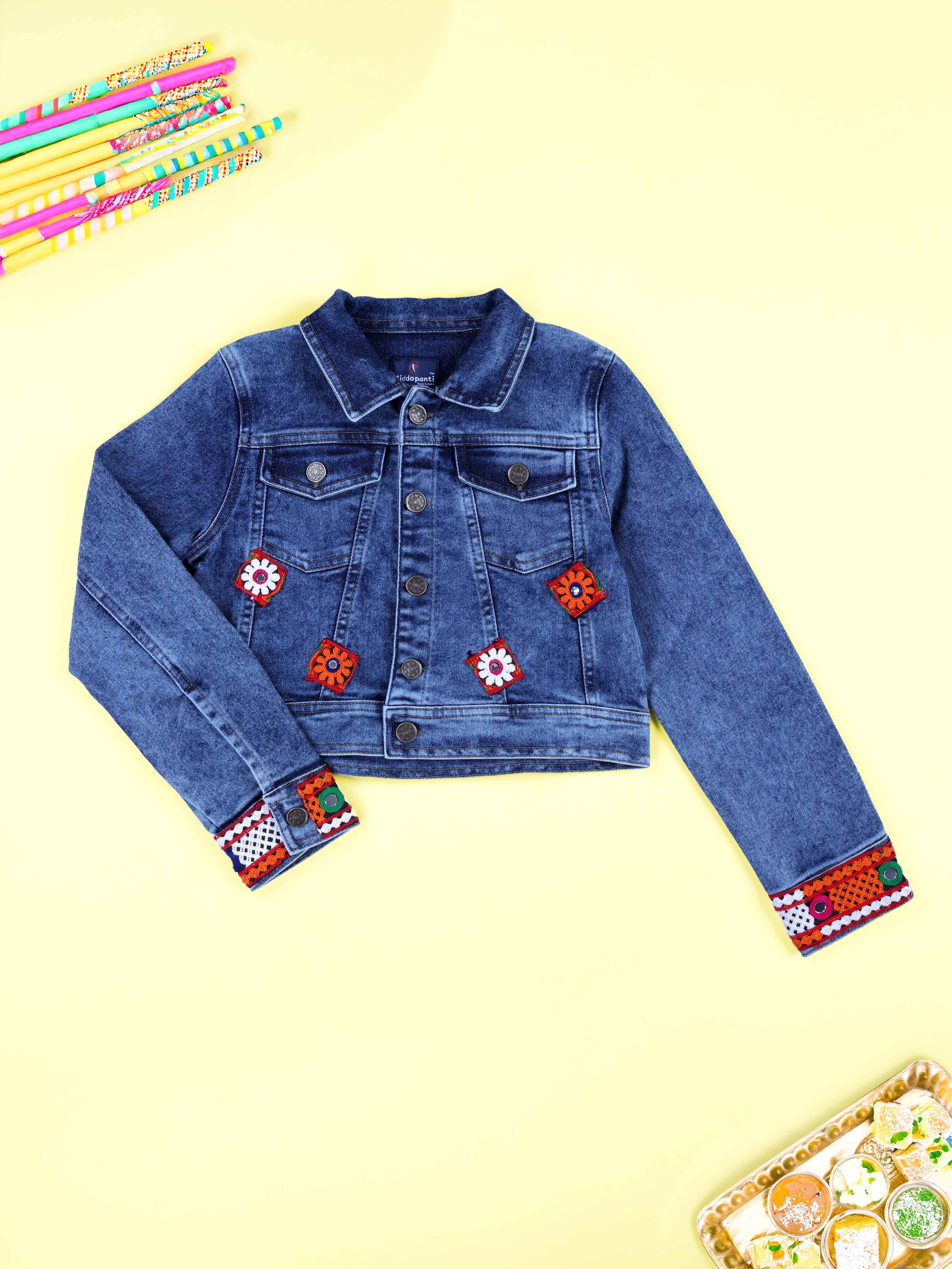 KiddoPanti Girls Ethnic Lace Full Sleeve Crop Length Denim Jacket