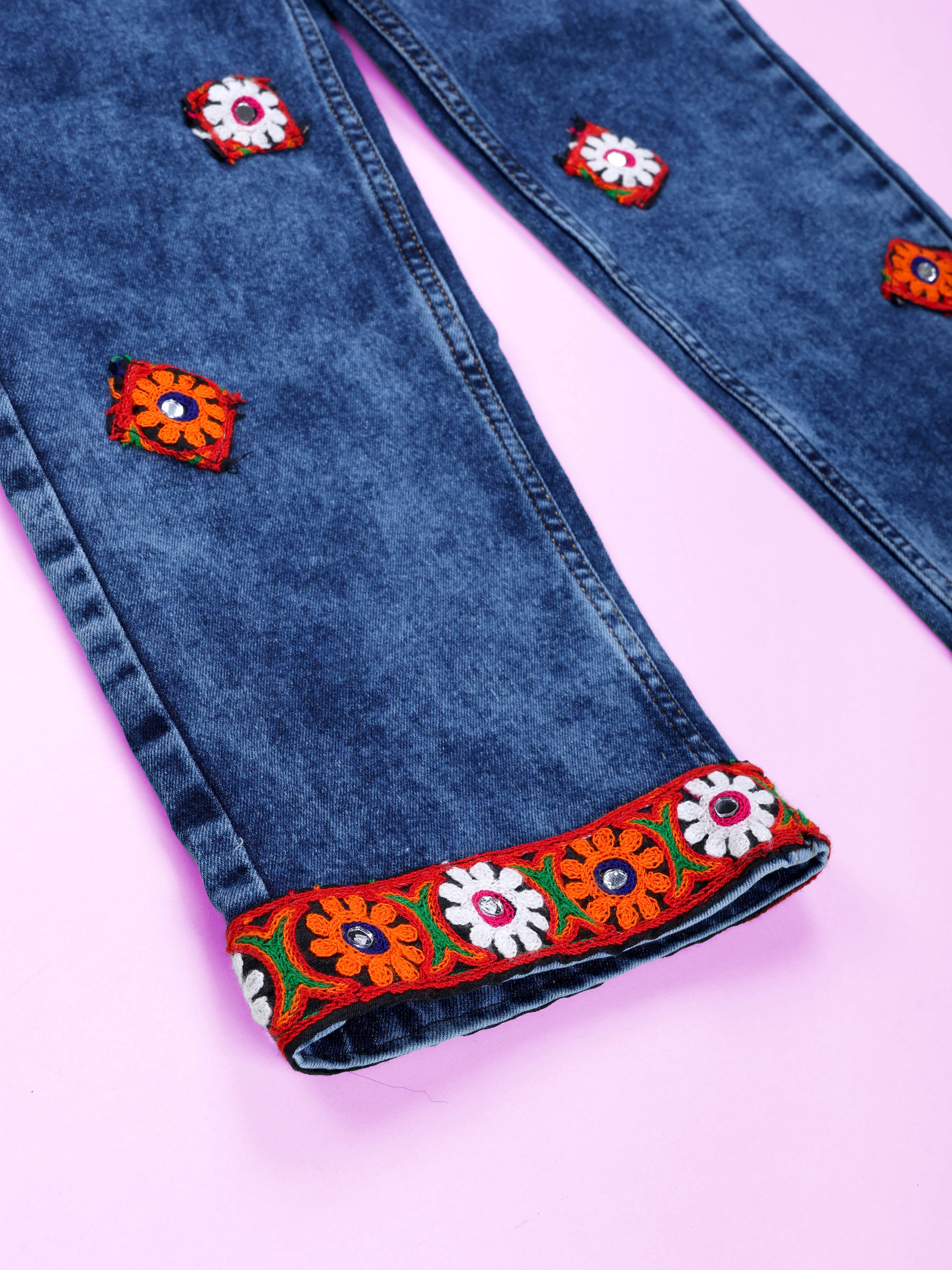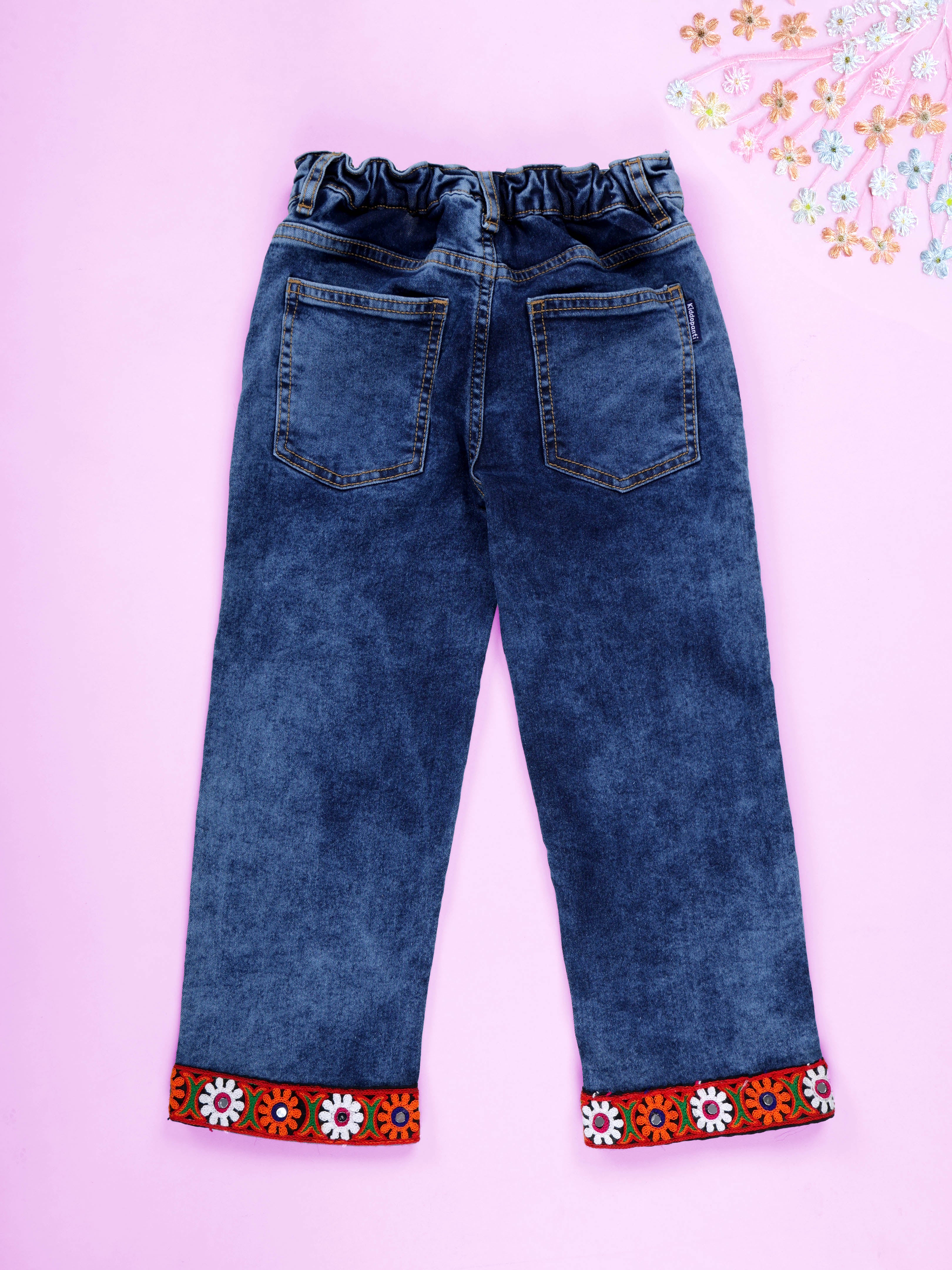Kiddopanti Girls Denim Woven Ethnic Lace Straight Fit Solid Jeans