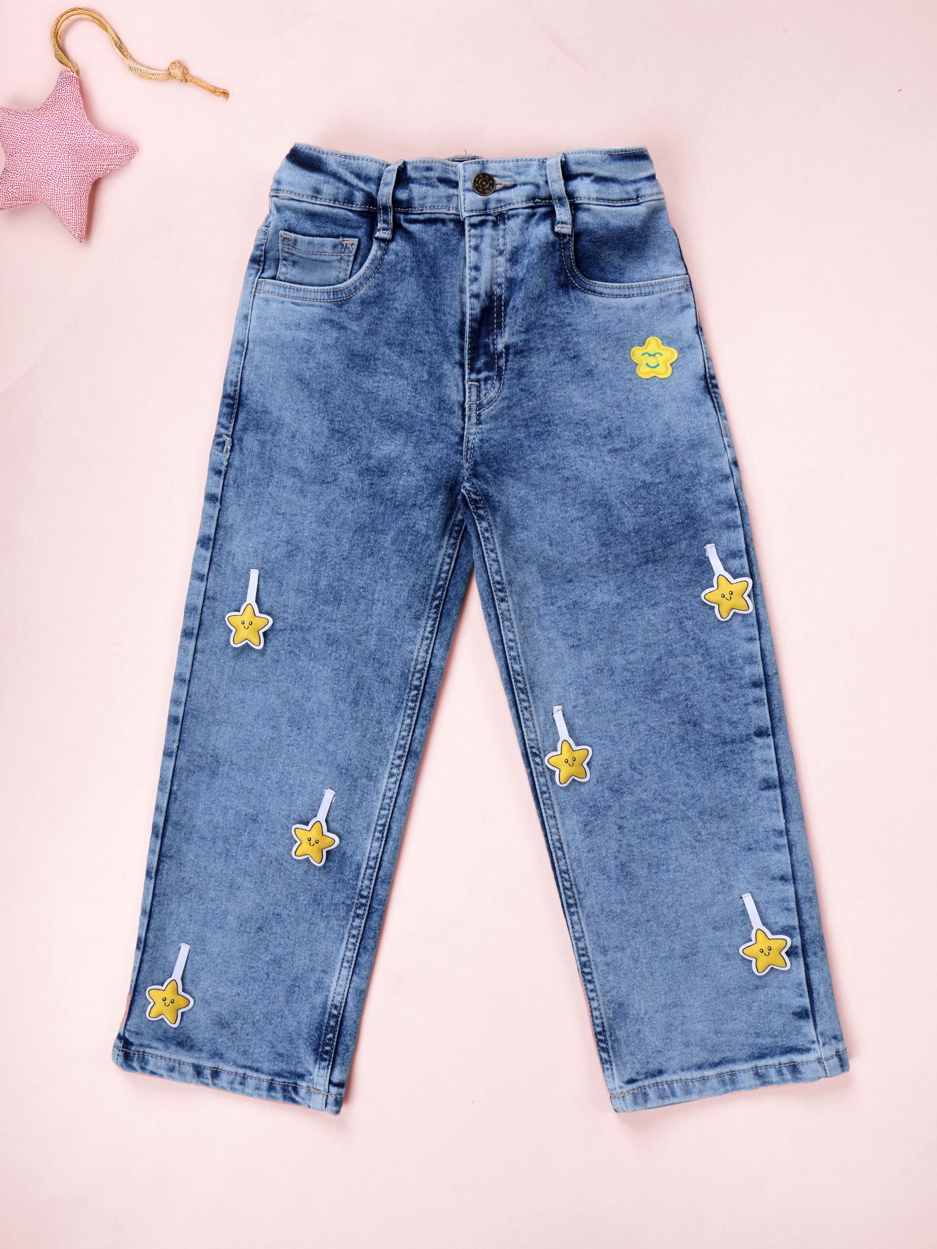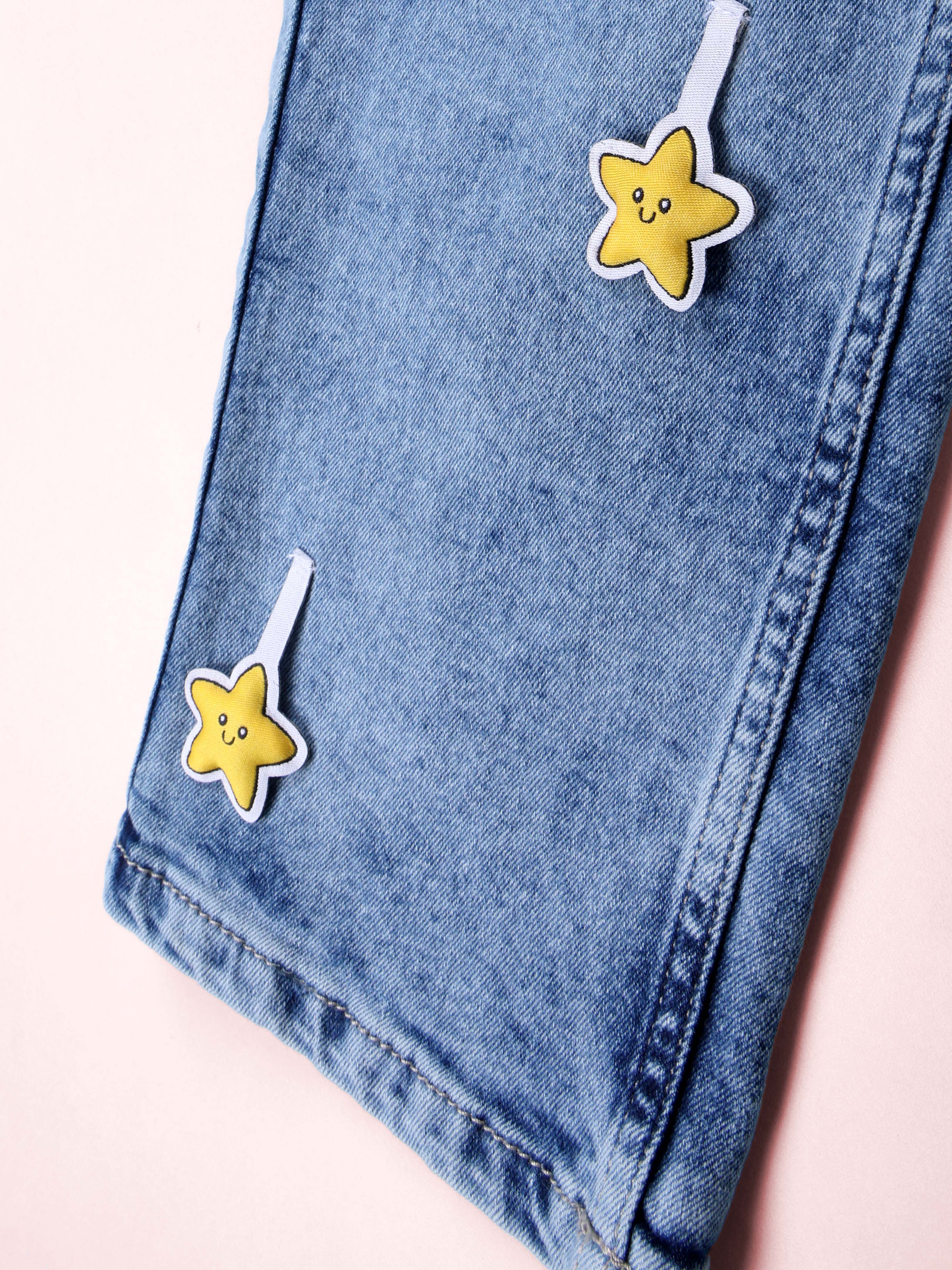 Stylish faded blue wash with standout yellow star badges & puff appliqués