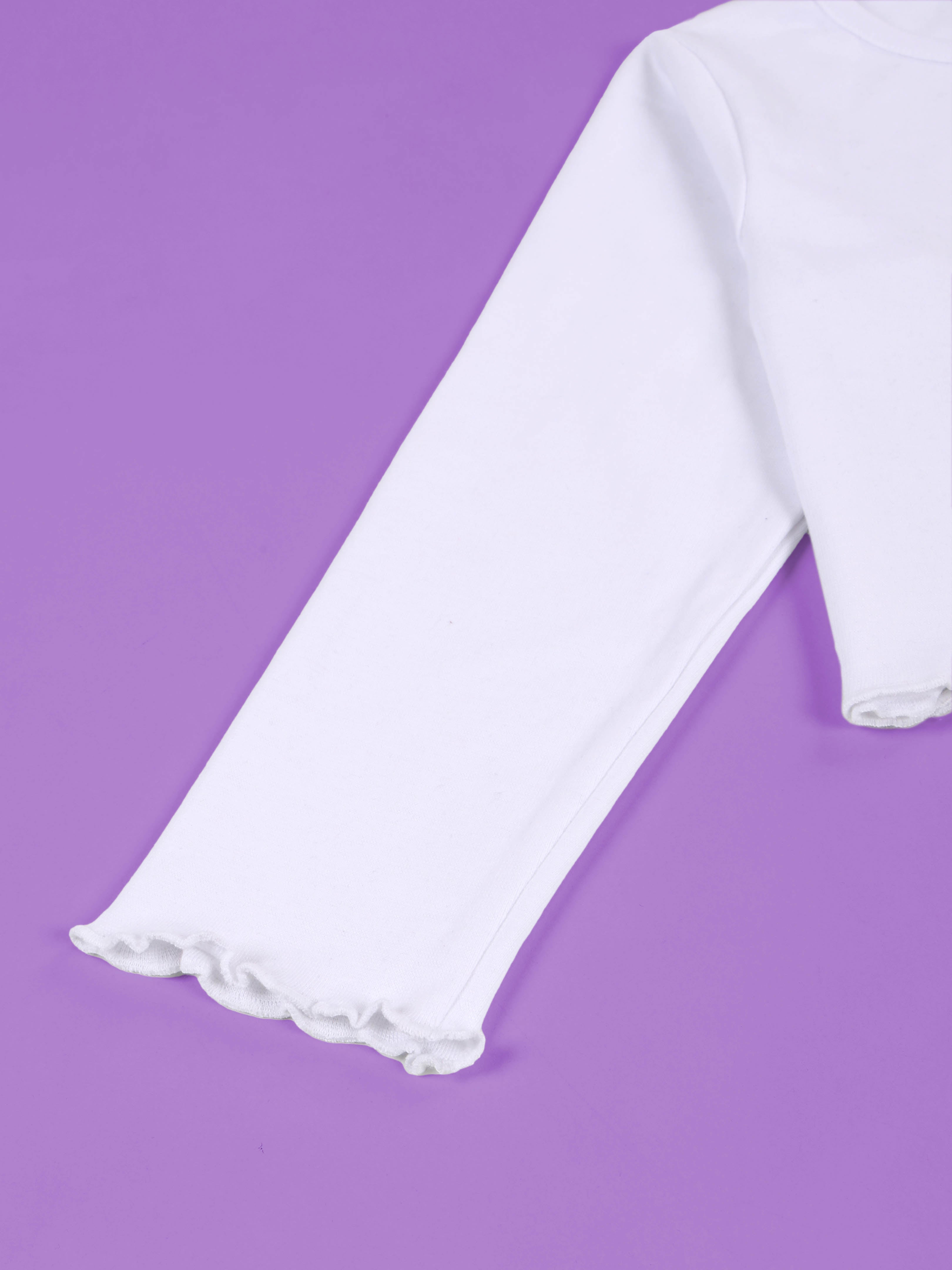 Trendy lettuce-edge hem at waist and sleeves for a stylish, youthful finish