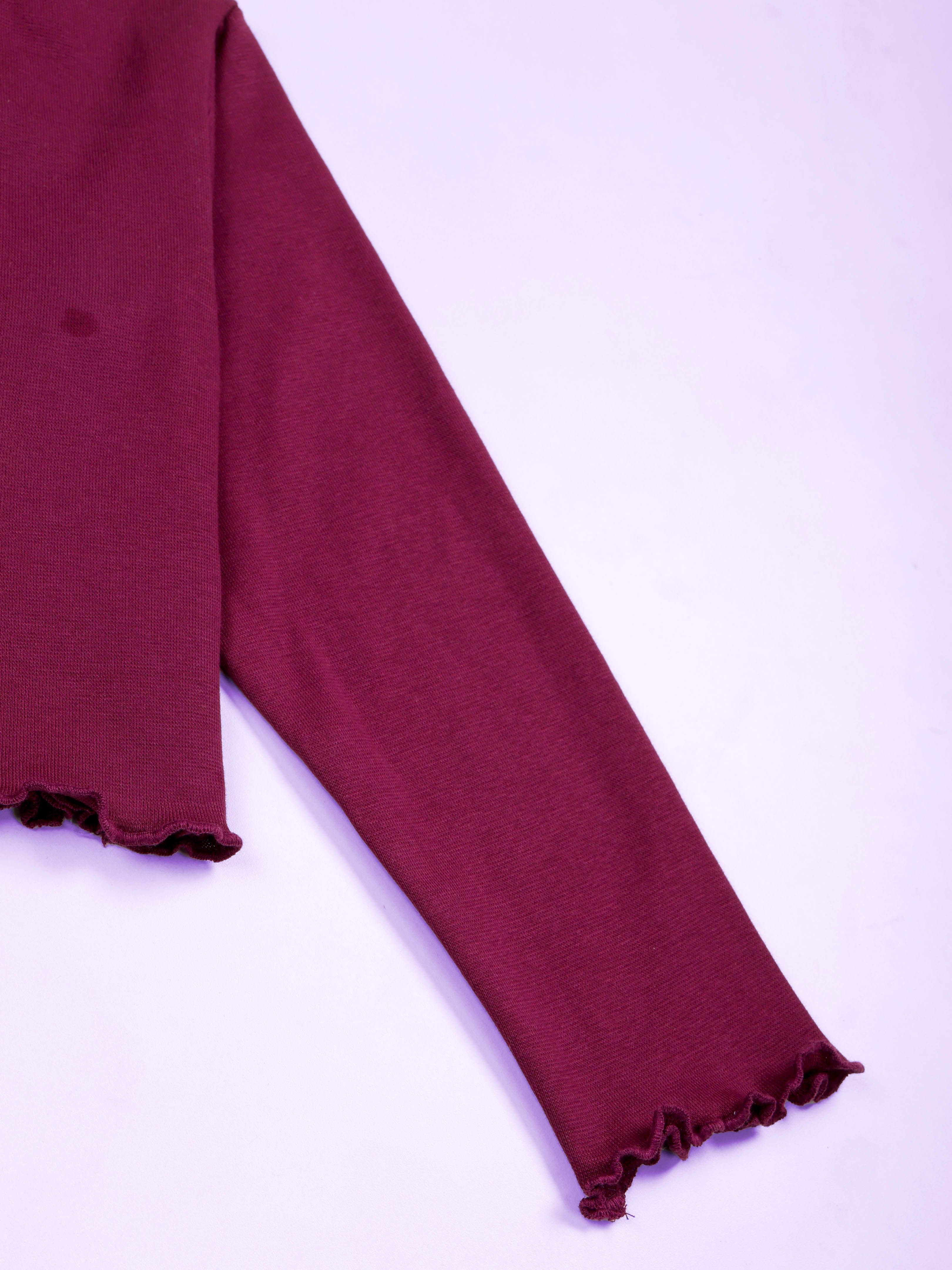 Add playful charm to her everyday style with this Girls Bunny Applique Ribbed Crop Tee. Designed in a trendy wine color, this crop top is made from soft rib knit fabric for all-day comfort. The highlight is the adorable blue gingham bunny applique with a sparkly sequin bow, giving it a fun and fashionable twist. The lettuce-edge hem at the waist adds extra flair, making it perfect for pairing with jeans, joggers, or skirts. A chic yet comfortable piece for school, outings, or casual wear.