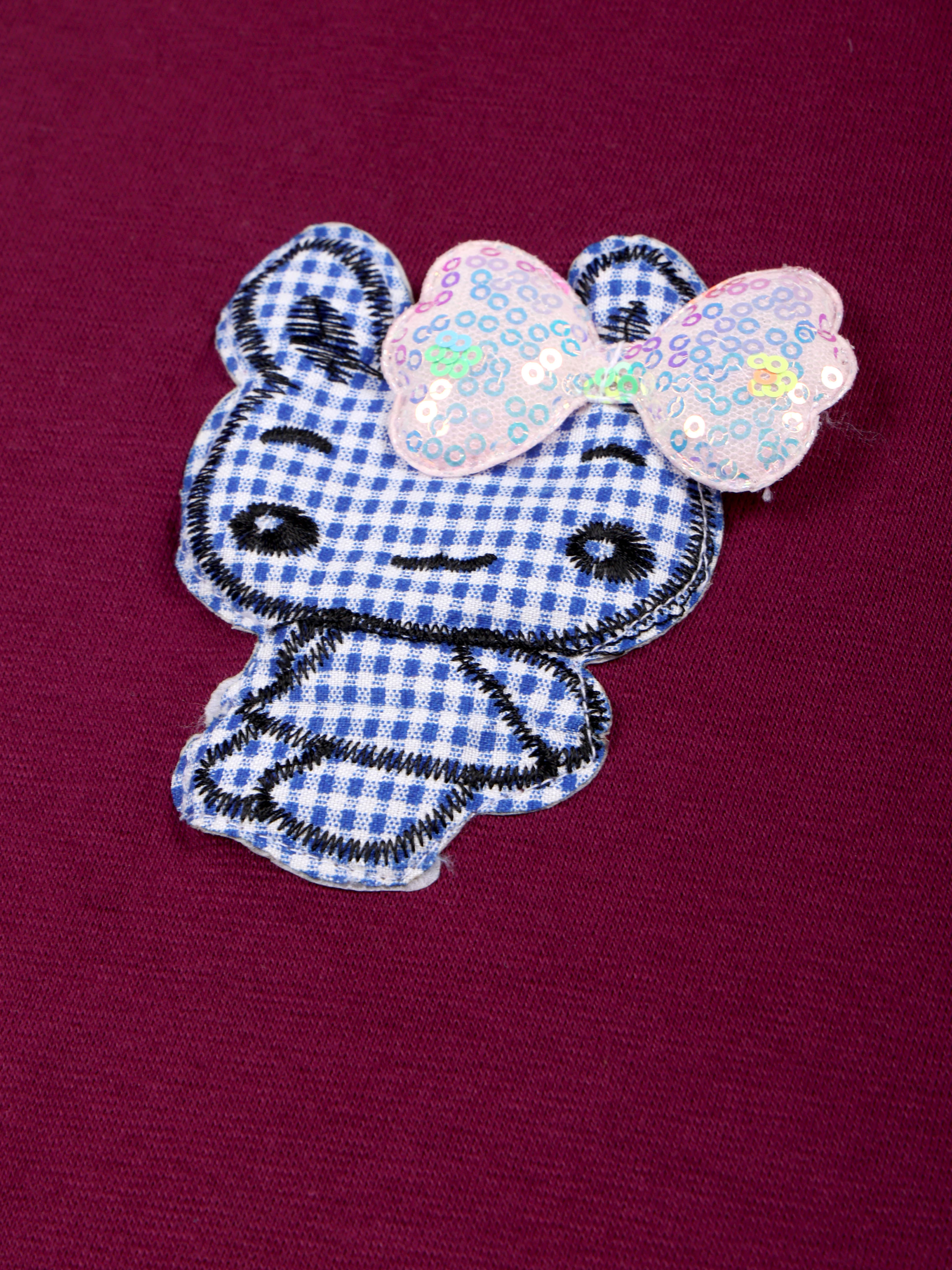 Adorable gingham bunny applique with sequin bow for a playful finish