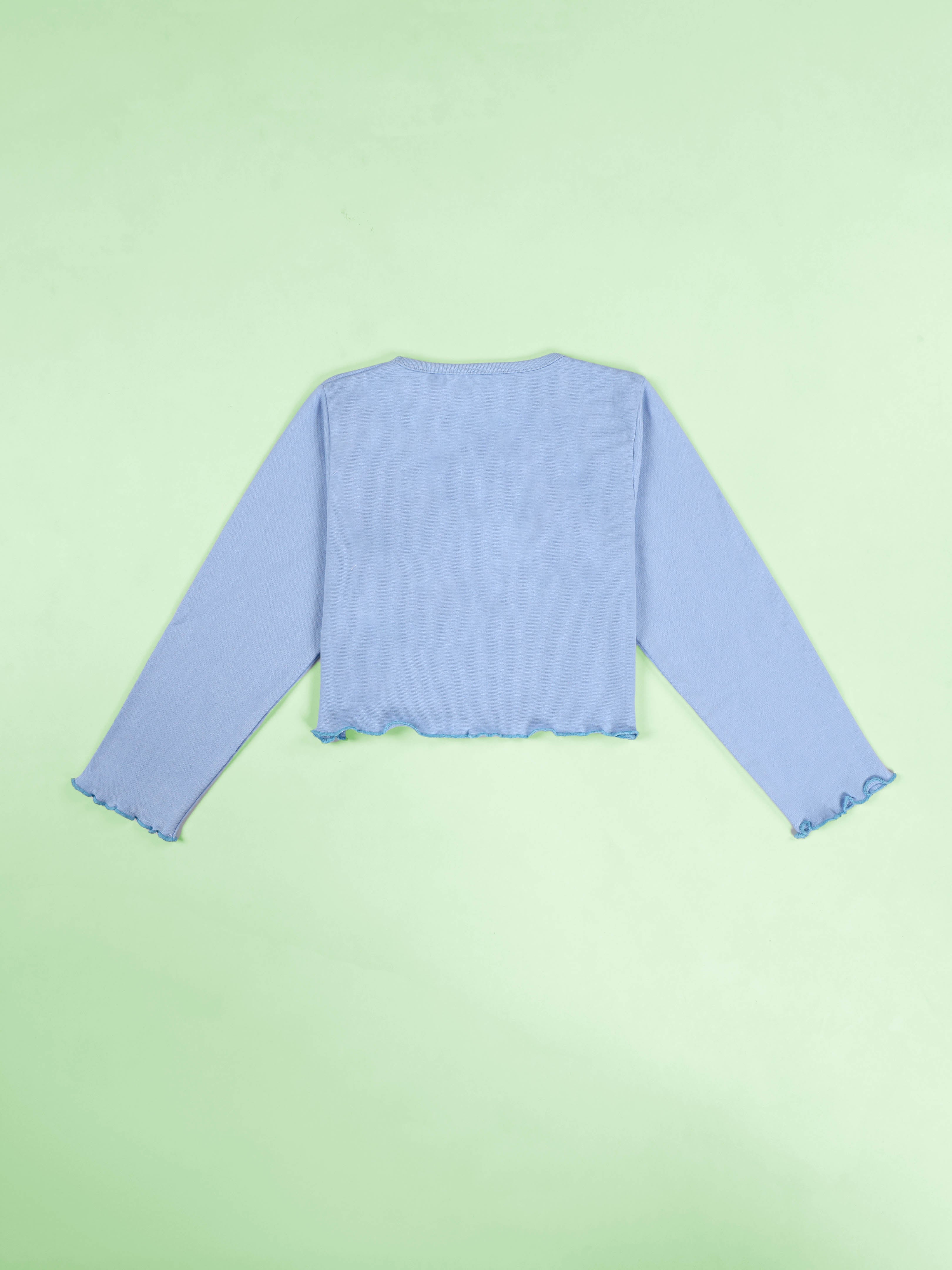 Trendy lettuce-edge hem at waist and sleeves for a stylish, youthful finish