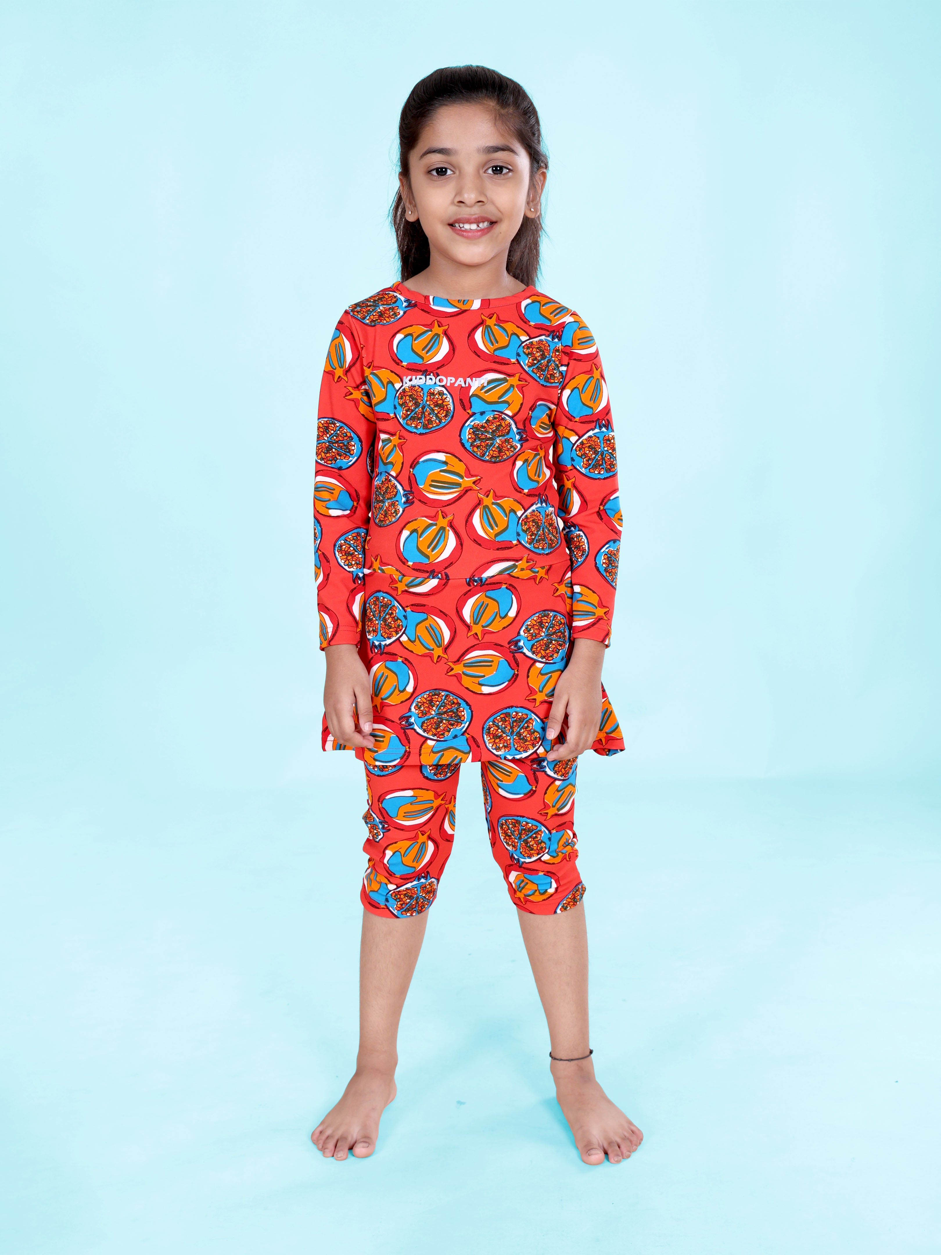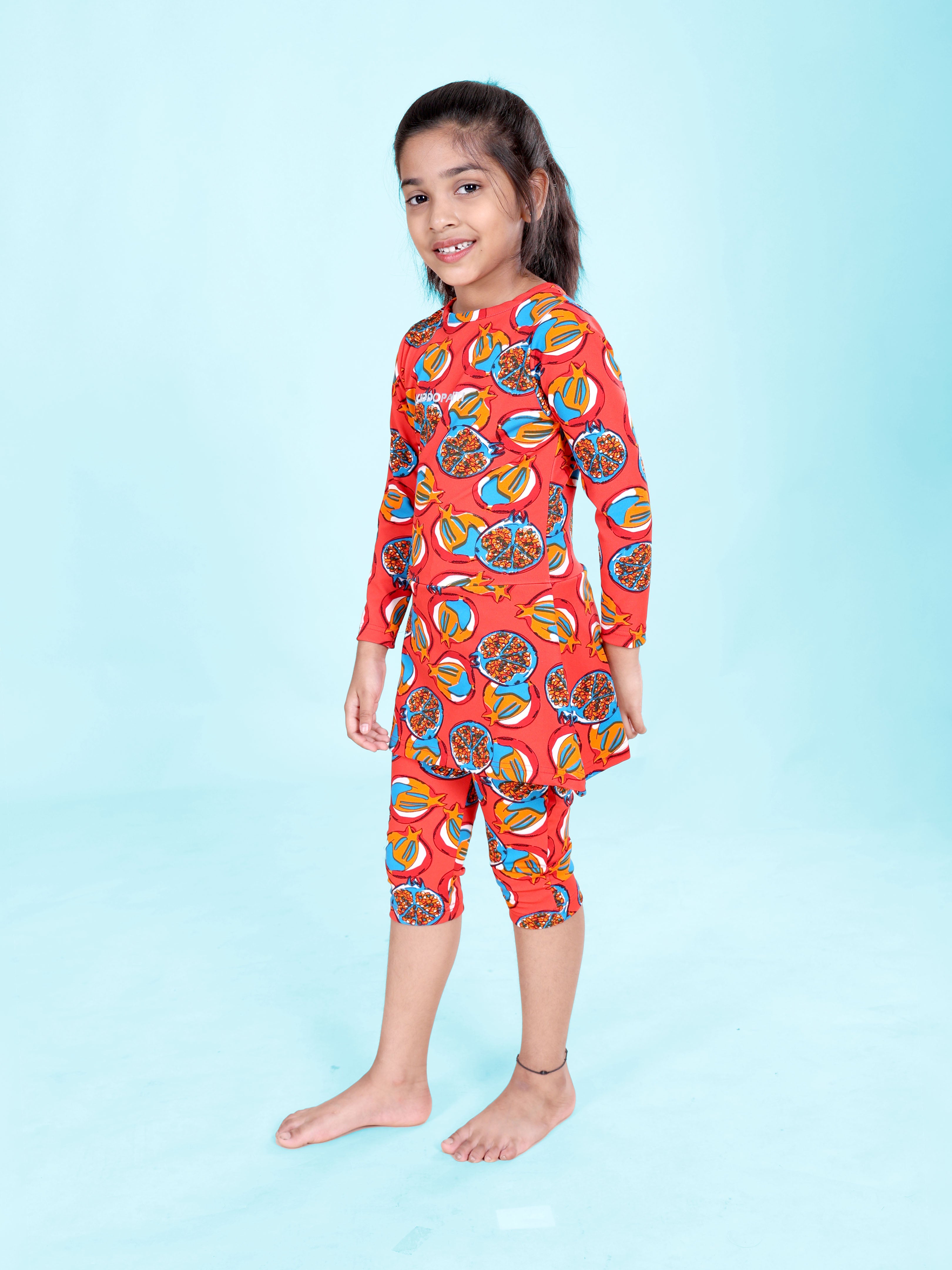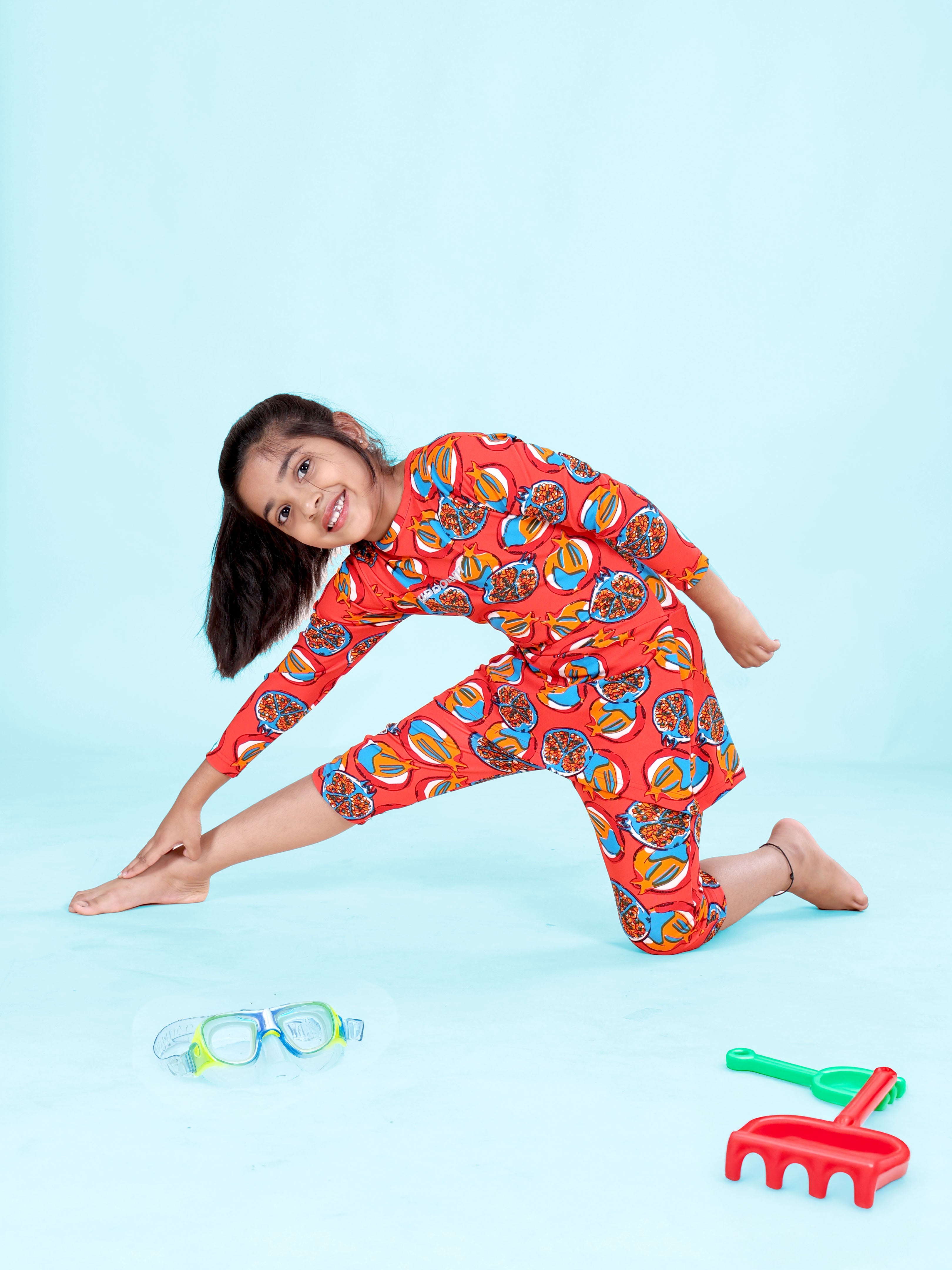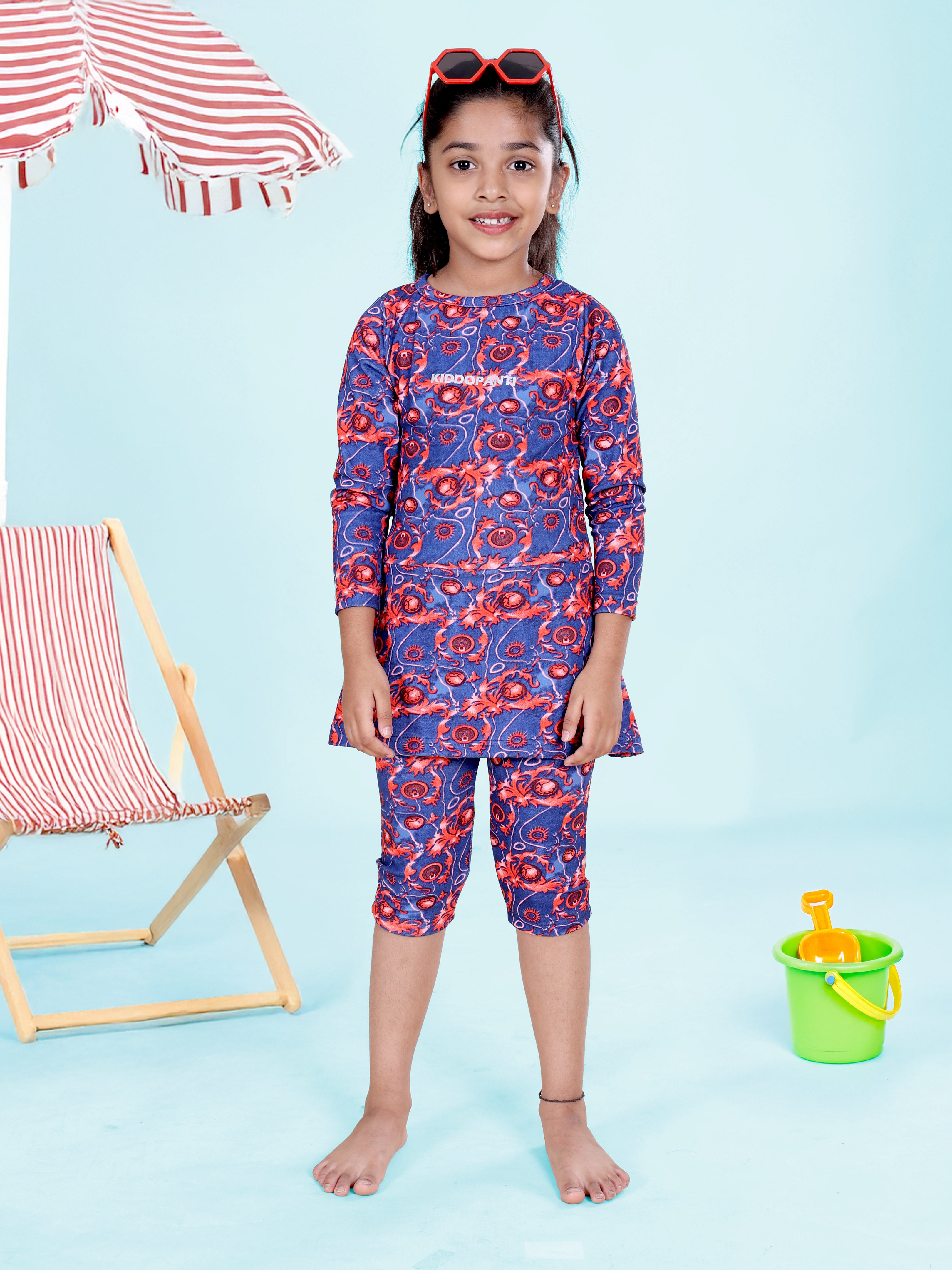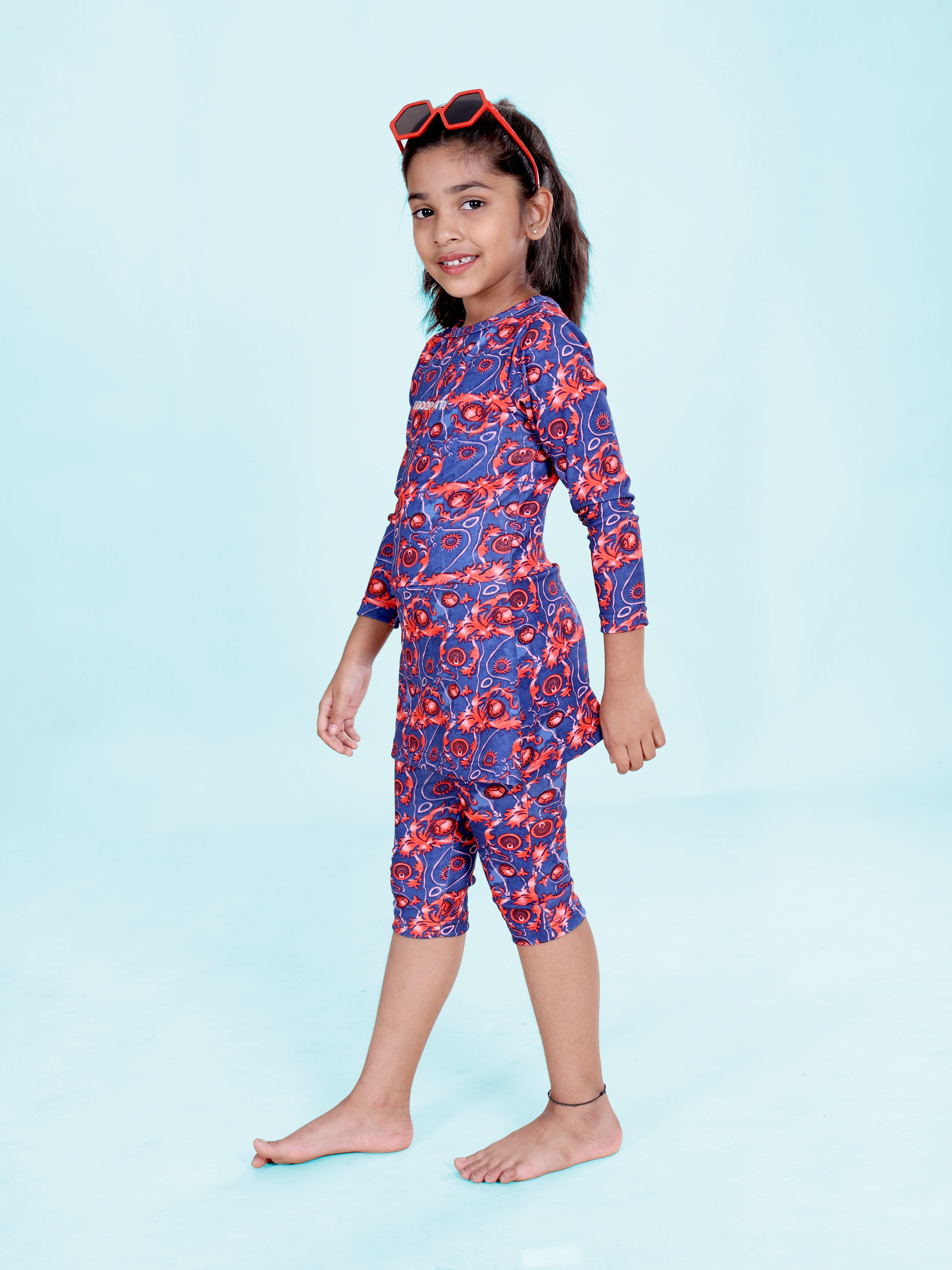 Girls Full Sleeves All Over Printed One Piece With Jammer Swim Dress
