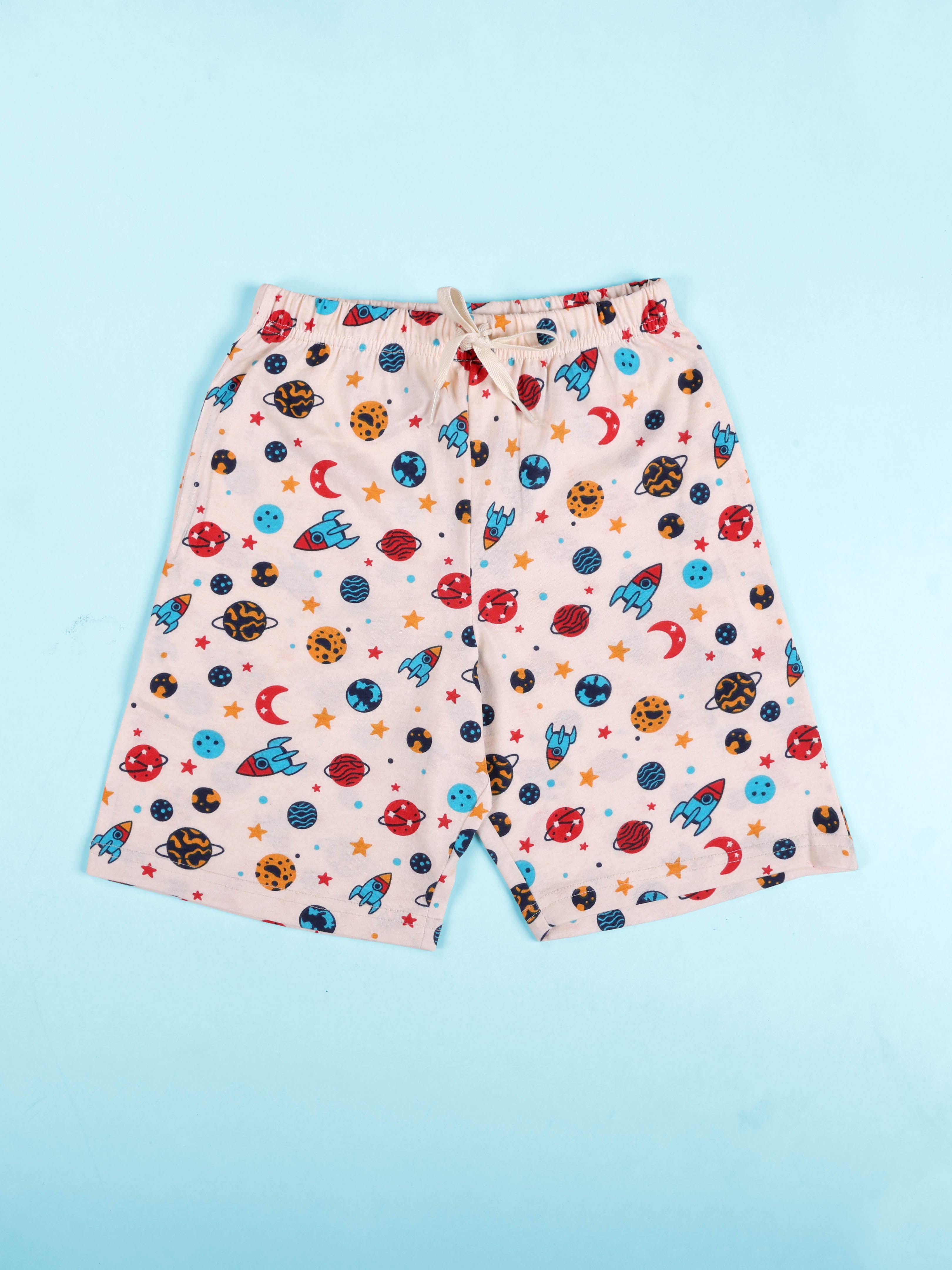 Kiddopanti brings to you a fun and functional Pack of 2 All-Over Printed Shorts, designed to keep your little one comfortable, active, and stylish all day long. Crafted for everyday adventures, these shorts feature playful graphic prints and vibrant colours that add energy and personality to casual wear. Made from soft, breathable cotton knit fabric, these shorts feel gentle on the skin and allow easy movement—perfect for playtime, travel, lounging at home, or outdoor fun. The elasticated waistband with a functional drawcord ensures a secure yet adjustable fit, making them easy to wear and ideal for growing kids. With a comfortable knee-length silhouette and practical front pockets, this value pack delivers comfort, durability, and style in one versatile combo.